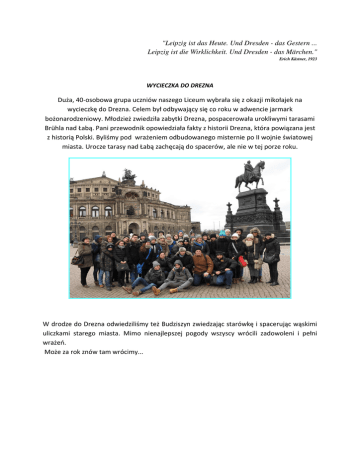 "Leipzig ist das Heute. Und Dresden - das Gestern ... Leipzig ist die Wirklichkeit. Und Dresden - das Märchen." Erich Kästner, 1923 WYCIECZKA DO DREZNA Duża, 40-osobowa grupa uczniów naszego Liceum wybrała się z okazji mikołajek na wycieczkę do Drezna. Celem był odbywający się co roku w adwencie jarmark bożonarodzeniowy. Młodzież zwiedziła zabytki Drezna, pospacerowała urokliwymi tarasami Brühla nad Łabą. Pani przewodnik opowiedziała fakty z historii Drezna, która powiązana jest z historią Polski. Byliśmy pod wrażeniem odbudowanego misternie po II wojnie światowej miasta. Urocze tarasy nad Łabą zachęcają do spacerów, ale nie w tej porze roku. W drodze do Drezna odwiedziliśmy też Budziszyn zwiedzając starówkę i spacerując wąskimi uliczkami starego miasta. Mimo nienajlepszej pogody wszyscy wrócili zadowoleni i pełni wrażeń. Może za rok znów tam wrócimy...
