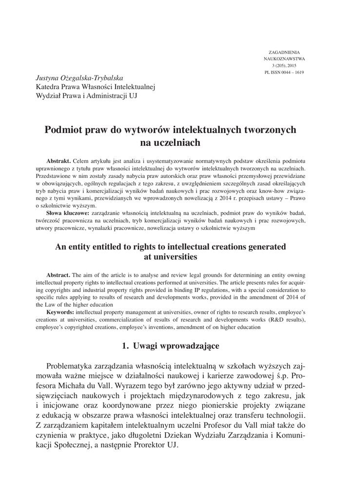 Justyna Ożegalska-Trybalska Katedra Prawa Własności Intelektualnej Wydział Prawa i Administracji UJ ZAGADNIENIA NAUKOZNAWSTWA 3 (205), 2015 PL ISSN 0044 – 1619 Podmiot praw do wytworów intelektualnych tworzonych na uczelniach Abstrakt. Celem artykułu jest analiza i usystematyzowanie normatywnych podstaw określenia podmiotu uprawnionego z tytułu praw własności intelektualnej do wytworów intelektualnych tworzonych na uczelniach. Przedstawione w nim zostały zasady nabycia praw autorskich oraz praw własności przemysłowej przewidziane w obowiązujących, ogólnych regulacjach z tego zakresu, z uwzględnieniem szczególnych zasad określających tryb nabycia praw i komercjalizacji wyników badań naukowych i prac rozwojowych oraz know-how związanego z tymi wynikami, przewidzianych we wprowadzonych nowelizacją z 2014 r. przepisach ustawy – Prawo o szkolnictwie wyższym. Słowa kluczowe: zarządzanie własnością intelektualną na uczelniach, podmiot praw do wyników badań, twórczość pracownicza na uczelniach, tryb komercjalizacji wyników badań naukowych i prac rozwojowych, utwory pracownicze, wynalazki pracownicze, nowelizacja ustawy o szkolnictwie wyższym An entity entitled to rights to intellectual creations generated at universities Abstract. The aim of the article is to analyse and review legal grounds for determining an entity owning intellectual property rights to intellectual creations performed at universities. The article presents rules for acquiring copyrights and industrial property rights provided in binding IP regulations, with a special consideration to specific rules applying to results of research and developments works, provided in the amendment of 2014 of the Law of the higher education Keywords: intellectual property management at universities, owner of rights to research results, employee’s creations at universities, commercialization of results of research and developments works (R&D results), employee’s copyrighted creations, employee’s inventions, amendment of on higher education 1. Uwagi wprowadzające Problematyka zarządzania własnością intelektualną w szkołach wyższych zajmowała ważne miejsce w działalności naukowej i karierze zawodowej ś.p. Profesora Michała du Vall. Wyrazem tego był zarówno jego aktywny udział w przedsięwzięciach naukowych i projektach międzynarodowych z tego zakresu, jak i inicjowane oraz koordynowane przez niego pionierskie projekty związane z edukacją w obszarze prawa własności intelektualnej oraz transferu technologii. Z zarządzaniem kapitałem intelektualnym uczelni Profesor du Vall miał także do czynienia w praktyce, jako długoletni Dziekan Wydziału Zarządzania i Komunikacji Społecznej, a następnie Prorektor UJ. 348 JUSTYNA OŻEGALSKA-TRYBALSKA Niniejszy artykuł poświęcony jest jednemu z aspektów zarządzania własnością intelektualną na uczelniach jakim jest identyfikacja podmiotu uprawnionego do tworzonych na nich wytworów intelektualnych. Jego celem jest analiza tego praktycznego zagadnienia z uwzględnieniem różnic związanych z: charakterem danego wytworu (rezultat badań naukowych, prac rozwojowych lub wytwór powstały w wyniku innej działalności, np. działalności dydaktycznej), „statusem” jego twórcy (pracownik, student, doktorant) oraz ustawowych zasad zarządzania wynikami badań naukowych i prac rozwojowych w szkołach wyższych. Pretekstem do analizy tej problematyki jest wprowadzenie do ustawy Prawo o szkolnictwie wyższym z 27 lipca 2005 r.1 (dalej „p.s.w.”) nowelizacją z 11 lipca 2014 r.2 przepisów określających – szczególny w stosunku do zasad określonych w ustawie o prawie autorskim i prawach pokrewnym z 4 lutego 1994 r.3 (dalej „pr.aut”) oraz ustawie Prawo własności przemysłowej z dnia 30 czerwca 2000 r.4 (dalej „p.w.p.”) – reżim nabycia i komercjalizacji praw do wyników badań naukowych i prac rozwojowych oraz know-how związanego z tymi wynikami. Rozwiązania przyjęte w tym zakresie w art. 86 d-e p.s.w są wiążące dla uczelni publicznych i muszą być uwzględnione przy określaniu zasad zarządzania takimi wynikami w wewnętrznych regulaminach zarządzania prawami autorskimi i prawami pokrewnymi, prawami własności przemysłowej oraz zasad komercjalizacji. Regulaminy takie stanowią obligatoryjne narzędzie regulowania procesów zarządzania własnością intelektualną i jej komercjalizacją na uczelniach5. 2. Relacja przepisów ogólnych z zakresu prawa własności intelektualnej i przepisów p.s.w. Z uwagi na wskazane powyżej, różne podstawy normatywne z których mogą wynikać zasady nabycia praw do określonego wytworu intelektualnego stworzonego na uczelni, w pierwszej kolejności zasadne jest określenie wzajemnej relacji i zakresu zastosowania przepisów powołanych ustaw zarówno w aspekcie przedmiotowym, jak i podmiotowym. W tym kontekście wyjaśnienia wymaga, po pierwsze, jakie wytwory intelektualne objęte są tymi regulacjami, po drugie – jakich podmiotów dotyczą przewidziane w nich tryby nabycia praw własności intelektualnej. Odnosząc się do kwestii przedmiotowego zakresu obowiązujących regulacji należy wskazać, że przepisy pr.aut. określają zasady nabycia praw do utworów 1 Dz. U. z 2012 r., poz. 572 z późn. zm. Dz. U. z 2014 r., poz. 1198. 3 Dz. U. z 2010 r. Nr 152, poz. 1016 z późn. zm. 4 Dz. U. z 2013 r., poz. 1410 z późn. zm 5 Obowiązek uchwalenia takich regulaminów przez senat uczelni publicznej (a w przypadku uczelni niepublicznej – organ wskazany w statucie) wynika z art. 86 c pkt. 1 ust. 1 p.s.w. Zgodnie z art. 46 ustawy nowelizującej z 2014 r. takie regulaminy powinny być uchwalone na uczelniach publicznych i niepublicznych do dnia 30 marca 2015 r. 2 PODMIOT PRAW DO WYTWORÓW INTELEKTUALNYCH… 349 oraz przedmiotów praw pokrewnych, natomiast w p.w.p. przewidziane są zbliżone przepisy w odniesieniu do: wynalazków, wzorów użytkowych, wzorów przemysł