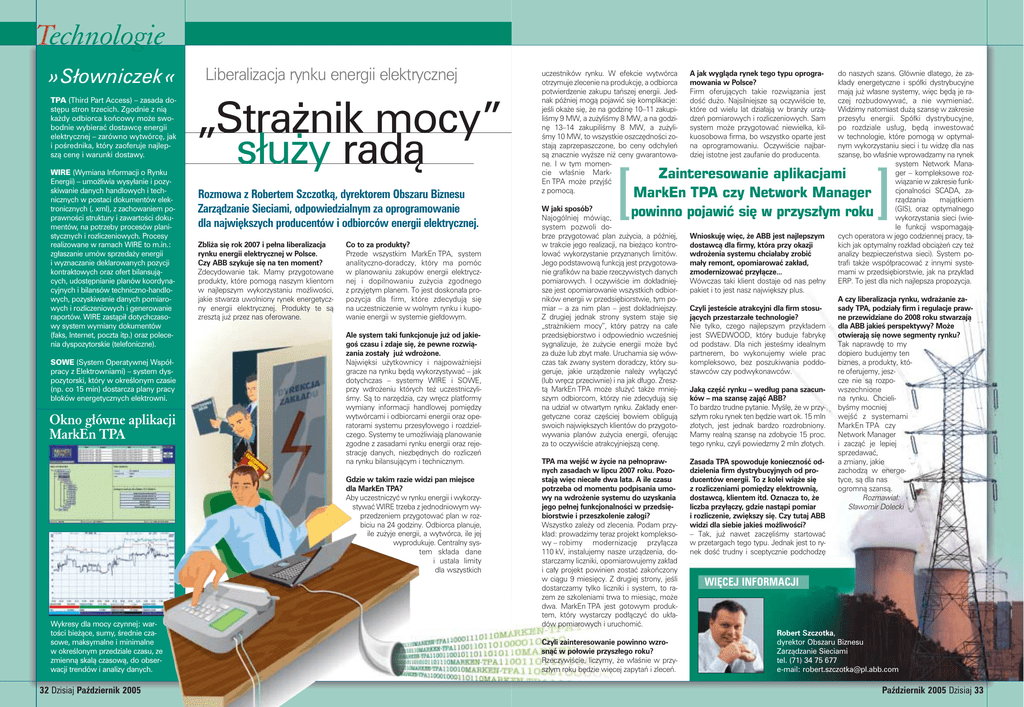 Technologie »Słowniczek « TPA (Third Part Access) – zasada dostępu stron trzecich. Zgodnie z nią każdy odbiorca końcowy może swobodnie wybierać dostawcę energii elektrycznej – zarówno wytwórcę, jak i pośrednika, który zaoferuje najlepszą cenę i warunki dostawy. WIRE (Wymiana Informacji o Rynku Energii) – umożliwia wysyłanie i pozyskiwanie danych handlowych i technicznych w postaci dokumentów elektronicznych (. xml), z zachowaniem poprawności struktury i zawartości dokumentów, na potrzeby procesów planistycznych i rozliczeniowych. Procesy realizowane w ramach WIRE to m.in.: zgłaszanie umów sprzedaży energii i wyznaczanie deklarowanych pozycji kontraktowych oraz ofert bilansujących, udostępnianie planów koordynacyjnych i bilansów techniczno-handlowych, pozyskiwanie danych pomiarowych i rozliczeniowych i generowanie raportów. WIRE zastąpił dotychczasowy system wymiany dokumentów (faks, Internet, poczta itp.) oraz polecenia dyspozytorskie (telefoniczne). SOWE (System Operatywnej Współpracy z Elektrowniami) – system dyspozytorski, który w określonym czasie (np. co 15 min) dostarcza plany pracy bloków energetycznych elektrowni. Okno g∏ówne aplikacji MarkEn TPA Liberalizacja rynku energii elektrycznej „Strażnik mocy” służy radą Rozmowa z Robertem Szczotkà, dyrektorem Obszaru Biznesu Zarzàdzanie Sieciami, odpowiedzialnym za oprogramowanie dla najwi´kszych producentów i odbiorców energii elektrycznej. Zbliża się rok 2007 i pełna liberalizacja rynku energii elektrycznej w Polsce. Czy ABB szykuje się na ten moment? Zdecydowanie tak. Mamy przygotowane produkty, które pomogà naszym klientom w najlepszym wykorzystaniu mo˝liwoÊci, jakie stwarza uwolniony rynek energetyczny energii elektrycznej. Produkty te sà zresztà ju˝ przez nas oferowane. Co to za produkty? Przede wszystkim MarkEn TPA, system analityczno-doradczy, który ma pomóc w planowaniu zakupów energii elektrycznej i dopilnowaniu zu˝ycia zgodnego z przyj´tym planem. To jest doskona∏a propozycja dla firm, które zdecydujà si´ na uczestniczenie w wolnym rynku i kupowanie energii w systemie gie∏dowym. Ale system taki funkcjonuje już od jakiegoś czasu i zdaje się, że pewne rozwiązania zostały już wdrożone. Najwi´ksi u˝ytkownicy i najpowa˝niejsi gracze na rynku b´dà wykorzystywaç – jak dotychczas – systemy WIRE i SOWE, przy wdro˝eniu których te˝ uczestniczyliÊmy. Sà to narz´dzia, czy wr´cz platformy wymiany informacji handlowej pomi´dzy wytwórcami i odbiorcami energii oraz operatorami systemu przesy∏owego i rozdzielczego. Systemy te umo˝liwiajà planowanie zgodne z zasadami rynku energii oraz rejestracj´ danych, niezb´dnych do rozliczeƒ na rynku bilansujàcym i technicznym. Gdzie w takim razie widzi pan miejsce dla MarkEn TPA? Aby uczestniczyç w rynku energii i wykorzystywaç WIRE trzeba z jednodniowym wyprzedzeniem przygotowaç plan w rozbiciu na 24 godziny. Odbiorca planuje, ile zu˝yje energii, a wytwórca, ile jej wyprodukuje. Centralny system sk∏ada dane i ustala limity dla wszystkich Wykresy dla mocy czynnej: wartości bieżące, sumy, średnie czasowe, maksymalne i minimalne w określonym przedziale czasu, ze zmienną skalą czasową, do obserwacji trendów i analizy danych. 32 Dzisiaj Paêdziernik 2005 uczestników rynku. W efekcie wytwórca otrzymuje zlecenie na produkcj´, a odbiorca potwierdzenie zakupu taƒszej energii. Jednak póêniej mogà pojawiç si´ komplikacje: jeÊli oka˝e si´, ˝e na godzin´ 10–11 zakupiliÊmy 9 MW, a zu˝yliÊmy 8 MW, a na godzin´ 13–14 zakupiliÊmy 8 MW, a zu˝yliÊmy 10 MW, to wszystkie oszcz´dnoÊci zostajà zaprzepaszczone, bo ceny odchyleƒ sà znacznie wy˝sze ni˝ ceny gwarantowane. I w tym momencie w∏aÊnie MarkEn TPA mo˝e przyjÊç z pomocà. A jak wygląda rynek tego typu oprogramowania w Polsce? Firm oferujàcych takie rozwiàzania jest doÊç du˝o. Najsilniejsze sà oczywiÊcie te, które od wielu lat dzia∏ajà w bran˝y urzàdzeƒ pomiarowych i rozliczeniowych. Sam system mo˝e przygotowaç niewielka, kilkuosobowa firma, bo wszystko oparte jest na oprogramowaniu. OczywiÊcie najbardziej istotne jest zaufanie do producenta. do naszych szans. G∏ównie dlatego, ˝e zak∏ady energetyczne i spó∏ki dystrybucyjne majà ju˝ w∏asne systemy, wi´c b´dà je raczej rozbudowywaç, a nie wymieniaç. Widzimy natomiast du˝à szans´ w zakresie przesy∏u energii. Spó∏ki dystrybucyjne, po rozdziale us∏ug, b´dà inwestowaç w technologie, które pomogà w optymalnym wykorzystaniu sieci i tu widz´ dla nas szans´, bo w∏aÊnie wprowadzamy na rynek system Network Manager – kompleksowe rozwiàzanie w zakresie funkcjonalnoÊci SCADA, zarzàdzania majàtkiem (GIS), oraz optymalnego wykorzystania sieci (wiele funkcji wspomagajàcych operatora w jego codziennej pracy, takich jak optymalny rozk∏ad obcià˝eƒ czy te˝ analizy bezpieczeƒstwa sieci). System potrafi tak˝e wspó∏pracowaç z innymi systemami w przedsi´biorstwie, jak na przyk∏ad ERP. To jest dla nich najlepsza propozycja. Zainteresowanie aplikacjami MarkEn TPA czy Network Manager powinno pojawiç si´ w przysz∏ym roku W jaki sposób? Najogólniej mówiàc, system pozwoli dobrze przygotowaç plan zu˝ycia, a póêniej, w trakcie jego realizacji, na bie˝àco kontrolowaç wykorzystanie przyznanych limitów. Jego podstawowà funkcjà jest przygotowanie grafików na bazie rzeczywistych danych pomiarowych. I oczywiÊcie im dok∏adniejsze jest opomiarowanie wszystkich odbiorników energii w przedsi´biorstwie, tym pomiar – a za nim plan – jest dok∏adniejszy. Z drugiej jednak strony system staje si´ „stra˝nikiem mocy”, który patrzy na ca∏e przedsi´biorstwo i odpowiednio wczeÊniej sygnalizuje, ˝e zu˝ycie energii mo˝e byç za du˝e lub zbyt ma∏e. Uruchamia si´ wówczas tak zwany system doradczy, który sugeruje, jakie urzàdzenie nale˝y wy∏àczyç (lub wr´cz przeciwnie) i na ja