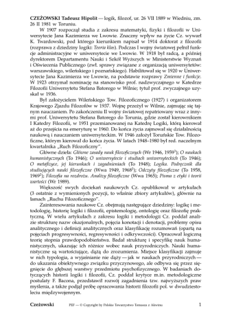 CZEŻOWSKI Tadeusz Hipolit — logik, filozof, ur. 26 VII 1889 w Wiedniu, zm. 26 II 1981 w Toruniu. W 1907 rozpoczął studia z zakresu matematyki, fizyki i filozofii w Uniwersytecie Jana Kazimierza we Lwowie. Znaczny wpływ na życie Cz. wywarł K. Twardowski, pod którego kierunkiem napisał w 1914 doktorat z filozofii (rozprawa z dziedziny logiki: Teoria klas). Podczas I wojny światowej pełnił funkcje administracyjne w uniwersytecie we Lwowie. W 1918 był radcą, a później dyrektorem Departamentu Nauki i Szkół Wyższych w Ministerstwie Wyznań i Oświecenia Publicznego (zwł. sprawy związane z organizacją uniwersytetów: warszawskiego, wileńskiego i poznańskiego). Habilitował się w 1920 w Uniwersytecie Jana Kazimierza we Lwowie, na podstawie rozprawy Zmienne i funkcje. W 1923 otrzymał nominację na stanowisko prof. nadzwyczajnego w Katedrze Filozofii Uniwersytetu Stefana Batorego w Wilnie; tytuł prof. zwyczajnego uzyskał w 1936. Był założycielem Wileńskiego Tow. Filozoficznego (1927) i organizatorem Krajowego Zjazdu Filozofów w 1937. Wojnę przeżył w Wilnie, zajmując się tajnym nauczaniem. Po zakończeniu II wojny światowej repatriowany wraz z innymi prof. Uniwersytetu Stefana Batorego do Torunia, gdzie został kierownikiem I Katedry Filozofii, w 1951 przemianowanej na Katedrę Logiki, którą kierował aż do przejścia na emeryturę w 1960. Do końca życia zajmował się działalnością naukową i nauczaniem uniwersyteckim. W 1946 założył Toruńskie Tow. Filozoficzne, którym kierował do końca życia. W latach 1948–1980 był red. naczelnym kwartalnika „Ruch Filozoficzny”. Główne dzieła: Główne zasady nauk filozoficznych (Wr 1946, 19593 ); O naukach humanistycznych (To 1946); O uniwersytecie i studiach uniwersyteckich (To 1946); O metafizyce, jej kierunkach i zagadnieniach (To 1948); Logika. Podręcznik dla studiujących nauki filozoficzne (Wwa 1949, 19682 ); Odczyty filozoficzne (To 1958, 19692 ); Filozofia na rozdrożu. Analizy filozoficzne (Wwa 1965); Pisma z etyki i teorii wartości (Wr 1989). Większość swych dociekań naukowych Cz. opublikował w artykułach (3 ostatnie z wymienionych pozycji, to właśnie zbiory artykułów), głównie na łamach „Ruchu Filozoficznego”. Zainteresowania naukowe Cz. obejmują następujące dziedziny: logikę i metodologię, historię logiki i filozofii, epistemologię, ontologię oraz filozofię praktyczną. W wielu artykułach z zakresu logiki i metodologii Cz. poddał analizie strukturę nazw okazjonalnych, pojęcia konotacji i denotacji, problemy opisu analitycznego i definicji analitycznych oraz klasyfikację rozumowań (opartą na pojęciach progresywności, regresywności i odkrywczości). Opracował logiczną teorię stopnia prawdopodobieństwa. Badał strukturę i specyfikę nauk humanistycznych, ukazując ich różnice wobec nauk przyrodniczych. Nauki humanistyczne są wartościujące, dążą do zrozumienia. Miejsce klasyfikacji zajmuje w nich typologia, a wyjaśnianie nie dąży — jak w naukach przyrodniczych — do ukazania obiektywnego związku przyczynowego, ale odbywa się przez sięgnięcie do głębszej warstwy przedmiotu psychofizycznego. W badaniach dotyczących historii logiki i filozofii, Cz. poddał krytyce m.in. metodologiczne postulaty F. Bacona, przedstawił rozwój zagadnienia tzw. najwyższych praw myślenia, a także podjął próbę opracowania historii filozofii pol. w dwudziestoleciu międzywojennym. Czeżowski PEF — © Copyright by Polskie Towarzystwo Tomasza z Akwinu 1 Ważne miejsce w badaniach Cz. zajmowały zagadnienia teoriopoznawcze. Wnikliwej krytyce poddał stanowisko skrajnego racjonalizmu, przeciwstawiając mu pogłębione stanowisko empirycystyczne (racjonalny składnik poznania nie jest jego czynnikiem strukturalnym, ale wyłącznie narzędziem poznawczym); nie wolno mówić o bezwzględnej prawdziwości założeń, aksjomaty teorii mają charakter postulatów znaczeniowych dla terminów danego systemu; przesłankami wiedzy o rzeczywistości są jedynie zdania jednostkowe, a wiedza empiryczna jest probabilistyczna; żadne z założeń nauki nie jest absolutne, a nauka jest nieustannym procesem przetwarzania koncepcji świata zbliżającej się asymptotycznie do adekwatnego jego ujęcia. Filozofię pojmował Cz. jako dyscyplinę naukową, której podstawową cechą jest krytycyzm. Celem filozofii jest formułowanie najogólniejszych zasad rzeczywistości poznawalnej, jednak nie można zdecydowanie opowiedzieć się za żadnym stanowiskiem filozoficznym. Z problematyką epistemologiczną wiążą się zainteresowania ontologią. Metafizyka — wg Cz. — może być uprawiana na trzy sposoby: aksjomatyczny (metafizyka o charakterze dedukcyjnym jako interpretacja sformalizowanych systemów logicznych), intuicjonistyczny (posługujący się rozszerzonym rozumieniem doświadczenia) i indukcyjny (budowanie metafizyki może się odbywać jedynie drogą ekstrapolacji wiedzy o świecie, dostępnej w doświadczeniu empirycznym). Cz. opowiadał się za ostatnim rozumieniem metafizyki. Szczególnie ważne są rozważania Cz. dotyczące pojęcia istnienia i problemu indywiduacji. Zainteresowania badawcze Cz. obejmowały także filozofię praktyczną. Założeniami etyki są empiryczne oceny pierwotne, a nie aprioryczne zasady; oceny te mają charakter aksjologicznych zdań jednostkowych, które w wyniku uogólnienia stanowić mogą kryteria oceny. Kryteria te nie są bezwzględnie obowiązujące i wymagają nieustannej rewizji. Nie są one też całkowicie dowolne. Cz. sformułował swoistą „logikę norm”, dotyczącą reguł preferowania jednych norm przed drugimi. Bazą dla tej logiki są elementarne intuicje moralne. Bibliografia: Księga pamiątkowa ku czci prof. Tadeusza Cz., To 1980; N. Łubnicki, Próba systematycznego ujęcia twórczości i działalności naukowej prof. dra Tadeusza Cz., SF 24 (1980) z. 3, 45– –57; J. J. Jadacki, Semiotyka Tadeusz