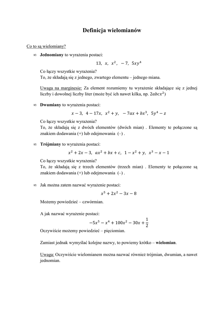 Definicja wielomianów Co to są wielomiany? • Jednomiany to wyrażenia postaci: 13,, ଶ , 7,5 ସ Co łączy wszystkie wyrażenia? To, że składają się z jednego, zwartego elementu – jednego miana. Uwaga na marginesie: Za element rozumiemy tu wyrażenie składające się z jednej liczby i dowolnej liczby liter (może być ich nawet kilka, np. 2 ଶ ) • Dwumiany to wyrażenia postaci: 3,4 17, ଶ , 7 ଷ ,5 ସ Co łączy wszystkie wyrażenia? To, że składają się z dwóch elementów (dwóch mian) . Elementy te połączone są znakiem dodawania (+) lub odejmowania (–) . • Trójmiany to wyrażenia postaci: ଶ 2 3, ଶ ,1 ଶ , ଷ 1 Co łączy wszystkie wyrażenia? To, że składają się z trzech elementów (trzech mian) . Elementy te połączone są znakiem dodawania (+) lub odejmowania (–) . • Jak można zatem nazwać wyrażenie postaci: ହ 2 ଶ 3 8 Możemy powiedzieć – czwórmian. A jak nazwać wyrażenie postaci: 5 ହ ସ 100 ଶ 30 1 2 Oczywiście możemy powiedzieć – pięciomian. Zamiast jednak wymyślać kolejne nazwy, to powiemy krótko – wielomian. Uwaga: Oczywiście wielomianem można nazwać również trójmian, dwumian, a nawet jednomian. Formalna definicja Wielomianem stopnia n zmiennej x nazywamy wyrażenie postaci: ିଵ ିଵ … ଶ ଶ ଵ gdzie , ିଵ , … , ଶ , ଵ , są liczbami rzeczywistymi i ∈ oraz 0. Przykłady wielomianów: ଶ 1 2 ଷ ଶ 2 1 3 1 0,5 2 ହ ସ 8 ଷ 11 ଶ 7 3 Z ilu elementów składa się każdy z tych wielomianów? Czy umiesz wskazać wśród tych wielomianów trójmian?