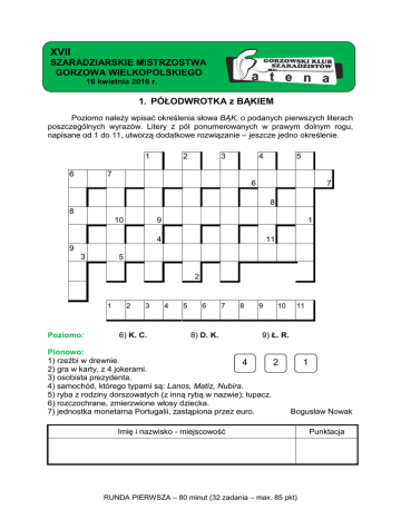 XVII SZARADZIARSKIE MISTRZOSTWA GORZOWA WIELKOPOLSKIEGO 16 kwietnia 2016 r. 1. PÓŁODWROTKA z BĄKIEM Poziomo należy wpisać określenia słowa BĄK, o podanych pierwszych literach poszczególnych wyrazów. Litery z pól ponumerowanych w prawym dolnym rogu, napisane od 1 do 11, utworzą dodatkowe rozwiązanie – jeszcze jedno określenie. 1 6 2 3 4 5 7 6 7 8 8 10 9 1 4 11 9 3 5 2 1 Poziomo: 2 3 6) K. C. 4 5 6 7 8) D. K. 8 9 10 11 9) Ł. R. Pionowo: 1) rzeźbi w drewnie. 4 2 2) gra w karty, z 4 jokerami. 3) osobista prezydenta. 4) samochód, którego typami są: Lanos, Matiz, Nubira. 5) ryba z rodziny dorszowatych (z inną rybą w nazwie); łupacz. 6) rozczochrane, zmierzwione włosy dziecka. 7) jednostka monetarna Portugalii, zastąpiona przez euro. 1 Bogusław Nowak Imię i nazwisko - miejscowość RUNDA PIERWSZA – 80 minut (32 zadania – max. 85 pkt) Punktacja 2. JOLKA od A do Ż Każdy odgadywany wyraz (w nawiasie podano liczbę liter) zaczyna się literą poprzedzającą określenie. Litery z pól z kropką, czytane rzędami, utworzą dodatkowe rozwiązanie – inicjał imienia i nazwisko Iksa związanego z powojenną historią Gorzowa. A Ż ● ● ● ● ● ● ● ● ● A) stanowisko pracownika naukowego (10). B) popularny komentator sportowy (7). C) odcień skóry (4). D) technika rzeźbiarska (15). E) klawisz komputerowy (5). F) gatunek wieloryba (6). G) lina służąca do podnoszenia i opuszczania gafla (7). H) dział weterynarii, zajmujący się leczeniem koni (9). I) lewy dopływ Irtyszu, płynie przez Petropawłowsk (5). J) ulubione drzewo Laury i Filona (5). K) nowozelandzki nielot (4). L) roślina z rodziny lnowatych (5). 5 2 Ł) port i kąpielisko nad Bałtykiem (4). M) dzika owca żyjąca w Sudetach (6). N) skóra na paski, torebki (4). O) mąż Penelopy (4). P) leczy schizofrenię (10). R) Piotr Marzec, czyli Liroy (5). S) bezużyteczny przedmiot (6). T) obszar położony poza frontem (4). U) ojciec tytanów i cyklopów (6). W) niejeden na dużej imprezie szaradziarskiej, organizowanej przez redakcję „Rozrywki” (15). Z) leczy nielegalnie (9). Ż) mięsień, który unosi żuchwę (5). 3 2 NIELOGIKA, RACINE, JEŻE 1 Marian Rutkowski 1 3. STRACH Litery z pól ponumerowanych dodatkowo od 1 do 10, utworzą dodatkowe rozwiązanie – tytuł horroru wyreżyserowanego przez Johna Landisa. 2 4 3 4 5 2 6 1 3 7 10 8 9 4 10 9 11 5 12 13 14 8 2 7 15 6 16 1 1 2 3 Poziomo: 2) w wierzeniach ludowych: diabeł wodny, istota wyjątkowo zła, budząca strach (z dziełem zduna w nazwie). 6) szczękanie zębami ze strachu. 8) mafia neapolitańska, siejąca strach we Włoszech. 10) uczucie niepokoju wywołane strachem. 12) strachu i grozy, panujący w kraju totalitarnym. 14) można trząść się ze strachu jak ona. 15) tam dusza u strachliwego. 16) mówienie po cichu ze strachu przed kimś. 4. KALAMBUR 1 4 5 6 7 8 9 10 Pionowo: 1) pociski głębinowe, będące postrachem okrętów podwodnych. 3) uczucie niepokoju wywołane strachem. 4) nagły, niepohamowany, często nieuzasadniony strach. 5) przechodzą nam po plecach ze strachu. 6) drżenie ze strachu. 7) w przysłowiu: Boi się jak … pierzyny. 9) coś strasznego, wzbudzającego grozę. 11) przysłowia: Strach ma wielkie skrzydła względem Strach skrzydeł dodaje. 13) staroegipska, sieje strach w znanym horrorze Stephena Sommersa. Bogusław Nowak 5. KALAMBUR 1 2 6. KALAMBUR Hel i grecka litera wiadomości zawiera. Dopływ Wisły, bieg sprawy – gród znany od czasów Mieszka i Dobrawy. Zupa na zakwasie oraz mania – przyjęcie towarzyskie z tego się wyłania. Marian Rutkowski Marian Rutkowski Marian Rutkowski ESKUDO, EYCK, ZERIBA 3 7. JOLKA Ujawniono wszystkie spółgłoski L i N. Litery w polach ze słoneczkiem, czytane kolumnami, utworzą dodatkowe rozwiązanie – imię i nazwisko Iksa związanego z Gorzowem. N miasto leżące nad jez. Jeziorak historyczna kraina w Grecji, z głównym miastem Larisa 3 „śpiewający” bursztyn złoty posąg bóstwa w postaci byka końcówka tkaniny z beli materiału 1 bandycki napad przeciwdziałanie duży port rzeczny nad Angarą zbieranie datków pieniężnych na cele publiczne dermatolog stolica regionu świętokrzyskiego L ☼ ☼ ☼ ☼ ☼ ☼ ☼ ☼ ☼ ☼ ☼ ☼ ☼ N Marian Rutkowski L 8. SYNTEZA ☼ ● ● ☼ ☼ ● ☼ Podane pary liter należy wpisać do diagramu, tak aby powstała krzyżówka dwuliterowa. Litery w polach z kropką, czytane rzędami, utworzą dodatkowe rozwiązanie. CJ, DA, EN, HA, JO, KA, KO, LA, LI, MA, NC, PE, RP, SZ, TE, WI. 3 Marian Rutkowski 9. LOGOGRYF Litery w kolorowych polach czytane rzędami, utworzą rozwiązanie: nazwę starej odmiany śliwy. ● Wzdłuż strzałek: * szałowa w szafie elegantki W kolejności przypadkowej: ● rozładowanie napięcia nerwowego ● czterolistna – symbol szczęścia ● jedno z pomieszczeń z wyposażeniem górniczym ● odlewnicza maszyna formierska ● zbezczeszczenie, zniesławianie. 3 4 1 HIPIATRIA, MODENA Bogusław Nowak 10. PIERWSZE ZDANIE Poziomo należy wpisać tytuły powieści Stefana Żeromskiego, odgadnięte na podstawie pierwszego zdania, rozpoczynającego utwór. Litery z pól ponumerowanych, napisane od 1 do 14, utworzą rozwiązanie – tytuł jeszcze jednej powieści tego pisarza. 1 13 2 3 4 5 6 7 8 9 10 11 12 13 14 6 7 12 11 1 2 5 1 10 14 3 3 2 8 4 9 Poziomo: 1) „W czasie powrotu do domu Ewa miała oczy spuszczone”. 2) „Ujrzeli nareszcie bielejące brzegi”. 3) „Termin odstawienia Marcina do szkoły, przypadł na dzień czwartego stycznia”. Pionowo (w kolejności przypadkowej): 4 marka włoskich samochodów sportowych wielbiciel, pochlebca Józef Hen, Jarosław Iwaszkiewicz i Bolesław Prus sportowy but z płótna i gumy dawniej: oszust, naciągacz prawnik, specjalista w zakresie karania G E M I N I Bogusław Nowak 11. METAMORFOZA 2 W wyrazie GEMINI należy zmienić literę z kolorowego pola na inną, a następnie przenieść litery do kolejnego rzędu, tworząc nowe sło