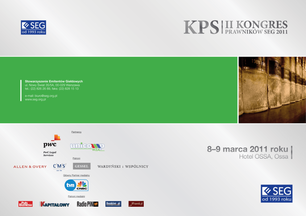 KPS II KONGRES PRAWNIKÓW SEG 2011 Stowarzyszenie Emitentów Giełdowych ul. Nowy Świat 35/5A, 00-029 Warszawa tel.: (22) 826 26 89, faks: (22) 828 15 13 e-mail: [email protected] www.seg.org.pl Partnerzy 8–9 marca 2011 roku Patroni Główny Partner medialny CMS_LawTax_CMYK_28-100.eps Patroni medialni Hotel OSSA, Ossa KPS II KONGRES PRAWNIKÓW SEG 2011 Program Kongresu Szanowni Państwo 8 MARCA 2011 (wtorek) W imieniu Stowarzyszenia Emitentów Giełdowych pragnę Państwa zaprosić na II Kongres Prawników Spółek Giełdowych SEG, podczas którego przeprowadzimy kolejne fikcyjne WZ Zwykłej Spółki SA oraz zapoznamy się z najważniejszymi zmianami regulacyjnymi dotyczącymi spółek giełdowych. Kongres odbędzie się w dniach 8-9 marca br. w Hotelu OSSA w Ossie k/Rawy Mazowieckiej. odczas I Kongresu Prawników Spółek Giełdowych SEG mieliśmy okazję zapoP znać uczestników wydarzenia z istotnymi zagadnieniami potrzebnymi zarówno do organizacji, jak i przeprowadzenia e-WZA, przedstawiając nietypowe sytuacje, które mogą – ale nie muszą – wystąpić podczas Walnego Zgromadzenia. W związku z tym, iż zeszłoroczny Kongres cieszył się dużym zainteresowaniem, z przyjemnością organizujemy go dla Państwa po raz kolejny wzbogacając o inne ważne aspekty. Pierwszego dnia Kongresu będziemy starali się rozwiązać problemy dotyczące aktu dokonywania wyboru podczas Walnego Zgromadzenia, w tym możliwe trudności związane z powoływaniem członków Rad Nadzorczych. Natomiast podczas drugiego dnia zaplanowaliśmy dla Państwa warsztaty poświęcone głównie tematyce ostatnich zmian regulacyjnych. Podczas zajęć praktycznych przedstawiciele różnych kancelarii prawnych będą dyskutowali m.in. o zmianach regulacji lub orzecznictwa w odniesieniu do kwestii fuzji i przejęć, opodatkowania kosztów emisji, raportowania bieżącego, pełnomocnictwa na WZA, obligacji oraz oddziaływania prawa UE na funkcjonowanie polskich spółek giełdowych. W trakcie dyskusji plenarnej, a także rozmów kuluarowych poszukiwać będziemy praktycznych rozwiązań problemów wynikających ze zmian w regulacjach. Dotyczyły będą one m.in. wezwań, orzecznictwa NSA oraz zmian w KSH. Tematów do dyskusji jest oczywiście bardzo wiele i nie wszystkie udało się zmieścić w agendzie. Część z nich będziemy mogli zatem przedyskutować w mniej formalnej atmosferze – m.in. podczas wieczoru ostatkowego dedykowanego Międzynarodowemu Dniu Kobiet zorganizowanego w konwencji lat 70-tych. Do zobaczenia na Kongresie! 12.00 – 13.00 Rejestracja gości 13.00 – 14.00 Lunch 14.00 – 14.15 Otwarcie Kongresu Beata Stelmach, Prezes Zarządu, Stowarzyszenie Emitentów Giełdowych 14.15 – 16.30 WZ Zwykłej Spółki SA – I SESJA Przewodniczący: Leszek Koziorowski, Wspólnik, Kancelaria Gessel, Koziorowski sp.k. • Normalne głosowanie czy akt wyboru? • Wybory do Rady Nadzorczej • Rola biegłego rewidenta podczas WZA • Tajność i jawność głosowania 16.30 – 16.50 Przerwa kawowa 16.50 – 19.00 WZ Zwykłej Spółki SA – II SESJA 20.00 – 24.00 Kolacja przy muzyce na żywo w konwencji PRL połączona z Dniem Kobiet 9 MARCA 2011 (środa) 9.00 – 10.30 11.00 – 12.30 Beata Stelmach Prezes Zarządu SEG Udział w Kongresie jest bezpłatny. Uczestnicy sami pokrywają koszt zakwaterowania. Zgłoszenia należy przesyłać drogą elektroniczną, po wypełnieniu formularza zgłoszeniowego dostępnego na stronie internetowej www.seg.org.pl lub po wypełnieniu załączonej karty zgłoszeniowej pod nr faxu: (22) 828 15 13. Liczba miejsc jest ograniczona, decyduje kolejność zgłoszeń. Zapraszamy przedstawicieli spółek należących do SEG. W sprawie członkostwa prosimy o telefon do Biura SEG: (22) 826 26 89 10.30 – 11.00 12.30 – 12.45 Dwie tury warsztatów w grupach: • opodatkowanie kosztów emisji – praktyczne aspekty związane z orzeczeniami NSA Inarda Bielińska, Radca Prawny, Kancelaria Gessel, Koziorowski Sp.k. • lewarowany wykup spółek publicznych, finansowanie i aspekty podatkowe dr Rafał Stroiński, Partner, CMS Cameron McKenna Anna Wawrzyńczak, Prawnik, CMS Cameron McKenna Andrzej Pośniak, Prawnik, CMS Cameron McKenna • raportowanie bieżące - prace nad nowymi regulacjami i pożądane kierunki zmian dr Mirosław Kachniewski, Wiceprezes Zarządu, Stowarzyszenie Emitentów Giełdowych Zbigniew Mrowiec, Partner, Kancelaria Allen & Overy, A. Pędzich sp.k. • pełnomocnik na WZA – problemy wynikające ze zmian KSH Andrzej Knap, Prezes Zarządu, Unicomp-WZA Sp. z o.o. Zbigniew Korba, Radca Prawny, Szef Praktyk Corporate/M&A oraz Banking/Finance w Kancelarii PricewaterhouseCoopers Legal Szurmińska-Jaworska Sp.k. • obligacje – prace nad nowymi regulacjami i pożądane kierunki zmian Jarosław Dubiński, Partner, Kancelaria Vogel, Dubiński i Wspólnicy • prawo UE jako integralna część prawa krajowego Morvan Le Berre, Danuta Pajewska, Wspólnik, Kancelaria Wardyński i Wspólnicy • wrogie przejęcia - najnowsze tendencje oraz sposoby obrony Dariusz Greszta, Partner, Kancelaria CMS Cameron McKenna Beata Binek, Kancelaria CMS Cameron McKenna Ewa Szlachetka, Kancelaria CMS Cameron McKenna Anna Wiland, Partner Zarządzający, Rothschild • fuzje i przejęcia – nowe regulacje dot. wezwań Leszek Koziorowski, Wspólnik, Kancelaria Gessel, Koziorowski Sp.k. • odpowiedzialność członków zarządów i rad nadzorczych i sposoby zarządzania tą odpowiedzialnością Aleksandra Minkowicz-Flanek, Radca Prawny w Kancelarii PricewaterhouseCoopers Legal Szurmińska-Jaworska Sp.k. Tomasz Rolewicz, Menedżer, PwC Cezary Żelaźnicki, Radca Prawny w Kancelarii PricewaterhouseCoopers Legal Szurmińska-Jaworska Sp.k. • znaczenie prawne i praktyczne regulaminu WZ i ogłoszenia o zwołaniu WZ Marcin Czaprowski, Prawnik, Allen & Overy, A. Pędzich sp.k. Przerwa kawowa Podsumowanie i zakończenie Kongresu www.seg.org.pl