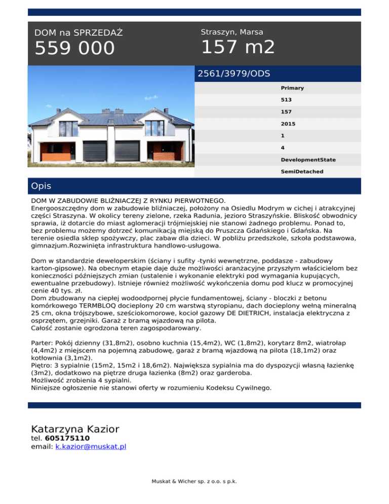 DOM na SPRZEDAŻ 559 000 Straszyn, Marsa 157 m2 2561/3979/ODS Primary 513 157 2015 1 4 DevelopmentState SemiDetached Opis DOM W ZABUDOWIE BLIŹNIACZEJ Z RYNKU PIERWOTNEGO. Energooszczędny dom w zabudowie bliźniaczej, położony na Osiedlu Modrym w cichej i atrakcyjnej części Straszyna. W okolicy tereny zielone, rzeka Radunia, jezioro Straszyńskie. Bliskość obwodnicy sprawia, iż dotarcie do miast aglomeracji trójmiejskiej nie stanowi żadnego problemu. Ponad to, bez problemu możemy dotrzeć komunikacją miejską do Pruszcza Gdańskiego i Gdańska. Na terenie osiedla sklep spożywczy, plac zabaw dla dzieci. W pobliżu przedszkole, szkoła podstawowa, gimnazjum.Rozwinięta infrastruktura handlowo-usługowa. Dom w standardzie deweloperskim (ściany i sufity -tynki wewnętrzne, poddasze - zabudowy karton-gipsowe). Na obecnym etapie daje duże możliwości aranżacyjne przyszłym właścicielom bez konieczności późniejszych zmian (ustalenie i wykonanie elektryki pod wymagania kupujących, ewentualne przebudowy). Istnieje również możliwość wykończenia domu pod klucz w promocyjnej cenie 40 tys. zł. Dom zbudowany na ciepłej wodoodpornej płycie fundamentowej, ściany - bloczki z betonu komórkowego TERMBLOQ docieplony 20 cm warstwą styropianu, dach docieplony wełną mineralną 25 cm, okna trójszybowe, sześciokomorowe, kocioł gazowy DE DIETRICH, instalacja elektryczna z osprzętem, grzejniki. Garaż z bramą wjazdową na pilota. Całość zostanie ogrodzona teren zagospodarowany. Parter: Pokój dzienny (31,8m2), osobno kuchnia (15,4m2), WC (1,8m2), korytarz 8m2, wiatrołap (4,4m2) z miejscem na pojemną zabudowę, garaż z bramą wjazdową na pilota (18,1m2) oraz kotłownia (3,1m2). Piętro: 3 sypialnie (15m2, 15m2 i 18,6m2). Największa sypialnia ma do dyspozycji własną łazienkę (3m2), dodatkowo na piętrze druga łazienka (8m2) oraz garderoba. Możliwość zrobienia 4 sypialni. Niniejsze ogłoszenie nie stanowi oferty w rozumieniu Kodeksu Cywilnego. Katarzyna Kazior tel. 605175110 email: [email protected] Muskat & Wicher sp. z o.o. s p.k. Muskat & Wicher sp. z o.o. s p.k. Powered by TCPDF (www.tcpdf.org)