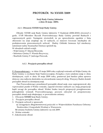 PROTOKÓŁ Nr XXXIII /2009 Sesji Rady Gminy Jaktorów z dnia 18 maja 2009r. Ad.1. Otwarcie XXXIII Sesji Rady Gminy. Obrady XXXIII sesji Rady Gminy Jaktorów V Kadencji (2006-2010) otworzył o godz. 17.00 Mirosław Byczak Przewodniczący Rady Gminy powitał Radnych i zaproszonych gości. Następnie stwierdził, że po sprawdzeniu zgodnie z listą obecności na sesji znajduje się 13 radnych, co stanowi kworum niezbędne do podejmowania prawomocnych uchwał. Radny Orliński Ireneusz był nieobecny natomiast radny Szumacher Dariusz spóźnił się. W obradach udział wzięli: - Wójt Gminy P. Maciej Śliwerski, - Sekretarz Gminy P. Wanda Brzywczy, - Skarbnik Gminy P. Jadwiga Florczak, Ad.2 . Przyjęcie porządku obrad P. Przewodniczący – w dniu 15 maja 2009 roku wpłynął wniosek od Wójta Gminy do Rady Gminy o zwołanie Sesji Nadzwyczajnej. Związku z tym ustalono sesję w dniu dzisiejszym, czyli w dniu 18 maja 2009 roku, ponieważ jest bardzo pilna sprawa dotyczy ona nabycia destruktu na utwardzanie naszych dróg. Wszyscy Radni dostali porządek obrad na dzisiejszej sesji. Pan Przewodniczący przedstawił porządek obrad sesji, oraz zaproponował, aby wprowadzić punkt 4 Wolne wnioski, zapytał również radnych czy mają propozycje bądź uwagi do porządku obrad. Wobec braku innych propozycji przegłosowano jednogłośnie wniosek Przewodniczącego, poczym odczytał on proponowany porządek obrad sesji obejmujący w prowadzone zmiany: 1. Otwarcie XXXIII Sesji Rady Gminy. 2. Przyjęcie porządku obrad. 3. Przyjęcie uchwał w sprawach: a) zaciągnięcia długoterminowej pożyczki w Wojewódzkim Funduszu Ochrony Środowiska i Gospodarki Wodnej w Warszawie. b) zmiany budżetu Gminy Jaktorów na rok 2009. 4. Wolne wnioski. 5 . Zakończenie obrad. 1 Radni w głosowaniu jednogłośnie przyjęli porządek obrad z wprowadzanymi zmianami. Ad. 3. Podjęcie uchwał w sprawach: Ad. 3a.Podjęcie uchwały w sprawie zaciągnięcia długoterminowej pożyczki w Wojewódzkim Funduszu Ochrony Środowiska i Gospodarki Wodnej w Warszawie. Pan Przewodniczący poprosił Pana Wójta o z referowanie projektu uchwały. P. Wójt – radny Świderski znalazł dużą ilość destruktu na lotnisku Okęcie w Warszawie płyta lotniska jest, co roku remontowana. W związku tym są duże ilości, destruktu, które możemy nabyć. Na destrukt potrzebne są nam pieniądze (60 000zł.), których w budżecie nie ma i dlatego zorganizowaliśmy sesje nadzwyczajną, żeby pieniądze w prowadzić do budżetu. Destrukt będzie układany w dwóch rejonach: Sade Budy (od drogi 719 ulicą Ogrodową, Polną i Jana III Sobieskiego i Władysława Jagiełły, aż do ulicy Chełmońskiego) i w Jaktorowie (na ulicy Powstańców – przed Kościołem i w kierunku od dawnego Blichu, ulica Chmielowskiego do ulicy Fabrycznej). Druga sprawa to zakup nowego samochodu dla Ochotniczej Straży Pożarnej w Międzyborowie. Zaciągniecie pożyczki w Wojewódzkim Funduszu Ochrony Środowiska i Gospodarki Wodnej w Warszawie. Jest tam 100.000 złotych dotacji i 250 000 złotych pożyczki umarzalnej, będą środki z OSP. Pieniądze z OSP są uzyskane ze składek ubezpieczeniowych i krajowego systemu. Te pieniądze powinniśmy wprowadzić do budżetu, ponieważ ma być rozpisany przetarg. Przystąpiono do głosowania nad projektem uchwały w sprawie zaciągnięcia długoterminowej pożyczki w Wojewódzkim Funduszu Ochrony Środowiska i Gospodarki Wodnej w Warszawie. Rada w głosowaniu: 13 -„za”,0-„przeciw”, 0 „wstrzymujących się”- podjęła uchwałę Nr XXXIII/209/2009, która stanowi załącznik do protokółu. Ad. 3b. Podjęcie uchwały w sprawie zmiany budżetu Gminy Jaktorów na rok 2009. Pan Przewodniczący poprosił Pana Wójta o z referowanie projektu uchwały. P. Wójt – ten projekt uchwały dotyczy wprowadzenia pieniędzy na zakup nowego samochodu dla Ochotniczej Straży Pożarnej w Międzyborowie. Zaciągniecie pożyczki w Wojewódzkim Funduszu Ochrony Środowiska i Gospodarki Wodnej w Warszawie. Jest tam 100.000 złotych dotacji i 250.000 złotych pożyczki umarzalnej oraz, będą środki z OSP w kwocie 250 000 zł. (straż dostała te pieniądze od Komendanta Głównego PSP). Te pieniądze powinniśmy wprowadzić do budżetu, 2 ponieważ ma być rozpisany przetarg. Przetarg powinien być rozpisany w tym tygodniu, ponieważ do 30 czerwca powinna być podpisana umowa na dostawę samochodu. Proszę poprawić w projekcie zamiast: samochód gaśniczy na samochód ratowniczo – gaśniczy. Na sesję przybył radny P. Szumacher, stan Rady 14 radnych. Przystąpiono głosowania nad projektem uchwały w sprawie zmiany budżetu Gminy Jaktorów na rok 2009. Rada w głosowaniu: 14 –„za”, 0 –„przeciw”, 0 -„wstrzymujących się”podjęta uchwałę Nr XXXIII/210/2009, która stanowi załącznik do protokółu. Ad. 4 . Wolne wnioski R. Regulska – co można z robić z demontowanymi licznikami, żeby nie kupować nowych tylko je legalizować, ponieważ większość mieszkańców jest niezadowolona z kupowania nowych liczników. Liczniki można by było z legalizować chociaż dla tych osób, które są biedniejsze. P. Wójt – mamy problem z deficytem wodnym, gdy nie uruchomimy dużej stacji wodnej na północy gminy; w okresie suszy będzie brakowało wody, ponieważ ilość podłączanych liczników w domach z wrasta. W ciągu roku podłączamy 100 do 200 nowych domów. Podpisujemy umowy z odbiorcami na cele bytowe, według mnie gmina nie powinna współ finansować ludziom możliwości wykorzystywania wody do celów innych np. do podlewania ogródków. Koszty legalizacji licznika jest zbliżony do zakupu nowego. Wielokrotne apele w celu oszczędzania wody pitnej i ograniczenia podlewania nią ogródków nie przyniosły skutków. Niska cena wody zniechęca do jej oszczędzania, grozi tym, że może jej zabraknąć do celów konsumpcyjnych. Jeżeli rada zdecyduje że trzeba legalizować stare liczniki to tak zrobię. Nie d