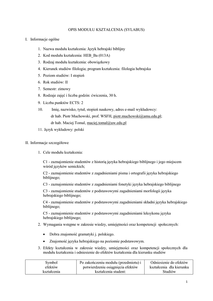 OPIS MODUŁU KSZTAŁCENIA (SYLABUS) I. Informacje ogólne 1. Nazwa modułu kształcenia: Język hebrajski biblijny 2. Kod modułu kształcenia: HEB_Ba (013A) 3. Rodzaj modułu kształcenia: obowiązkowy 4. Kierunek studiów filologia; program kształcenia: filologia hebrajska 5. Poziom studiów: I stopień 6. Rok studiów: II 7. Semestr: zimowy 8. Rodzaje zajęć i liczba godzin: ćwiczenia, 30 h. 9. Liczba punktów ECTS: 2 Imię, nazwisko, tytuł, stopień naukowy, adres e-mail wykładowcy: 10. dr hab. Piotr Muchowski, prof. WSFH, [email protected]; dr hab. Maciej Tomal, [email protected] 11. Język wykładowy: polski II. Informacje szczegółowe 1. Cele modułu kształcenia: C1 - zaznajomienie studentów z historią języka hebrajskiego biblijnego i jego miejscem wśród języków semickich; C2 - zaznajomienie studentów z zagadnieniami pisma i ortografii języka hebrajskiego biblijnego; C3 - zaznajomienie studentów z zagadnieniami fonetyki języka hebrajskiego biblijnego C3 - zaznajomienie studentów z podstawowymi zagadnieniami morfologii języka hebrajskiego biblijnego; C4 - zaznajomienie studentów z podstawowymi zagadnieniami składni języka hebrajskiego biblijnego; C5 - zaznajomienie studentów z podstawowymi zagadnieniami leksykonu języka hebrajskiego biblijnego; 2. Wymagania wstępne w zakresie wiedzy, umiejętności oraz kompetencji społecznych: Dobra znajomość gramatyki j. polskiego. Znajomość języka hebrajskiego na poziomie podstawowym. 3. Efekty kształcenia w zakresie wiedzy, umiejętności oraz kompetencji społecznych dla modułu kształcenia i odniesienie do efektów kształcenia dla kierunku studiów Symbol efektów kształcenia Po zakończeniu modułu (przedmiotu) i potwierdzeniu osiągnięcia efektów kształcenia student: Odniesienie do efektów kształcenia dla kierunku Studiów 1 - zna historię języka hebrajskiego biblijnego jego definicję typologiczną - potrafi czytać teksty w języku hebrajskim biblijnym - rozpoznaje omówione formy gramatyczne imion - tworzy omówione formy gramatyczne imion - rozpoznaje omówione formy czasownikowe HEB_Ba_01 HEB_Ba_02 HEB_Ba_03 HEB_Ba_04 HEB_Ba_05 FH_W06, FH_W09, FH_W10 FH_U02, FH_U06, FH_U08 FH_W06, FH_W09, FH_W10 FH_U02, FH_U06, FH_U08 FH_W06, FH_W09, FH_W10 HEB_Ba_06 - tworzy omówione formy czasownikowe FH_U02, FH_U06, FH_U08 HEB_Ba_07 - dokonuje analizy morfologicznej i syntaktycznej oraz przekładu wybranych FH_U02, FH_U06, FH_U08 tekstów w hebrajskim biblijnym. 4. Treści kształcenia Nazwa modułu kształcenia: Język hebrajski biblijny Symbol treści kształcenia TK_01 TK_02 Opis treści kształcenia Historia języka hebrajskiego w okresie starożytnym Pisownia i ortografia języka hebrajskiego biblijnego Odniesienie do efektów kształcenia modułu HEB_Ba_01 HEB_Ba_02 TK_03 Fonetyka języka hebrajskiego biblijnego HEB_Ba_02 TK_04 Wybrane zagadnienia morfologii języka hebrajskiego HEB_Ba_03, HEB_Ba_04, HEB_Ba_05, HEB_Ba_06 TK_05 Wybrane zagadnienia składni i słownictwa języka hebrajskiego biblijnego HEB_Ba_03, HEB_Ba_04, HEB_Ba_05, HEB_Ba_06, HEB_Ba_07 5. Zalecana literatura Biblia Hebraica Stuttgartensia 1997. K. Elliger, W. Rudolf, ed., w. 5. Stuttgart: Deutsche Bibelgesellschaft. Biblia, to jest Pismo Święte Starego i Nowego Testamentu 1975. Warszawa: Brytyjskie i Zagraniczne Towarzystwo Biblijne. BDB, Brown, F., S.R. Driver, C.A. Briggs, W. Gesenius 2001. Hebrew-Aramaic and English Lexicon, BibleWorks, LLC. Brown, F., S. Driver & C. Briggs 1996. Hebrew and English Lexicon. Peabody, Massachusetts: Hendrickson. BW9, BibleWorks9. 2011. Norfolk VA: Bible Work, LLC, www.bibleworks.com. Deiana G. i A. Spreafico. 2001. Wprowadzenie do hebrajszczyzny biblijnej, Warszawa: Towarzystwo biblijne w Polsce. 2 HALOT, Koehler, L., W. Baumgartner & J.J. Stamm 2000, The Hebrew & Aramaic Lexicon of the Old Testament, CD-ROM Edition, Brill, Leiden. Kutscher, E.Y. 1982. A History of the Hebrew Language, Magnes Press: Jerusalem, Leiden: Brill. Lambdin T. O. 2011. Wprowadzenie do hebrajskiego biblijnego, Lublin: KUL. Muchowski, P. 2001. Hebrajski qumrański jako język mówiony. Poznań: Wydawnictwo Naukowe UAM. Tomal M. 2000. Język hebrajski biblijny. Warszawa: Wydawnictwo Akademickie DIALOG. Waltke, B.K., M. O’Connor 1990. An Introduction to Biblical Hebrew Syntax. Winona Lake, Indiana: Eisenbraus. 6. Informacja o przewidywanej możliwości wykorzystania b-learningu Istnieje możliwość elektronicznych konsultacji z prowadzącym zajęcia po wcześniejszym pisemnym ustaleniu zasad współpracy. 7. Informacja o tym, gdzie można zapoznać się z materiałami do zajęć, instrukcjami do laboratorium, itp. Wskazane książki znajdują się w większości w Bibliotece Wyższej Szkoły Filologii Hebrajskiej. Książki niedostępne w bibliotekach mogą być wypożyczane od wykładowcy. III. Informacje dodatkowe 1. Odniesienie efektów kształcenia i treści kształcenia do sposobów prowadzenia i metod oceniania Symbol efektu kształcenia dla modułu HEB_Ba_01 HEB_Ba_02 HEB_Ba_03 HEB_Ba_04 HEB_Ba_05 HEB_Ba_06 Nazwa modułu: Język hebrajski biblijny Sposoby prowadzenia zajęć Symbol treści kształcenia umożliwiające osiągnięcie realizowanych w trakcie założonych efektów zajęć kształcenia Wprowadzenie teoretyczne TK_01 dyskusja ćwiczenia zajęć Metody oceniania stopnia osiągnięcia założonego efektu kształcenia F — zaliczenie P — zaliczenie semestru TK_02, TK_03 Wprowadzenie teoretyczne dyskusja ćwiczenia F — zaliczenie P — zaliczenie semestru TK_04, TK_05 Wprowadzenie teoretyczne dyskusja ćwiczenia F — zaliczenie P — zaliczenie semestru TK_04, TK_05 Wprowadzenie teoretyczne dyskusja ćwiczenia F — zaliczenie P — zaliczenie semestru TK_04, TK_05 Wprowadzenie teoretyczne dyskusja ćwiczenia F — zaliczenie P — zaliczenie semestru Wprowadzenie teoretyczne F — zaliczenie P — zaliczenie TK_04, TK_05 3 TK_05 HEB_Ba_07 dyskusja ćwiczenia semestru Wprowadzenie teoretyczne dyskusja 