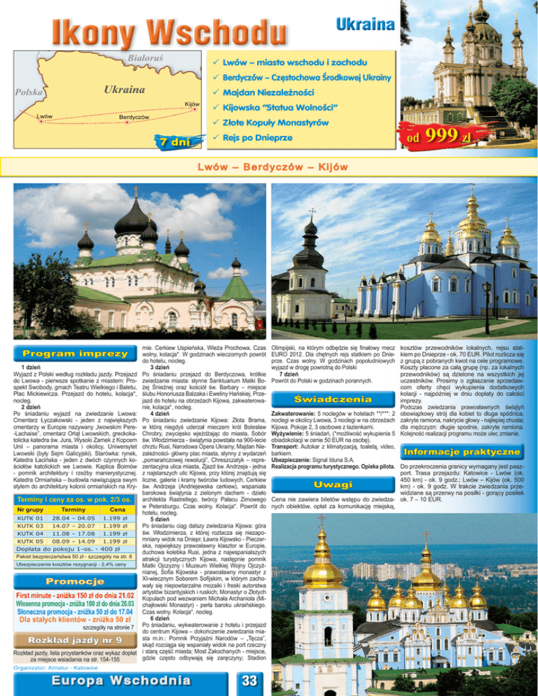 Ikony Wschodu Białoruś Lwów – miasto wschodu i zachodu Berdyczów – Częstochowa Środkowej Ukrainy Ukraina Polska Majdan Niezależności Kijów Lwów Berdyczów Kijowska “Statua Wolności” Złote Kopuły Monastyrów 7 dni Rejs po Dnieprze od 999 zł Lwów – Berdyczów – Kijów Program imprezy 1 dzień Wyjazd z Polski według rozkładu jazdy. Przejazd do Lwowa - pierwsze spotkanie z miastem: Prospekt Swobody, gmach Teatru Wielkiego i Baletu, Plac Mickiewicza. Przejazd do hotelu, kolacja*, nocleg. 2 dzień Po śniadaniu wyjazd na zwiedzanie Lwowa: Cmentarz Łyczakowski - jeden z największych cmentarzy w Europie nazywany „lwowskim Pere-Lachaise”, cmentarz Orląt Lwowskich, greckokatolicka katedra św. Jura, Wysoki Zamek z Kopcem Unii – panorama miasta i okolicy, Uniwersytet Lwowski (były Sejm Galicyjski). Starówka: rynek, Katedra Łacińska - jeden z dwóch czynnych kościołów katolickich we Lwowie. Kaplica Boimów - pomnik architektury i rzeźby manierystycznej. Katedra Ormiańska – budowla nawiązująca swym stylem do architektury kolonii ormiańskich na Kry- Terminy i ceny za os. w pok. 2/3 os. Nr grupy Terminy KUTK 01 28.04 – 04.05 1.199 zł Cena KUTK 03 14.07 – 20.07 1.199 zł KUTK 04 11.08 – 17.08 1.199 zł KUTK 05 08.09 – 14.09 1.199 zł Dopłata do pokoju 1-os. - 400 zł Pakiet bezpieczeństwa 50 zł - szczegóły na str. 6 Ubezpieczenie kosztów rezygnacji - 2,4% ceny Promocje First minute - zniżka 150 zł do dnia 21.02 Wiosenna promocja - zniżka 100 zł do dnia 20.03 Słoneczna promocja - zniżka 50 zł do 17.04 Dla stałych klientów - zniżka 50 zł szczegóły na stronie 7 Rozkład jazdy nr 9 Rozkład jazdy, lista przystanków oraz wykaz dopłat za miejsce wsiadania na str. 154-155 mie. Cerkiew Uspieńska, Wieża Prochowa. Czas wolny, kolacja*. W godzinach wieczornych powrót do hotelu, nocleg. 3 dzień Po śniadaniu przejazd do Berdyczowa, krótkie zwiedzanie miasta: słynne Sanktuarium Matki Bożej Śnieżnej oraz kościół św. Barbary – miejsce ślubu Honoriusza Balzaka i Eweliny Hańskiej. Przejazd do hotelu na obrzeżach Kijowa, zakwaterowanie, kolacja*, nocleg. 4 dzień Po śniadaniu zwiedzanie Kijowa: Złota Brama, w którą niegdyś uderzał mieczem król Bolesław Chrobry, zwycięsko wjeżdżając do miasta, Sobór św. Włodzimierza - świątynia powstała na 900-lecie chrztu Rusi, Narodowa Opera Ukrainy, Majdan Niezależności- główny plac miasta, słynny z wydarzeń „pomarańczowej rewolucji”, Chreszczatyk – reprezentacyjna ulica miasta, Zjazd św. Andrzeja - jedna z najstarszych ulic Kijowa, przy której znajdują się liczne, galerie i kramy twórców ludowych, Cerkiew św. Andrzeja (Andriejewska cerkiew), wspaniała barokowa świątynia z zielonym dachem - dzieło architekta Rastrellego, twórcy Pałacu Zimowego w Petersburgu. Czas wolny. Kolacja*. Powrót do hotelu, nocleg. 5 dzień Po śniadaniu ciąg dalszy zwiedzania Kijowa: góra św. Włodzimierza, z której roztacza się niezapomniany widok na Dniepr, Ławra Kijowsko - Pieczerska, największy prawosławny klasztor w Europie, duchowa kolebka Rusi, jedna z najwspanialszych atrakcji turystycznych Kijowa, następnie pomnik Matki Ojczyzny i Muzeum Wielkiej Wojny Ojczyźnianej, Sofia Kijowska - prawosławny monastyr z XI-wiecznym Soborem Sofijskim, w którym zachowały się niepowtarzalne mozaiki i freski autorstwa artystów bizantyjskich i ruskich; Monastyr o Złotych Kopułach pod wezwaniem Michała Archanioła (Michajłowski Monastyr) - perła baroku ukraińskiego. Czas wolny. Kolacja*, nocleg. 6 dzień Po śniadaniu, wykwaterowanie z hotelu i przejazd do centrum Kijowa – dokończenie zwiedzania miasta m.in.: Pomnik Przyjaźni Narodów – „Tęcza”, skąd rozciąga się wspaniały widok na port rzeczny i starą część miasta; Most Zakochanych - miejsce, gdzie często odbywają się zaręczyny; Stadion Organizator: Almatur - Katowice Europa Wschodnia 33 Olimpijski, na którym odbędzie się finałowy mecz EURO 2012. Dla chętnych rejs statkiem po Dnieprze. Czas wolny. W godzinach popołudniowych wyjazd w drogę powrotną do Polski 7 dzień Powrót do Polski w godzinach porannych. kosztów przewodników lokalnych, rejsu statkiem po Dnieprze - ok. 70 EUR. Pilot rozlicza się z grupą z pobranych kwot na cele programowe. Koszty płacone za całą grupę (np. za lokalnych przewodników) są dzielone na wszystkich jej uczestników. Prosimy o zgłaszanie sprzedawcom oferty chęci wykupienia dodatkowych kolacji - najpóźniej w dniu dopłaty do całości Świadczenia imprezy. Podczas zwiedzania prawosławnych świątyń Zakwaterowanie: 5 noclegów w hotelach **/***: 2 obowiązkowy strój dla kobiet to długa spódnica, noclegi w okolicy Lwowa, 3 noclegi w na obrzeżach zakryte ramiona, nakrycie głowy - najlepiej chusta; Kijowa. Pokoje 2, 3 osobowe z łazienkami. dla mężczyzn: długie spodnie, zakryte ramiona. Wyżywienie: 5 śniadań, (*możliwość wykupienia 5 Kolejność realizacji programu może ulec zmianie. obiadokolacji w cenie 50 EUR na osobę). Transport: Autokar z klimatyzacją, toaletą, video, Informacje praktyczne barkiem. Ubezpieczenie: Signal Iduna S.A. Realizacja programu turystycznego. Opieka pilota. Do przekroczenia granicy wymagany jest paszport. Trasa przejazdu: Katowice - Lwów (ok. 450 km) - ok. 9 godz.; Lwów – Kijów (ok. 500 Uwagi km) - ok. 9 godz. W trakcie zwiedzania przewidziane są przerwy na posiłki - gorący posiłek Cena nie zawiera biletów wstępu do zwiedza- ok. 7 – 10 EUR. nych obiektów, opłat za komunikację miejską,