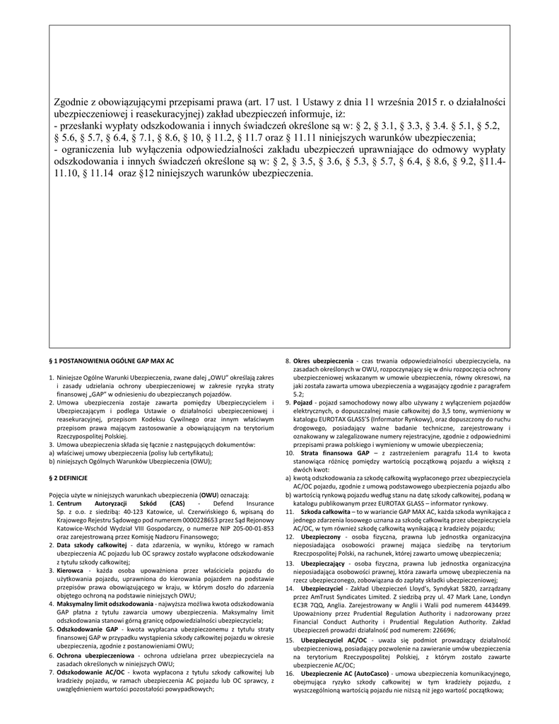 Zgodnie z obowiązującymi przepisami prawa (art. 17 ust. 1 Ustawy z dnia 11 września 2015 r. o działalności ubezpieczeniowej i reasekuracyjnej) zakład ubezpieczeń informuje, iż: - przesłanki wypłaty odszkodowania i innych świadczeń określone są w: § 2, § 3.1, § 3.3, § 3.4. § 5.1, § 5.2, § 5.6, § 5.7, § 6.4, § 7.1, § 8.6, § 10, § 11.2, § 11.7 oraz § 11.11 niniejszych warunków ubezpieczenia; - ograniczenia lub wyłączenia odpowiedzialności zakładu ubezpieczeń uprawniające do odmowy wypłaty odszkodowania i innych świadczeń określone są w: § 2, § 3.5, § 3.6, § 5.3, § 5.7, § 6.4, § 8.6, § 9.2, §11.411.10, § 11.14 oraz §12 niniejszych warunków ubezpieczenia. § 1 POSTANOWIENIA OGÓLNE GAP MAX AC 1. Niniejsze Ogólne Warunki Ubezpieczenia, zwane dalej „OWU” określają zakres i zasady udzielania ochrony ubezpieczeniowej w zakresie ryzyka straty finansowej „GAP” w odniesieniu do ubezpieczanych pojazdów. 2. Umowa ubezpieczenia zostaje zawarta pomiędzy Ubezpieczycielem i Ubezpieczającym i podlega Ustawie o działalności ubezpieczeniowej i reasekuracyjnej, przepisom Kodeksu Cywilnego oraz innym właściwym przepisom prawa mającym zastosowanie a obowiązującym na terytorium Rzeczypospolitej Polskiej. 3. Umowa ubezpieczenia składa się łącznie z następujących dokumentów: a) właściwej umowy ubezpieczenia (polisy lub certyfikatu); b) niniejszych Ogólnych Warunków Ubezpieczenia (OWU); § 2 DEFINICJE Pojęcia użyte w niniejszych warunkach ubezpieczenia (OWU) oznaczają: 1. Centrum Autoryzacji Szkód (CAS) Defend Insurance Sp. z o.o. z siedzibą: 40-123 Katowice, ul. Czerwińskiego 6, wpisaną do Krajowego Rejestru Sądowego pod numerem 0000228653 przez Sąd Rejonowy Katowice-Wschód Wydział VIII Gospodarczy, o numerze NIP 205-00-01-853 oraz zarejestrowaną przez Komisję Nadzoru Finansowego; 2. Data szkody całkowitej - data zdarzenia, w wyniku, którego w ramach ubezpieczenia AC pojazdu lub OC sprawcy zostało wypłacone odszkodowanie z tytułu szkody całkowitej; 3. Kierowca - każda osoba upoważniona przez właściciela pojazdu do użytkowania pojazdu, uprawniona do kierowania pojazdem na podstawie przepisów prawa obowiązującego w kraju, w którym doszło do zdarzenia objętego ochroną na podstawie niniejszych OWU; 4. Maksymalny limit odszkodowania - najwyższa możliwa kwota odszkodowania GAP płatna z tytułu zawarcia umowy ubezpieczenia. Maksymalny limit odszkodowania stanowi górną granicę odpowiedzialności ubezpieczyciela; 5. Odszkodowanie GAP - kwota wypłacana ubezpieczonemu z tytułu straty finansowej GAP w przypadku wystąpienia szkody całkowitej pojazdu w okresie ubezpieczenia, zgodnie z postanowieniami OWU; 6. Ochrona ubezpieczeniowa - ochrona udzielana przez ubezpieczyciela na zasadach określonych w niniejszych OWU; 7. Odszkodowanie AC/OC - kwota wypłacona z tytułu szkody całkowitej lub kradzieży pojazdu, w ramach ubezpieczenia AC pojazdu lub OC sprawcy, z uwzględnieniem wartości pozostałości powypadkowych; 8. Okres ubezpieczenia - czas trwania odpowiedzialności ubezpieczyciela, na zasadach określonych w OWU, rozpoczynający się w dniu rozpoczęcia ochrony ubezpieczeniowej wskazanym w umowie ubezpieczenia, równy okresowi, na jaki została zawarta umowa ubezpieczenia a wygasający zgodnie z paragrafem 5.2; 9. Pojazd - pojazd samochodowy nowy albo używany z wyłączeniem pojazdów elektrycznych, o dopuszczalnej masie całkowitej do 3,5 tony, wymieniony w katalogu EUROTAX GLASS’S (Informator Rynkowy), oraz dopuszczony do ruchu drogowego, posiadający ważne badanie techniczne, zarejestrowany i oznakowany w zalegalizowane numery rejestracyjne, zgodnie z odpowiednimi przepisami prawa polskiego i wymieniony w umowie ubezpieczenia; 10. Strata finansowa GAP – z zastrzeżeniem paragrafu 11.4 to kwota stanowiąca różnicę pomiędzy wartością początkową pojazdu a większą z dwóch kwot: a) kwotą odszkodowania za szkodę całkowitą wypłaconego przez ubezpieczyciela AC/OC pojazdu, zgodnie z umową podstawowego ubezpieczenia pojazdu albo b) wartością rynkową pojazdu według stanu na datę szkody całkowitej, podaną w katalogu publikowanym przez EUROTAX GLASS – informator rynkowy. 11. Szkoda całkowita – to w wariancie GAP MAX AC, każda szkoda wynikająca z jednego zdarzenia losowego uznana za szkodę całkowitą przez ubezpieczyciela AC/OC, w tym również szkodę całkowitą wynikającą z kradzieży pojazdu; 12. Ubezpieczony - osoba fizyczna, prawna lub jednostka organizacyjna nieposiadająca osobowości prawnej mająca siedzibę na terytorium Rzeczpospolitej Polski, na rachunek, której zawarto umowę ubezpieczenia; 13. Ubezpieczający - osoba fizyczna, prawna lub jednostka organizacyjna nieposiadająca osobowości prawnej, która zawarła umowę ubezpieczenia na rzecz ubezpieczonego, zobowiązana do zapłaty składki ubezpieczeniowej; 14. Ubezpieczyciel - Zakład Ubezpieczeń Lloyd’s, Syndykat 5820, zarządzany przez AmTrust Syndicates Limited. Z siedzibą przy ul. 47 Mark Lane, Londyn EC3R 7QQ, Anglia. Zarejestrowany w Anglii i Walii pod numerem 4434499. Upoważniony przez Prudential Regulation Authority i nadzorowany przez Financial Conduct Authority i Prudential Regulation Authority. Zakład Ubezpieczeń prowadzi działalność pod numerem: 226696; 15. Ubezpieczyciel AC/OC - uważa się podmiot prowadzący działalność ubezpieczeniową, posiadający pozwolenie na zawieranie umów ubezpieczenia na terytorium Rzeczypospolitej Polskiej, z którym zostało zawarte ubezpieczenie AC/OC; 16. Ubezpieczenie AC (AutoCasco) - umowa ubezpieczenia komunikacyjnego, obejmująca ryzyko szkody całkowitej w tym kradzieży pojazdu, z wyszczególnioną wartością pojazdu nie niższą niż jego wartość początkowa; 17. Ubezpieczenie OC - obowiązkowe ubezpieczenie odpowiedzialności cywilnej posiadaczy pojazdów mechanicznych na podstawie którego, udzielana jest ochrona z tytułu skutkó