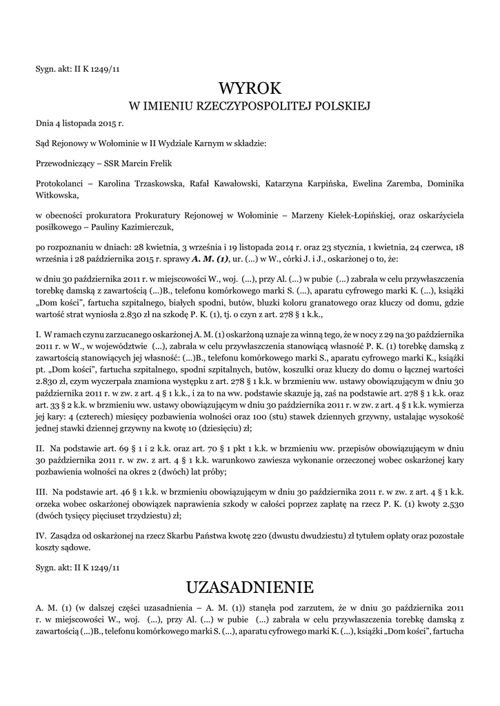 Sygn. akt: II K 1249/11 WYROK W IMIENIU RZECZYPOSPOLITEJ POLSKIEJ Dnia 4 listopada 2015 r. Sąd Rejonowy w Wołominie w II Wydziale Karnym w składzie: Przewodniczący – SSR Marcin Frelik Protokolanci – Karolina Trzaskowska, Rafał Kawałowski, Katarzyna Karpińska, Ewelina Zaremba, Dominika Witkowska, w obecności prokuratora Prokuratury Rejonowej w Wołominie – Marzeny Kiełek-Łopińskiej, oraz oskarżyciela posiłkowego – Pauliny Kazimierczuk, po rozpoznaniu w dniach: 28 kwietnia, 3 września i 19 listopada 2014 r. oraz 23 stycznia, 1 kwietnia, 24 czerwca, 18 września i 28 października 2015 r. sprawy A. M. (1), ur. (...) w W., córki J. i J., oskarżonej o to, że: w dniu 30 października 2011 r. w miejscowości W., woj. (...), przy Al. (...) w pubie (...) zabrała w celu przywłaszczenia torebkę damską z zawartością (...)B., telefonu komórkowego marki S. (...), aparatu cyfrowego marki K. (...), książki „Dom kości”, fartucha szpitalnego, białych spodni, butów, bluzki koloru granatowego oraz kluczy od domu, gdzie wartość strat wyniosła 2.830 zł na szkodę P. K. (1), tj. o czyn z art. 278 § 1 k.k., I. W ramach czynu zarzucanego oskarżonej A. M. (1) oskarżoną uznaje za winną tego, że w nocy z 29 na 30 października 2011 r. w W., w województwie (...), zabrała w celu przywłaszczenia stanowiącą własność P. K. (1) torebkę damską z zawartością stanowiących jej własność: (...)B., telefonu komórkowego marki S., aparatu cyfrowego marki K., książki pt. „Dom kości”, fartucha szpitalnego, spodni szpitalnych, butów, koszulki oraz kluczy do domu o łącznej wartości 2.830 zł, czym wyczerpała znamiona występku z art. 278 § 1 k.k. w brzmieniu ww. ustawy obowiązującym w dniu 30 października 2011 r. w zw. z art. 4 § 1 k.k., i za to na ww. podstawie skazuje ją, zaś na podstawie art. 278 § 1 k.k. oraz art. 33 § 2 k.k. w brzmieniu ww. ustawy obowiązującym w dniu 30 października 2011 r. w zw. z art. 4 § 1 k.k. wymierza jej kary: 4 (czterech) miesięcy pozbawienia wolności oraz 100 (stu) stawek dziennych grzywny, ustalając wysokość jednej stawki dziennej grzywny na kwotę 10 (dziesięciu) zł; II. Na podstawie art. 69 § 1 i 2 k.k. oraz art. 70 § 1 pkt 1 k.k. w brzmieniu ww. przepisów obowiązującym w dniu 30 października 2011 r. w zw. z art. 4 § 1 k.k. warunkowo zawiesza wykonanie orzeczonej wobec oskarżonej kary pozbawienia wolności na okres 2 (dwóch) lat próby; III. Na podstawie art. 46 § 1 k.k. w brzmieniu obowiązującym w dniu 30 października 2011 r. w zw. z art. 4 § 1 k.k. orzeka wobec oskarżonej obowiązek naprawienia szkody w całości poprzez zapłatę na rzecz P. K. (1) kwoty 2.530 (dwóch tysięcy pięciuset trzydziestu) zł; IV. Zasądza od oskarżonej na rzecz Skarbu Państwa kwotę 220 (dwustu dwudziestu) zł tytułem opłaty oraz pozostałe koszty sądowe. Sygn. akt: II K 1249/11 UZASADNIENIE A. M. (1) (w dalszej części uzasadnienia – A. M. (1)) stanęła pod zarzutem, że w dniu 30 października 2011 r. w miejscowości W., woj. (...), przy Al. (...) w pubie (...) zabrała w celu przywłaszczenia torebkę damską z zawartością (...)B., telefonu komórkowego marki S. (...), aparatu cyfrowego marki K. (...), książki „Dom kości”, fartucha szpitalnego, białych spodni, butów, bluzki koloru granatowego oraz kluczy od domu, gdzie wartość strat wyniosła 2.830 zł na szkodę P. K. (1) tj. popełnienia czynu z art. 278 § 1 k.k. Na podstawie całokształtu materiału dowodowego zgromadzonego w aktach sprawy i ujawnionego w toku rozprawy głównej sąd ustalił następujący stan faktyczny: Wieczorem 29 października 2011 r. w pubie (...) położonym przy Alei (...) w W. odbywała się impreza urodzinowa R. J., na której byli obecni m.in.: ww. mężczyzna, A. M. (1), A. M. (2), K. M., P. K. (1), P. K. (2), M. K., M. Z., J. T., M. W., B. O. i K. B.. Rzeczy osobiste uczestników imprezy, w tym kurtki oraz torebki damskie, w trakcie jej trwania znajdowały się na sofach, na których ww. osoby siedziały. W pewnym momencie A. M. (1) siedząc na sofie sięgnęła po torebkę damską należącą do P. K. (1), po czym zaczęła przeszukiwać jej zawartość. Przy stoliku siedziała wówczas również P. K. (2). Podeszła również do niego A. M. (2), która po chwili rozpoczęła rozmowę z P. K. (2). Pozostali uczestnicy imprezy znajdowali się wówczas w innych częściach lokalu oraz przed nim. A. M. (1) wzięła leżącą na sofie perukę, położyła ją na torebce pokrzywdzonej w ten sposób, że zakryła ją, a następnie wstała trzymając w rękach ww. torebkę i opuściła miejsce zajmowane przez uczestników imprezy. Po odejściu kilku metrów od stolika oskarżona odrzuciła na bok ww. perukę. Po kilku minutach A. M. (1) wróciła do stolika zajmowanego przez uczestników imprezy urodzinowej R. J., a następnie m.in. wraz z B. O. i J. T. opuściła pub (...) i taksówką udała się do swego domu. W międzyczasie do stolika zajmowanego przez uczestników przedmiotowej imprezy powróciły P. K. (1) oraz M. K.. Pierwsza z ww. kobiet po chwili zorientowała się, że na sofie nie ma należącej do niej torebki, w której znajdowały się: (...)B., telefon komórkowy marki S., aparat cyfrowy marki K., książka pt. „Dom kości”, fartuch szpitalny, spodnie szpitalne, buty, koszulka oraz klucze do jej domu. Wartość skradzionych na szkodę pokrzywdzonej rzeczy wyniosła łącznie 2.830 zł. Przedstawiony powyżej stan faktyczny sąd ustalił na podstawie: pozytywnie zweryfikowanej części wyjaśnień oskarżonej A. M. (1) (k. 102v.-103v., 105-105v. i 148), pozytywnie zweryfikowanej części zeznań świadków: P. K. (1) (k. 2-3, 50v.-52v., 103v.-105, 147v.-148 i 200-200v. akt niniejszej sprawy oraz k. 19v.-20 akt sprawy V K 221/12 toczącej się przed Sądem Rejonowym w Wołominie), M. K. (k. 65v. i 121v.-122v.), A. M. (2) (k. 35v. i 122v.-123), K. M. (k. 36v. i 142), P. K. (2) (k. 174v