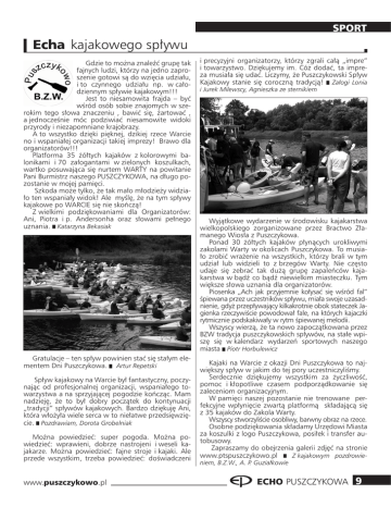 SPORT Echa kajakowego spływu Gdzie to można znaleźć grupę tak fajnych ludzi, którzy na jedno zaproszenie gotowi są do wzięcia udziału, i to czynnego udziału np. w całodziennym spływie kajakowym!!! Jest to niesamowita frajda – być wśród osób sobie znajomych w szerokim tego słowa znaczeniu , bawić się, żartować , a jednocześnie móc podziwiać niesamowite widoki przyrody i niezapomniane krajobrazy. A to wszystko dzięki pięknej, dzikiej rzece Warcie no i wspaniałej organizacji takiej imprezy! Brawo dla organizatorów!!! Platforma 35 żółtych kajaków z kolorowymi balonikami i 70 załogantami w zielonych koszulkach, wartko posuwająca się nurtem WARTY na powitanie Pani Burmistrz naszego PUSZCZYKOWA, na długo pozostanie w mojej pamięci. Szkoda może tylko, że tak mało młodzieży widziało ten wspaniały widok! Ale myślę, że na tym spływy kajakowe po WARCIE się nie skończą! Z wielkimi podziękowaniami dla Organizatorów: Ani, Piotra i p. Andersonha oraz słowami pełnego uznania. Katarzyna Bekasiak Gratulacje – ten spływ powinien stać się stałym elementem Dni Puszczykowa. Artur Repetski Spływ kajakowy na Warcie był fantastyczny, poczynając od profesjonalnej organizacji, wspaniałego towarzystwa a na sprzyjającej pogodzie kończąc. Mam nadzieję, że to był dobry początek do kontynuacji „tradycji” spływów kajakowych. Bardzo dziękuję Ani, która włożyła wiele serca w to niełatwe przedsięwzięcie. Pozdrawiam, Dorota Grobelniak Można powiedzieć: super pogoda. Można powiedzieć: wprawieni, dobrze nastrojeni i weseli kajakarze. Można powiedzieć: fajne stroje i kajaki. Ale przede wszystkim, trzeba powiedzieć: doświadczeni www.puszczykowo.pl i precyzyjni organizatorzy, którzy zgrali całą „impre” i towarzystwo. Dziękujemy im. Cóż dodać, ta impreza musiała się udać. Liczymy, że Puszczykowski Spływ Kajakowy stanie się coroczną tradycją! Załogi Lonia i Jurek Milewscy, Agnieszka ze sternikiem Wyjątkowe wydarzenie w środowisku kajakarstwa wielkopolskiego zorganizowane przez Bractwo Złamanego Wiosła z Puszczykowa. Ponad 30 żółtych kajaków płynących urokliwymi zakolami Warty w okolicach Puszczykowa. To musiało zrobić wrażenie na wszystkich, którzy brali w tym udział lub widzieli to z brzegów Warty. Nie często udaje się zebrać tak dużą grupę zapaleńców kajakarstwa w bądź co bądź niewielkim miasteczku. Tym większe słowa uznania dla organizatorów. Piosenka „Ach jak przyjemnie kołysać się wśród fal” śpiewana przez uczestników spływu, miała swoje uzasadnienie, gdyż przepływający kilkakrotnie obok stateczek Jagienka rzeczywiście powodował fale, na których kajaczki rytmicznie podskakiwały w rytm śpiewanej melodii. Wszyscy wierzą, że ta nowo zapoczątkowana przez BZW tradycja puszczykowskich spływów, na stałe wpiszę się w kalendarz wydarzeń sportowych naszego miasta Piotr Horbulewicz Kajaki na Warcie z okazji Dni Puszczykowa to największy spływ w jakim do tej pory uczestniczyliśmy. Serdecznie dziękujemy wszystkim za życzliwość, pomoc i kłopotliwe czasem podporządkowanie się zaleceniom organizacyjnym. W pamięci naszej pozostanie nie trenowane perfekcyjne wpłynięcie zwartą platformą składającą się z 35 kajaków do Zakola Warty. Wszyscy stworzyliście osobliwy, barwny obraz na rzece. Osobne podziękowania składamy Urzędowi Miasta za koszulki z logo Puszczykowa, posiłek i transfer autobusowy. Zapraszamy do obejrzenia galerii zdjęć na stronie www.ptspuszczykowo.pl Z kajakowym pozdrowieniem, B.Z.W., A. P. Guziałkowie ECHO PUSZCZYKOWA