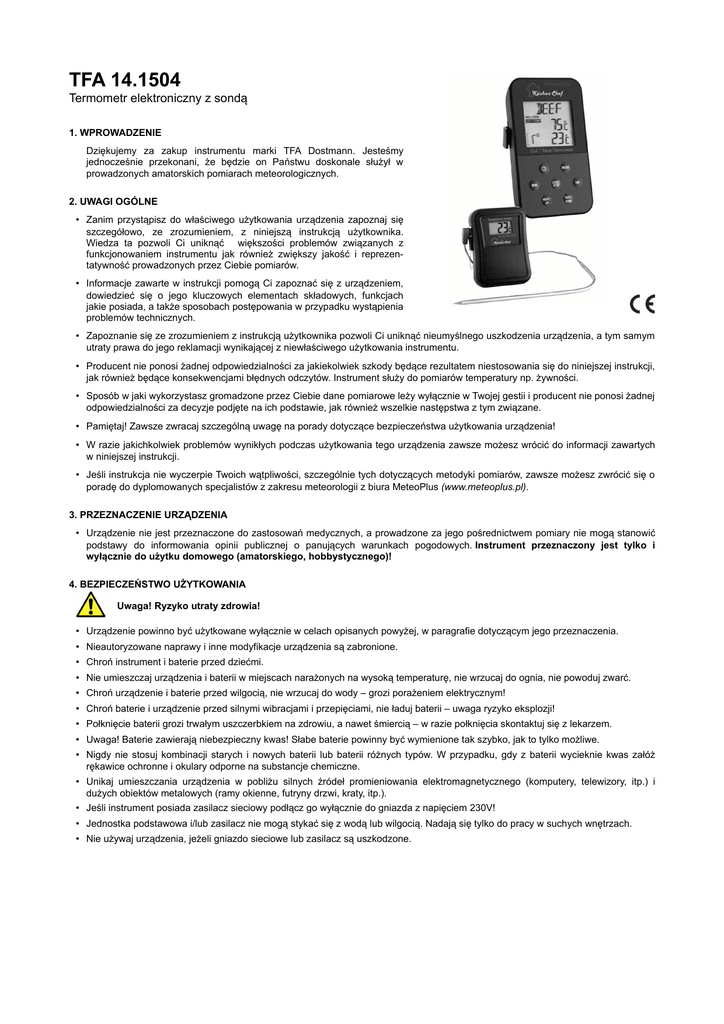 TFA 14.1504 Termometr elektroniczny z sondą 1. WPROWADZENIE Dziękujemy za zakup instrumentu marki TFA Dostmann. Jesteśmy jednocześnie przekonani, że będzie on Państwu doskonale służył w prowadzonych amatorskich pomiarach meteorologicznych. 2. UWAGI OGÓLNE • Zanim przystąpisz do właściwego użytkowania urządzenia zapoznaj się szczegółowo, ze zrozumieniem, z niniejszą instrukcją użytkownika. Wiedza ta pozwoli Ci uniknąć większości problemów związanych z funkcjonowaniem instrumentu jak również zwiększy jakość i reprezentatywność prowadzonych przez Ciebie pomiarów. • Informacje zawarte w instrukcji pomogą Ci zapoznać się z urządzeniem, dowiedzieć się o jego kluczowych elementach składowych, funkcjach jakie posiada, a także sposobach postępowania w przypadku wystąpienia problemów technicznych. • Zapoznanie się ze zrozumieniem z instrukcją użytkownika pozwoli Ci uniknąć nieumyślnego uszkodzenia urządzenia, a tym samym utraty prawa do jego reklamacji wynikającej z niewłaściwego użytkowania instrumentu. • Producent nie ponosi żadnej odpowiedzialności za jakiekolwiek szkody będące rezultatem niestosowania się do niniejszej instrukcji, jak również będące konsekwencjami błędnych odczytów. Instrument służy do pomiarów temperatury np. żywności. • Sposób w jaki wykorzystasz gromadzone przez Ciebie dane pomiarowe leży wyłącznie w Twojej gestii i producent nie ponosi żadnej odpowiedzialności za decyzje podjęte na ich podstawie, jak również wszelkie następstwa z tym związane. • Pamiętaj! Zawsze zwracaj szczególną uwagę na porady dotyczące bezpieczeństwa użytkowania urządzenia! • W razie jakichkolwiek problemów wynikłych podczas użytkowania tego urządzenia zawsze możesz wrócić do informacji zawartych w niniejszej instrukcji. • Jeśli instrukcja nie wyczerpie Twoich wątpliwości, szczególnie tych dotyczących metodyki pomiarów, zawsze możesz zwrócić się o poradę do dyplomowanych specjalistów z zakresu meteorologii z biura MeteoPlus (www.meteoplus.pl). 3. PRZEZNACZENIE URZĄDZENIA • Urządzenie nie jest przeznaczone do zastosowań medycznych, a prowadzone za jego pośrednictwem pomiary nie mogą stanowić podstawy do informowania opinii publicznej o panujących warunkach pogodowych. Instrument przeznaczony jest tylko i wyłącznie do użytku domowego (amatorskiego, hobbystycznego)! 4. BEZPIECZEŃSTWO UŻYTKOWANIA Uwaga! Ryzyko utraty zdrowia! • Urządzenie powinno być użytkowane wyłącznie w celach opisanych powyżej, w paragrafie dotyczącym jego przeznaczenia. • Nieautoryzowane naprawy i inne modyfikacje urządzenia są zabronione. • Chroń instrument i baterie przed dziećmi. • Nie umieszczaj urządzenia i baterii w miejscach narażonych na wysoką temperaturę, nie wrzucaj do ognia, nie powoduj zwarć. • Chroń urządzenie i baterie przed wilgocią, nie wrzucaj do wody – grozi porażeniem elektrycznym! • Chroń baterie i urządzenie przed silnymi wibracjami i przepięciami, nie ładuj baterii – uwaga ryzyko eksplozji! • Połknięcie baterii grozi trwałym uszczerbkiem na zdrowiu, a nawet śmiercią – w razie połknięcia skontaktuj się z lekarzem. • Uwaga! Baterie zawierają niebezpieczny kwas! Słabe baterie powinny być wymienione tak szybko, jak to tylko możliwe. • Nigdy nie stosuj kombinacji starych i nowych baterii lub baterii różnych typów. W przypadku, gdy z baterii wycieknie kwas załóż rękawice ochronne i okulary odporne na substancje chemiczne. • Unikaj umieszczania urządzenia w pobliżu silnych źródeł promieniowania elektromagnetycznego (komputery, telewizory, itp.) i dużych obiektów metalowych (ramy okienne, futryny drzwi, kraty, itp.). • Jeśli instrument posiada zasilacz sieciowy podłącz go wyłącznie do gniazda z napięciem 230V! • Jednostka podstawowa i/lub zasilacz nie mogą stykać się z wodą lub wilgocią. Nadają się tylko do pracy w suchych wnętrzach. • Nie używaj urządzenia, jeżeli gniazdo sieciowe lub zasilacz są uszkodzone. 5. ZAKRES DOSTAWY • • • • • Jednostka główna – konsola Czujnik bezprzewodowy Czujnik szpilkowy ze stali nierdzewnej Baterie 4 x 1.5V AAA Instrukcja obsługi 6. PODSTAWOWA CHARAKTERYSTYKA • • • • • Pomiar temperatury wewnętrznej pożywienia Możliwość stosowania w piekarnikach i grillach Różne programy wg typu mięsa Alarm temperatury kiedy zadana wartość jest osiągnięta Funkcja minutnika 7. ELEMENTY SKŁADOWE 7.1. Konsola - jednostka podstawowa (Fig. 1): A: Wyświetlacz • A 1: Typ mięsa, temp. docelowa, temp. aktualna, symbol odbioru sugnału z czujnika B: Przyciski • B 1: przycisk ON/OFF • B 2: przycisk MODE • B 3: przycisk HR • B 4: przycisk TASTE/DOWN • B 5: przycisk MEAT/UP • B 6: przycisk MIN • B 7: przycisk START/STOP C: Obudowa: • C 1: Podpórka • C 2: Komora baterii 7.2. Czujnik bezprzewodowy (Fig. 2): D: Wyświetlacz • D 1: Temperatura aktualna E: Przyciski: • E 1: Przycisk C/F (jednostki) • E 2: ON/OFF F: Obudowa • F 1: Komora baterii (odkręcana) • F 2: Stojak (rozkładany) • F 3: Otwór wtykowy G: Sonda • G 1: Sonda metalowa • G 2: Przewód • G 3: Wtyk 8. URUCHOMIENIE URZĄDZENIA • • • • • • • • • • • • • • Odepnij elementy montażowy znajdujące się w tylnej części obu instrumentów. Odepnij gumową zatyczkę złącza sondy znajdująca się po lewej stronie czujnika. Umieść oba instrumenty na biurku w odległości ok. 1,5 metra. Upewnij się, że żadne inne urządzenia elektroniczne nie są blisko. Otwórz komorę baterii czujnika - wymaga odkręcenia. Włóż dwie nowe baterie alkaliczne lub litowe 1,5 V AAA, sprawdź czy bieguny baterii są ułożone poprawnie. Zamknij komorę baterii. Otwórz komorę baterii w konsoli i włóż dwie nowe baterie alkaliczne 1,5 V AAA, sprawdź czy bieguny baterii są ułożone poprawnie. Usłyszysz krótki sygnał dźwiękow