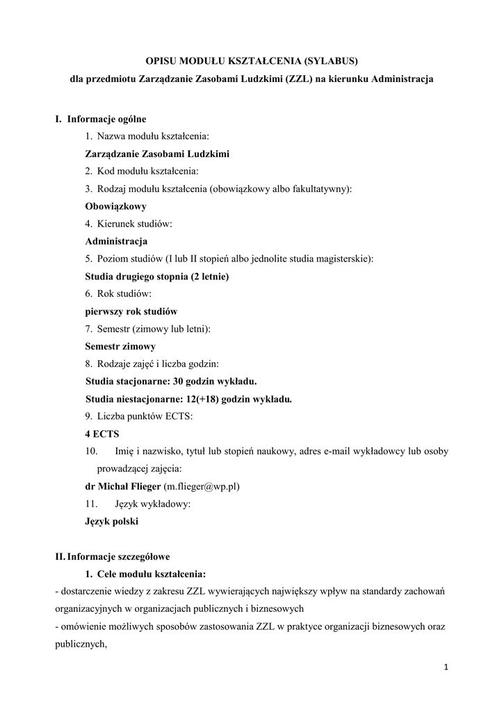 OPISU MODUŁU KSZTAŁCENIA (SYLABUS) dla przedmiotu Zarządzanie Zasobami Ludzkimi (ZZL) na kierunku Administracja I. Informacje ogólne 1. Nazwa modułu kształcenia: Zarządzanie Zasobami Ludzkimi 2. Kod modułu kształcenia: 3. Rodzaj modułu kształcenia (obowiązkowy albo fakultatywny): Obowiązkowy 4. Kierunek studiów: Administracja 5. Poziom studiów (I lub II stopień albo jednolite studia magisterskie): Studia drugiego stopnia (2 letnie) 6. Rok studiów: pierwszy rok studiów 7. Semestr (zimowy lub letni): Semestr zimowy 8. Rodzaje zajęć i liczba godzin: Studia stacjonarne: 30 godzin wykładu. Studia niestacjonarne: 12(+18) godzin wykładu. 9. Liczba punktów ECTS: 4 ECTS 10. Imię i nazwisko, tytuł lub stopień naukowy, adres e-mail wykładowcy lub osoby prowadzącej zajęcia: dr Michał Flieger ([email protected]) 11. Język wykładowy: Język polski II. Informacje szczegółowe 1. Cele modułu kształcenia: - dostarczenie wiedzy z zakresu ZZL wywierających największy wpływ na standardy zachowań organizacyjnych w organizacjach publicznych i biznesowych - omówienie możliwych sposobów zastosowania ZZL w praktyce organizacji biznesowych oraz publicznych, 1 - położenie nacisku na wzajemne powiązania występujące pomiędzy poszczególnymi koncepcjami i metodami zarządzania oraz ZZL - wskazanie możliwości budowania spójnego systemu koncepcji i metod zarzadzania oraz ich komplementarnego wspomagania się w aspekcie współczesnego ZZL 2. Wymagania wstępne w zakresie wiedzy, umiejętności oraz kompetencji społecznych (jeśli obowiązują): Brak szczególnych wymagań w zakresie wiedzy, umiejętności i kompetencji społecznych. 3. Efekty kształcenia w zakresie wiedzy, umiejętności oraz kompetencji społecznych dla modułu kształcenia i odniesienie do efektów kształcenia dla kierunku studiów: Symbol efektów kształcenia ZZL_01 ZZL _02 ZZL _03 ZZL_04 ZZL _05 ZZL_06 ZZL_07 Po zakończeniu modułu (przedmiotu) i potwierdzeniu osiągnięcia efektów kształcenia student potrafi: Znajomość podstawowych założeń współczesnego ZZL Wiedza na temat wpływu koncepcji zarządzania na skuteczność ZZL Wiedza na temat wzajemnych powiązań występujących pomiędzy poszczególnymi koncepcjami zarządzania, metodami i ZZL Umiejętność analizy organizacyjnej pod katem możliwości zastosowania praktyk i struktur ZZL Uzyskania postrzegania przez studenta ZZL jako spójnego, powiązanego wewnętrznie systemu Umiejętność zastosowania wiedzy z zakresu ZZL w procesie decyzyjnym Zrozumienie, że w zarządzaniu organizacjami ZZL odgrywają kluczową rolę Odniesienie do efektów kształcenia dla kierunku studiów K_W01-02, K_U01 K_W03-04, K_U02-03 K_W03-04, K_U02-03 K_W06, K_U04-06 K_W02-04, K_U03 K_W06, K_U06 K_W07, K_U04, K_K0506 4. Treści kształcenia: Nazwa modułu kształcenia: Symbol treści kształcenia Opis treści kształcenia Odniesienie do efektów kształcenia modułu TK_01 ZZL a administrowanie K_W01-04, K_U01-06 TK_02 Praktyki ZZL K_W01-04, K_U01-04 TK_03 Wsparcie ZZL koncepcjami i metodami zarządzania K_W01-04, K_U01-06, K_K05-06 2 TK_04 Modele ZZL K_W01-04, K_U01-06 TK_05 Rola HR managera w organizacji TK_06 Etyka w ZZL TK_07 Praktyka ZZL we współczesnych organizacjach TK_08 ZZL a koncepcje zarządzania TK_09 Wybrane metody zarządzania w aspekcie ZZL K_W01-04, K_W06-07, K_U01-05 K_W01-04, K_W06-07, K_U01-06 K_W01-04, K_U01-04, K_K05-06 K_W01-04, K_W06-07, K_U01-04 K_W01-04, K_U01-05, K_K05-06 5. Zalecana literatura: Dowolne dostępne na rynku wydawniczym aktualne podręczniki z zakresu makroekonomii dla zaawansowanych, polityki gospodarczej i ekonomii rozwoju. Literatura podstawowa: 1.M. Armstrong,, Zarządzanie zasobami ludzkimi, Wydawnictwo Naukowe PWN, Warszawa, wydanie bieżące. Literatura uzupełniająca: 1. J. Lisztwan, zarządzanie zasobami ludzkimi we współczesnych organizacjach, PWN, Warszawa, wydanie bieżące. 6. Informacja o tym, gdzie można zapoznać się z materiałami do zajęć, instrukcjami do laboratorium, itp.: Ewentualne informacje o charakterze i dostępności materiałów potrzebnych do zajęć przekazuje prowadzący zajęcia na początku roku akademickiego. III. Informacje dodatkowe 1. Odniesienie efektów kształcenia i treści kształcenia do sposobów prowadzenia zajęć i metod oceniania: Nazwa modułu (przedmiotu): Symbol Symbol treści efektu kształcenia kształcenia realizowanych w trakcie dla modułu zajęć ZZL_01 TK_01-09 Sposoby prowadzenia zajęć umożliwiające osiągnięcie założonych efektów kształcenia Wykład z wykorzystaniem własnych materiałów dydaktycznych Metody oceniania stopnia osiągnięcia założonego efektu kształcenia Egzamin pisemny w formie testu 3 ZZL_02 TK_01-05, 07 J.w. J.w. ZZL_03 TK_01-09 J.w. J.w. ZZL_04 TK_01-08 J.w. J.w. ZZL _05 TK_04-09 J.w. J.w. ZZL _06 TK_01-06, 08-09 J.w. J.w. ZZL _07 TK_01, 03, 07, 09 J.w. J.w. Przykładowe podstawowe pytania egzaminacyjne są identyczne jak ww. opisy poszczególnych treści kształcenia. 2. Obciążenie pracą studenta (punkty ECTS): Nazwa modułu (przedmiotu): Forma aktywności Godziny zajęć (wg planu studiów) z nauczycielem Praca własna studenta (łącznie wszystkie formy) Suma godzin Sumaryczna liczba punktów ECTS dla modułu (przedmiotu) Średnia liczba godzin na zrealizowanie aktywności Studia stacjonarne: Studia niestacjonarne: Studia stacjonarne: Studia niestacjonarne: 4 3. Sumaryczne wskaźniki ilościowe: Liczba punktów ECTS, którą student uzyskuje na zajęciach wymagających bezpośredniego udziału nauczycieli akademickich: Student otrzymuje 4 punkty ECTS za zaliczenie całego modułu Koncepcje zarządzania, tzn. za ostateczne zaliczenie z oceną pozytywną egzaminu z tego przedmiotu. 4. Kryteria oceniania: Poziom poszczególnych umiejętności scharakteryzowanych powyżej w ramach opisu efektów kształcenia dla tego modułu. Michał Flieger 4