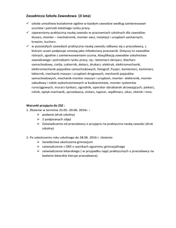 Zasadnicza Szkoła Zawodowa (3 lata) szkoła umożliwia kształcenie ogólne w każdym zawodzie według zainteresowań uczniów i potrzeb lokalnego rynku pracy. zapewniamy praktyczną naukę zawodu w pracowniach szkolnych dla zawodów: ślusarz, monter – mechatronik, monter sieci, instalacji i urządzeń sanitarnych, krawiec, kucharz. w pozostałych zawodach praktyczna naukę zawodu odbywa się u pracodawcy, z którym uczeń podpisuje umowę jako młodociany pracownik. Dotyczy to zawodów różnych, zgodnie z zainteresowaniami ucznia, klasyfikacją zawodów szkolnictwa zawodowego i potrzebami rynku pracy, np.: betoniarz-zbrojarz, blacharz samochodowy, cieśla, cukiernik, dekarz, drukarz, elektryk, elektromechanik, elektromechanik pojazdów samochodowych, fotograf, fryzjer, kamieniarz, kominiarz, lakiernik, mechanik maszyn i urządzeń drogowych, mechanik pojazdów samochodowych, mechanik-monter maszyn i urządzeń, monter- elektronik, monter zabudowy i robót wykończeniowych w budownictwie, monter systemów rurociągowych, murarz-tynkarz, ogrodnik, operator obrabiarek skrawających, piekarz, rolnik, optyk-mechanik, sprzedawca, stolarz, tapicer, wędliniarz, zdun, złotnik i inne. Warunki przyjęcia do ZSZ : 1. Złożenie w terminie 23.05.-20.06. 2016r. : podania (druk szkolny) 2 podpisanych zdjęć Zaświadczenia od pracodawcy o przyjęciu na praktyczna naukę zawodu (druk szkolny) 2. Po zakończeniu roku szkolnego do 28.06. 2016 r. złożenie: świadectwa ukończenia gimnazjum zaświadczenie z OKE o wynikach egzaminu gimnazjalnego zaświadczenia lekarskiego ( w przypadku zajęć praktycznych u pracodawcy na badania lekarskie kieruje pracodawca).