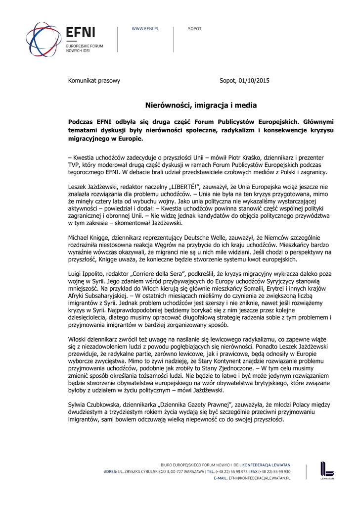 Komunikat prasowy Sopot, 01/10/2015 Nierówności, imigracja i media Podczas EFNI odbyła się druga część Forum Publicystów Europejskich. Głównymi tematami dyskusji były nierówności społeczne, radykalizm i konsekwencje kryzysu migracyjnego w Europie. – Kwestia uchodźców zadecyduje o przyszłości Unii – mówił Piotr Kraśko, dziennikarz i prezenter TVP, który moderował drugą część dyskusji w ramach Forum Publicystów Europejskich podczas tegorocznego EFNI. W debacie brali udział przedstawiciele czołowych mediów z Polski i zagranicy. Leszek Jażdżewski, redaktor naczelny „LIBERTÉ!”, zauważył, że Unia Europejska wciąż jeszcze nie znalazła rozwiązania dla problemu uchodźców. – Unia nie była na ten kryzys przygotowana, mimo że minęły cztery lata od wybuchu wojny. Jako unia polityczna nie wykazaliśmy wystarczającej aktywności – powiedział i dodał: – Kwestia uchodźców powinna stanowić część wspólnej polityki zagranicznej i obronnej Unii. – Nie widzę jednak kandydatów do objęcia politycznego przywództwa w tym zakresie – skomentował Jażdżewski. Michael Knigge, dziennikarz reprezentujący Deutsche Welle, zauważył, że Niemców szczególnie rozdrażniła niestosowna reakcja Węgrów na przybycie do ich kraju uchodźców. Mieszkańcy bardzo wyraźnie wówczas okazywali, że migranci nie są u nich mile widziani. Jeśli chodzi o perspektywy na przyszłość, Knigge uważa, że konieczne będzie stworzenie systemu kwot europejskich. Luigi Ippolito, redaktor „Corriere della Sera”, podkreślił, że kryzys migracyjny wykracza daleko poza wojnę w Syrii. Jego zdaniem wśród przybywających do Europy uchodźców Syryjczycy stanowią mniejszość. Na przykład do Włoch kierują się głównie mieszkańcy Somalii, Erytrei i innych krajów Afryki Subsaharyjskiej. – W ostatnich miesiącach mieliśmy do czynienia ze zwiększoną liczbą imigrantów z Syrii. Jednak problem uchodźców jest szerszy i nie zniknie, nawet jeśli rozwiążemy kryzys w Syrii. Najprawdopodobniej będziemy borykać się z nim jeszcze przez kolejne dziesięciolecia, dlatego musimy opracować długofalową strategię radzenia sobie z tym problemem i przyjmowania imigrantów w bardziej zorganizowany sposób. Włoski dziennikarz zwrócił też uwagę na nasilanie się lewicowego radykalizmu, co zapewne wiąże się z niezadowoleniem ludzi z powodu pogłębiających się nierówności. Ponadto Leszek Jażdżewski przewiduje, że radykalne partie, zarówno lewicowe, jak i prawicowe, będą odnosiły w Europie wyborcze zwycięstwa. Mimo to żywi nadzieję, że Stary Kontynent znajdzie rozwiązanie problemu przyjmowania uchodźców, podobnie jak zrobiły to Stany Zjednoczone. – W tym celu musimy zmienić sposób określania tożsamości ludzi. Nie będzie to łatwe i być może jedynym rozwiązaniem będzie stworzenie obywatelstwa europejskiego na wzór obywatelstwa brytyjskiego, które związane byłoby z udziałem w życiu politycznym – mówi Jażdżewski. Sylwia Czubkowska, dziennikarka „Dziennika Gazety Prawnej”, zauważyła, że młodzi Polacy między dwudziestym a trzydziestym rokiem życia wydają się być szczególnie przeciwni przyjmowaniu imigrantów, sami bowiem odczuwają wielką niepewność co do swojej przyszłości. – Poważnym problemem jest to, że młodzi Polacy, nastolatkowie, są przeciwni imigrantom. Powodem jest ich niepewność i narastająca frustracja. W rezultacie przyłączają się do ruchów sprzeciwu wobec imigrantów – tłumaczyła Czubkowska. Z drugiej strony dziennikarz „Gazety Parkiet” Grzegorz Siemionczyk podkreślił, że taka interpretacja nie zawsze jest słuszna. Wskazał przy tym na europejski wymiar problemu. – Sprzeciw wobec imigrantów pojawiający się w Europie Środkowej i Wschodniej nie wynika z niechęci do imigrantów jako takich. Odzwierciedla on obawy spowodowane brakiem europejskiej strategii rozwiązania kryzysu migracyjnego – wyjaśnił. Redaktor czeskiego dziennika „Lidove Noviny” Luboš Palata zwrócił uwagę, że wielu młodych Czechów pomaga uchodźcom przebywającym w Austrii, Serbii i na granicy z Macedonią. Powiedział też, że niektórzy czescy politycy niechętni są przyjmowaniu uchodźców. Co więcej, prezydent Czech Miloš Zeman oświadczył, że rzekomo każdy terrorysta jest muzułmaninem. – Dla tych ludzi obowiązkowe kwoty i histeria związana z muzułmańskimi uchodźcami stanowią broń przeciw Europie – powiedział Palata. Pokłada on nadzieję w nowym pokoleniu Czechów, które jest bardzo otwarte na Europę. Palata zwrócił też uwagę, że w ciągu ostatnich lat swoje podejście do imigrantów zmienili Polacy. Na przykład w latach dziewięćdziesiątych Polska przyjęła ponad 80 000 uchodźców z Czeczenii. – Czeczeni uciekali przed wojną z Rosją i wielu Polaków postrzegało ich jako bohaterów walczących z imperium zła. Tymczasem obecnie Syryjczycy uciekają od wojny całkowicie innej i dużo bardziej skomplikowanej – wyjaśniał Kraśko. Odnosząc się do sytuacji na Litwie, Egle Samoskaite, publicystka portalu delfi.lt, zwróciła uwagę na homogeniczny charakter litewskiego społeczeństwa, a także na niedostatek rzetelnych informacji o islamie i różnicach między poszczególnymi grupami w ramach społeczności muzułmańskich. Problem pogłębia też brak długofalowego rozwiązania kryzysu. Ponadto uważa się, że stanowisko wobec imigrantów przyjęte przez litewskie elity polityczne jest dość niejednoznaczne. Litwa rozumie znaczenie solidarności w czasie kryzysu i nie odrzuciła systemu kwot, ale w głębi duszy zwykli obywatele są temu pomysłowi przeciwni. Partnerem tegorocznego Forum Publicystów Europejskich jest „Gazeta Wyborcza”.