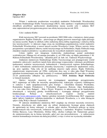 Wrocław, dn. 18.02.2010r. Zbigniew Kłos Opiekun SKT Witam i serdecznie pozdrawiam wszystkich studentów Politechniki Wrocławskiej w imieniu Studenckiego Klubu Turystycznego (SKT). Jako opiekun i współzałożyciel klubu chciałbym przybliżyć społeczności akademickiej naszej uczelni cele i zadania SKT oraz zaprezentować przygotowaną przez nas ofertę turystyczną na rok 2010. Cele i zadania Klubu: Klub turystyczny SKT powstał na przełomie 2005/2006 roku z inicjatywy dużej grupy organizatorów Rajdów Elektryka – pierwszego po długiej przerwie masowego rajdu pieszego na naszej uczelni. Rajdy te zdobyły sobie zasłużoną sławę dobrą organizacją i ciekawą ofertą tras turystycznych i w dalszym ciągu ciszą się niesłabnącą popularnością wśród studentów Politechniki Wrocławskiej, a nawet innych uczelni Wrocławia i kraju. Wbrew nazwie, która przypomina o początkach odnowy ruchu turystycznego na Politechnice, Rajdy Elektryka mają charakter międzywydziałowy i są adresowane do wszystkich studentów naszej uczelni. Celem rajdów jest integracja środowiska studenckiego ponad podziałami wydziałowymi. Dlatego też od samego początku, tj. od 1996 roku, są objęte patronatem J. M. Rektora Politechniki Wrocławskiej – aktualnie prof. dr. hab. inż. Tadeusza Więckowskiego. Zadaniem statutowym Studenckiego Klubu Turystycznego jest propagowanie wśród studentów zdrowych i możliwie tanich form aktywnego wypoczynku i rekreacji, przybliżanie (pokazanie) walorów turystycznych, kulturalnych i historycznych regionu dolnośląskiego, a także rozbudzenie zainteresowań piosenką turystyczną i zespołowym spędzaniem czasu, np. przy ognisku. Taką rolę od lat spełniają masowe rajdy piesze, Rajdy Elektryka, organizowane nieprzerwanie od 1996r. cyklicznie dwa razy w roku jako Rajd Wiosenny (przełom kwietnia/maja) oraz Rajd Jesienny (3 weekend października).W tym roku w dniach 22-24 października odbędzie się jubileuszowy – XXX Jesienny Rajd Elektryka w Górach Izerskich. Oprócz turystyki masowej nie wymagającej specjalnego przygotowania, SKT organizuje od kilku lat turystykę specjalistyczną: wakacyjne wyprawy trekkingowe w ciekawe i mało spopularyzowane góry Europy – Ukraińskie Karpaty Wschodnie, Rumuńskie Karpaty Południowe i Wschodnie (Fogarasze, Retezat, Alpy Rodniańskie, a w tym roku Góry Bułgarii – Riła i Piryn). Wyprawy te adresowane są do kandydatów obeznanych z turystyką górską kwalifikowaną i wymagają dobrego przygotowania kondycyjnego. Relacje z dotychczasowych wypraw można znaleźć na http://www.sktwyprawy.info. Oprócz górskiej turystyki kwalifikowanej SKT organizuje także spływy kajakowe: sobotnio-niedzielne w okolicach Wrocławia, a w roku bieżącym spływ rzeką Wdą w Borach Tucholskich. W zakresie działalności statutowej SKT znajduje się również turystyka rowerowa. Niestety, dotychczas nie udało nam się zebrać dostatecznie licznego grona chętnych do uprawiania tej formy rekreacji. A szkoda, gdyż okolice Wrocławia pokryte są siecią oznakowanych tras rowerowych, zwłaszcza na północy i zachodzie: Wzgórza Trzebnickie, Dolina Baryczy, Lasy Obornickie, Dolina Odry, okolice Lubiąża itd. Namawiam gorąco do zainteresowania się tą formą turystyki, gdyż jest ona przyszłościowa – w zatłoczonym mieście komunikacja rowerem ma dużą przyszłość, a więc o rower na wycieczkę nietrudno. Oferta SKT na 2010r. Na najbliższy rok SKT przygotował 9 zadań turystycznych i przedłożył komisji konkursowej zgodnie z procedura obowiązującą w Politechnice Wrocławskiej od stycznia b.r. Wszystkie zadania zyskały aprobatę komisji i zostało nam przyznane dofinansowanie w kwocie wnioskowanej przez SKT. Dlatego przedstawiona oferta jest poważna i ma pokrycie finansowe. Kalendarz imprez turystycznych organizowanych przez SKT w 2010r. Zad.1 XXIX Wiosenny Rajd Elektryka – Karkonosze Termin: 23-25.04.2010 r. Liczba uczestników: 290 Miejsce noclegów: Karpacz Wpisowe: 25 zł Przejazdy: we własnym zakresie Zad.2 XXX Jesienny Rajd Elektryka – Góry Izerskie Termin: 22-24.10.2010 r. Liczba uczestników: 230 Miejsce noclegów: Szklarska Poręba Wpisowe: 25 zł Przejazdy: we własnym zakresie Uwagi i komentarze: 1. Rajd ma charakter otwarty i adresowany jest do wszystkich studentów Politechniki Wrocławskiej. 2. Informacje o trybie zapisów są ogłaszane na stronie SKT (www.skt.pwr.wroc.pl) oraz na plakatach. 3. Karty uczestnictwa są sprzedawane na otwartych zapisach. Termin zapisów podany jw. 4. Warunkiem otrzymania karty uczestnictwa jest przedstawienie pisemnego zgłoszenia zawierającego wszystkie dane osobowe i kontaktowe oraz dodatkowo podpisane zobowiązanie o przestrzeganiu regulaminu rajdu. 5. Wzór zgłoszenia oraz regulaminu należy pobrać ze strony www. 6. Gwarantowane miejsce na rajdach mają: organizatorzy z osobą towarzyszącą, gitarzyści oraz zaproszeni goście (VIP-y). 7. Tradycyjnie wieczorem organizujemy wspólną zabawę przy ognisku: pieczenie kiełbasek, degustację wyśmienitego grzańca oraz konkursy, m.in. bieg na orientację. Zad.3 Przygotowanie logistyczne tras turystycznych oraz bazy noclegowej XXIX Wiosennego Rajdu Elektryka Termin: 10-11.04.2010 r. Liczba uczestników: 20 Miejsce noclegów: Karpacz Zad.4 Przygotowanie logistyczne tras turystycznych oraz bazy noclegowej XXX Jesiennego Rajdu Elektryka Termin: 9-10.10.2010 r. Liczba uczestników: 20 Miejsce noclegów: Szklarska Poręba Uwagi i komentarze: 1. Zadania 3 i 4 są integralnie związane z Rajdem Wiosennym i Jesiennym. Przeznaczone są dla organizatorów przewodników tras. 2. Wyjazd rekonesansowo-przygotowawczy poprzedza każdy z Rajdów Elektryka i ma na celu rozeznanie w terenie oraz szkolenia organizatorów, obsługi i przewodników (baza noclegowa, przejście tras). 3. Serdecznie zapraszam wszystkich chętnych, którzy chcieliby się włączyć w organizację Rajdów, gdyż kadra turystyczna ciągle si