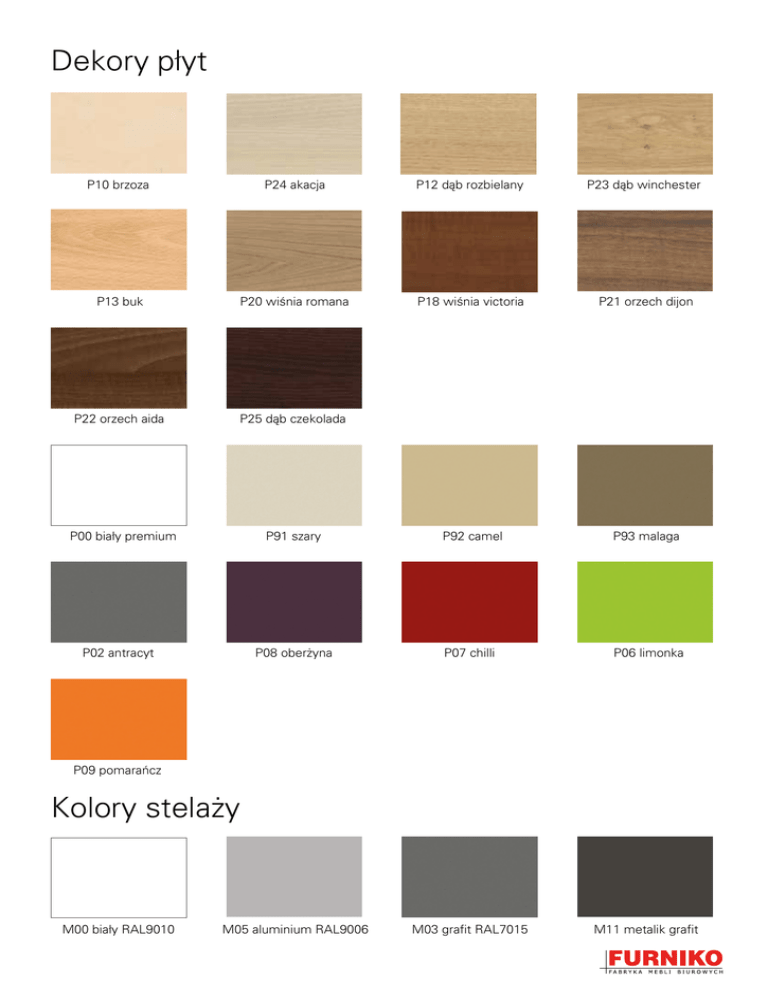 Dekory p³yt P10 brzoza P24 akacja P12 d¹b rozbielany P23 d¹b winchester P13 buk P20 wiœnia romana P18 wiœnia victoria P21 orzech dijon P22 orzech aida P25 d¹b czekolada P91 szary P92 camel P93 malaga P08 ober¿yna P07 chilli P06 limonka M05 aluminium RAL9006 M03 grafit RAL7015 M11 metalik grafit P00 bia³y premium P02 antracyt P09 pomarañcz Kolory stela¿y M00 bia³y RAL9010 Tapicerki grupa I X29 szary jasny X03 zieleñ X22 szary melan¿ X10 niebieski Tapicerki grupa II YB106 chilli YB157 hiacynt YB156 limonka YB090 ober¿yna YB170 szarotka YB093 imbir