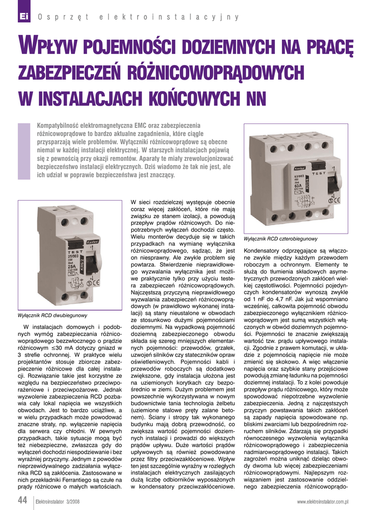 Ei O s p r z ę t e l e k t r o i n s t a l a c y j n y Wpływ pojemności doziemnych na pracę zabezpieczeń różnicowoprądowych w instalacjach końcowych nn Kompatybilność elektromagnetyczna EMC oraz zabezpieczenia różnicowoprądowe to bardzo aktualne zagadnienia, które ciągle przysparzają wiele problemów. Wyłączniki różnicowoprądowe są obecne niemal w każdej instalacji elektrycznej. W starszych instalacjach pojawią się z pewnością przy okazji remontów. Aparaty te miały zrewolucjonizować bezpieczeństwo instalacji elektrycznych. Dziś wiadomo że tak nie jest, ale ich udział w poprawie bezpieczeństwa jest znaczący. Wyłącznik RCD dwubiegunowy W instalacjach domowych i podobnych wymóg zabezpieczania różnicowoprądowego bezzwłocznego o prądzie różnicowym ≤30 mA dotyczy gniazd w 3 strefie ochronnej. W praktyce wielu projektantów stosuje zbiorcze zabezpieczenie różnicowe dla całej instalacji. Rozwiązanie takie jest korzystne ze względu na bezpieczeństwo przeciwporażeniowe i przeciwpożarowe. Jednak wyzwolenie zabezpieczenia RCD pozbawia cały lokal napięcia we wszystkich obwodach. Jest to bardzo uciążliwe, a w wielu przypadkach może powodować znaczne straty, np. wyłączenie napięcia dla serwera czy chłodni. W pewnych przypadkach, takie sytuacje mogą być też niebezpieczne, zwłaszcza gdy do wyłączeń dochodzi niespodziewanie i bez wyraźniej przyczyny. Jednym z powodów nieprzewidywalnego zadziałania wyłącznika RCD są zakłócenia. Zastosowane w nich przekładniki Ferrantiego są czułe na prądy różnicowe o małych wartościach. 44 Elektroinstalator 3/2008 W sieci rozdzielczej występuje obecnie coraz więcej zakłóceń, które nie mają związku ze stanem izolacji, a powodują przepływ prądów różnicowych. Do niepotrzebnych wyłączeń dochodzi często. Wielu monterów decyduje się w takich przypadkach na wymianę wyłącznika różnicowoprądowego, sądząc, że jest on niesprawny. Ale zwykle problem się powtarza. Stwierdzenie nieprawidłowego wyzwalania wyłącznika jest możliwe praktycznie tylko przy użyciu testera zabezpieczeń różnicowoprądowych. Najczęstszą przyczyną nieprawidłowego wyzwalania zabezpieczeń różnicowoprądowych (w prawidłowo wykonanej instalacji) są stany nieustalone w obwodach ze stosunkowo dużymi pojemnościami doziemnymi. Na wypadkową pojemność doziemną zabezpieczonego obwodu składa się szereg mniejszych elementarnych pojemności: przewodów, grzałek, uzwojeń silników czy stateczników opraw oświetleniowych. Pojemności kabli i przewodów roboczych są dodatkowo zwiększone, gdy instalacja ułożona jest na uziemionych korytkach czy bezpośrednio w ziemi. Dużym problemem jest powszechnie wykorzystywana w nowym budownictwie tania technologia żelbetu (uziemione stalowe pręty zalane betonem). Ściany i stropy tak wykonanego budynku mają dobrą przewodność, co zwiększa wartość pojemności doziemnych instalacji i prowadzi do większych prądów upływu. Duże wartości prądów upływowych są również powodowane przez filtry przeciwzakłóceniowe. Wpływ ten jest szczególnie wyraźny w rozległych instalacjach elektrycznych zasilających dużą liczbę odbiorników wyposażonych w kondensatory przeciwzakłóceniowe. Wyłącznik RCD czterobiegunowy Kondensatory odprzęgające są włączone zwykle między każdym przewodem roboczym a ochronnym. Elementy te służą do tłumienia składowych asymetrycznych przewodzonych zakłóceń wielkiej częstotliwości. Pojemności pojedynczych kondensatorów wynoszą zwykle od 1 nF do 4,7 nF. Jak już wspomniano wcześniej, całkowita pojemność obwodu zabezpieczonego wyłącznikiem różnicowoprądowym jest sumą wszystkich włączonych w obwód doziemnych pojemności. Pojemności te znacznie zwiększają wartość tzw. prądu upływowego instalacji. Zgodnie z prawem komutacji, w układzie z pojemnością napięcie nie może zmienić się skokowo. A więc włączenie napięcia oraz szybkie stany przejściowe powodują zmianę ładunku na pojemności doziemnej instalacji. To z kolei powoduje przepływ prądu różnicowego, który może spowodować niepotrzebne wyzwolenie zabezpieczenia. Jedną z najczęstszych przyczyn powstawania takich zakłóceń są zapady napięcia spowodowane np. bliskimi zwarciami lub bezpośrednim rozruchem silników. Zdarzają się przypadki równoczesnego wyzwolenia wyłącznika różnicowoprądowego i zabezpieczenia nadmiarowoprądowego instalacji. Takich zagrożeń można uniknąć dzieląc obwody dwoma lub więcej zabezpieczeniami różnicowoprądowymi. Najlepszym rozwiązaniem jest zastosowanie oddzielnego zabezpieczenia różnicowoprądowww.elektroinstalator.com.pl O s p r z ę t . . . wego zintegrowanego z wyłącznikiem nadmiarowym do ochrony wrażliwego obwodu, np. gniazd instalacji komputerowej. W starych instalacjach, bez przewodu ochronnego (układ TN-C), podczas remontu powinien być w szczególności wymieniony obwód gniazd łazienki oraz Ei nawet oddzielne rozdzielnice wydzielone z instalacji i dedykowane wyłącznie dla sprzętu komputerowego. Jest to szczególnie ważne nie tylko na terenach przemysłowych, ale również pozamiejskich gdzie są rozległe sieci, które są bardziej podatne na zapady napięcia. n o w o ś c i Oprawy ścienne, stałe ZEW EL-235U Przykładowy schemat filtru przeciwzakłóceniowego gniazd komputerowych (jeśli takie występują). Najlepiej jeśli obwody te będą zabezpieczone oddzielnymi wyłącznikami różnicowoprądowymi 30 mA z członem nadprądowym. Wówczas wszelkie zakłócenia w pozostałych częściach instalacji nie będą oddziaływały na chroniony w ten sposób sprzęt. Należy jednak pamiętać, ze wiele urządzeń sprzętu komputerowego ma wbudowane filtry przeciwzakłóceniowe, dlatego na jednym obwodzie nie powinno być więcej niż 6 urządzeń pracujących w I klasie izolacji. W wielu projektach można spotkać Problemy z eksploatacj