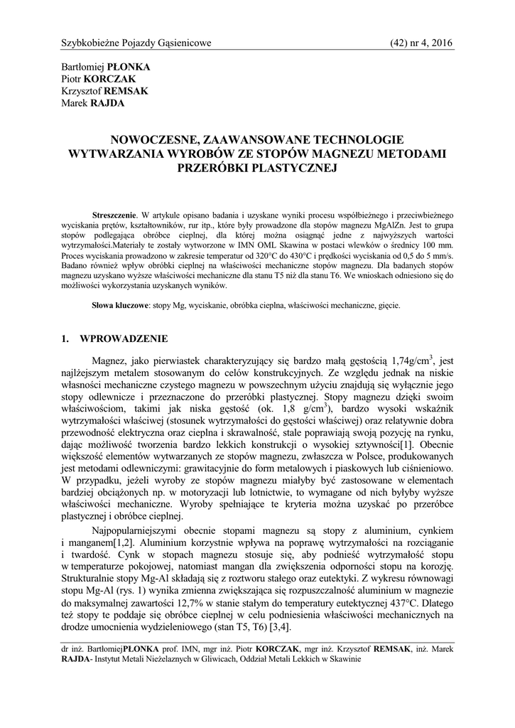 Szybkobiene Pojazdy Gsienicowe (42) nr 4, 2016 Bartłomiej PŁONKA Piotr KORCZAK Krzysztof REMSAK Marek RAJDA NOWOCZESNE, ZAAWANSOWANE TECHNOLOGIE WYTWARZANIA WYROBÓW ZE STOPÓW MAGNEZU METODAMI PRZERÓBKI PLASTYCZNEJ Streszczenie. W artykule opisano badania i uzyskane wyniki procesu współbienego i przeciwbienego wyciskania prtów, kształtowników, rur itp., które były prowadzone dla stopów magnezu MgAlZn. Jest to grupa stopów podlegajca obróbce cieplnej, dla której mona osign jedne z najwyszych wartoci wytrzymałoci.Materiały te zostały wytworzone w IMN OML Skawina w postaci wlewków o rednicy 100 mm. Proces wyciskania prowadzono w zakresie temperatur od 320°C do 430°C i prdkoci wyciskania od 0,5 do 5 mm/s. Badano równie wpływ obróbki cieplnej na właciwoci mechaniczne stopów magnezu. Dla badanych stopów magnezu uzyskano wysze właciwoci mechaniczne dla stanu T5 ni dla stanu T6. We wnioskach odniesiono si do moliwoci wykorzystania uzyskanych wyników. Słowa kluczowe: stopy Mg, wyciskanie, obróbka cieplna, właciwoci mechaniczne, gicie. 1. WPROWADZENIE Magnez, jako pierwiastek charakteryzujcy si bardzo mał gstoci 1,74g/cm3, jest najlejszym metalem stosowanym do celów konstrukcyjnych. Ze wzgldu jednak na niskie własnoci mechaniczne czystego magnezu w powszechnym uyciu znajduj si wyłcznie jego stopy odlewnicze i przeznaczone do przeróbki plastycznej. Stopy magnezu dziki swoim właciwociom, takimi jak niska gsto (ok. 1,8 g/cm3), bardzo wysoki wskanik wytrzymałoci właciwej (stosunek wytrzymałoci do gstoci właciwej) oraz relatywnie dobra przewodno elektryczna oraz cieplna i skrawalno, stale poprawiaj swoj pozycj na rynku, dajc moliwo tworzenia bardzo lekkich konstrukcji o wysokiej sztywnoci[1]. Obecnie wikszo elementów wytwarzanych ze stopów magnezu, zwłaszcza w Polsce, produkowanych jest metodami odlewniczymi: grawitacyjnie do form metalowych i piaskowych lub cinieniowo. W przypadku, jeeli wyroby ze stopów magnezu miałyby by zastosowane w elementach bardziej obcionych np. w motoryzacji lub lotnictwie, to wymagane od nich byłyby wysze właciwoci mechaniczne. Wyroby spełniajce te kryteria mona uzyska po przeróbce plastycznej i obróbce cieplnej. Najpopularniejszymi obecnie stopami magnezu s stopy z aluminium, cynkiem i manganem[1,2]. Aluminium korzystnie wpływa na popraw wytrzymałoci na rozciganie i twardo. Cynk w stopach magnezu stosuje si, aby podnie wytrzymało stopu w temperaturze pokojowej, natomiast mangan dla zwikszenia odpornoci stopu na korozj. Strukturalnie stopy Mg-Al składaj si z roztworu stałego oraz eutektyki. Z wykresu równowagi stopu Mg-Al (rys. 1) wynika zmienna zwikszajca si rozpuszczalno aluminium w magnezie do maksymalnej zawartoci 12,7% w stanie stałym do temperatury eutektycznej 437°C. Dlatego te stopy te poddaje si obróbce cieplnej w celu podniesienia właciwoci mechanicznych na drodze umocnienia wydzieleniowego (stan T5, T6) [3,4]. dr in. BartłomiejPŁONKA prof. IMN, mgr in. Piotr KORCZAK, mgr in. Krzysztof REMSAK, in. Marek RAJDA- Instytut Metali Nieelaznych w Gliwicach, Oddział Metali Lekkich w Skawinie 42 Bartłomiej PŁONKA, Piotr KORCZAK, Krzysztof REMSAK, Marek RAJDA Stopy magnezu s przerabiane plastycznie głównie w podwyszonych temperaturach. Wynika to z budowy krystalicznej magnezu, który krystalizuje w układzie heksagonalnym. W tym systemie dostpne s tylko trzy systemy polizgu, co jest niewystarczajce, aby magnez i jego stopy mogły by wystarczajco plastyczne w temperaturze otoczenia[1]. Dopiero w podwyszonych temperaturach uruchamiaj si dodatkowe dwa systemy polizgu, co pozwala na kształtowanie plastyczne.W trakcie wysokotemperaturowego odkształcania metali zachodz takie procesy jak: umocnienie, dynamiczne zdrowienie i dynamiczna rekrystalizacja. Procesy te zachodz równolegle w odkształcanym metalu. Stopy magnezu posiadaj nisk energi błdu ułoenia, tote dynamiczna rekrystalizacja jest procesem wiodcym w trakcie wysokotemperaturowej przeróbki plastycznej [5]. Powoduje ona usuwanie skutków umocnienia odkształceniowego, podnosi plastyczno i zmniejsza opory płynicia. Znaczna cz wiatowej produkcji magnezu wykorzystywana jest jako dodatek stopowy do aluminium. Jedynie około 34% wykorzystywane jest do produkcji elementów magnezowych, z czego wikszo na komponenty odlewane, a tylko około 1% na przerabiane plastycznie. Elementy odlewane charakteryzuj si niszymi własnociami mechanicznymi (tj wytrzymało, wydłuenie) w stosunku do elementów kształtowanych przez procesy przeróbki plastycznej a nastpnie obrabianych cieplnie [6]. Rónice te bardzo dokładnie obrazuje wykres na rysunku 2. Rys.1. Układ fazowy Al-Mg [4] Rys. 2. Graficzne przedstawienie własnoci mechanicznych stopu AZ91 w zalenoci od rodzaju przetwarzania [6] Mimo to własnoci mechaniczne stopów magnezu s nisze ni wielu stopów aluminium. Podejmuje si zatem działania polegajce na takim doborze rodzaju i parametrów kształtowania plastycznego stopów magnezu, które pozwoli na zwikszenie wytrzymałoci. Najlepszym do tego celu procesem wydaje si by wyciskanie, w którymwytwarzany stan napre ciskajcych zapewnia najlepsze warunki do przeróbki plastycznej. 2. CHARAKTERYSTYKA MATERIAŁU I METODYKA BADA W ramach prezentowanych prac badania były prowadzone dla stopów magnezu MgAlZn (AZ80A, AZ61, AZ31). Składy chemiczne tych stopów przedstawiono w tablicy 1. Stopy te do bada zaawansowanych procesów przeróbki plastycznej były odlewane w postaci wlewków Nowoczesne, zaawansowane technologie wytwarzania wyrobów ze stopów… 43 okrgłych o rednicy 100 mm w Instytucie Metali Nieelaznych, Oddział Metali Lekkich w Skawinie, który jako jedyny w Polsce i jeden z nielicznych w Europie posiada stanowisko do półcigłego, pionowego odlewania wlewków ze stopów Mg [7]. W pełni wyposaone i zautomatyzowane stanowisko (rys. 3) składa si z pieca topielnoodlewniczego o pojemnoci 150kg Mg, studni z krystalizatorami oraz układem mieszania i dystrybucji