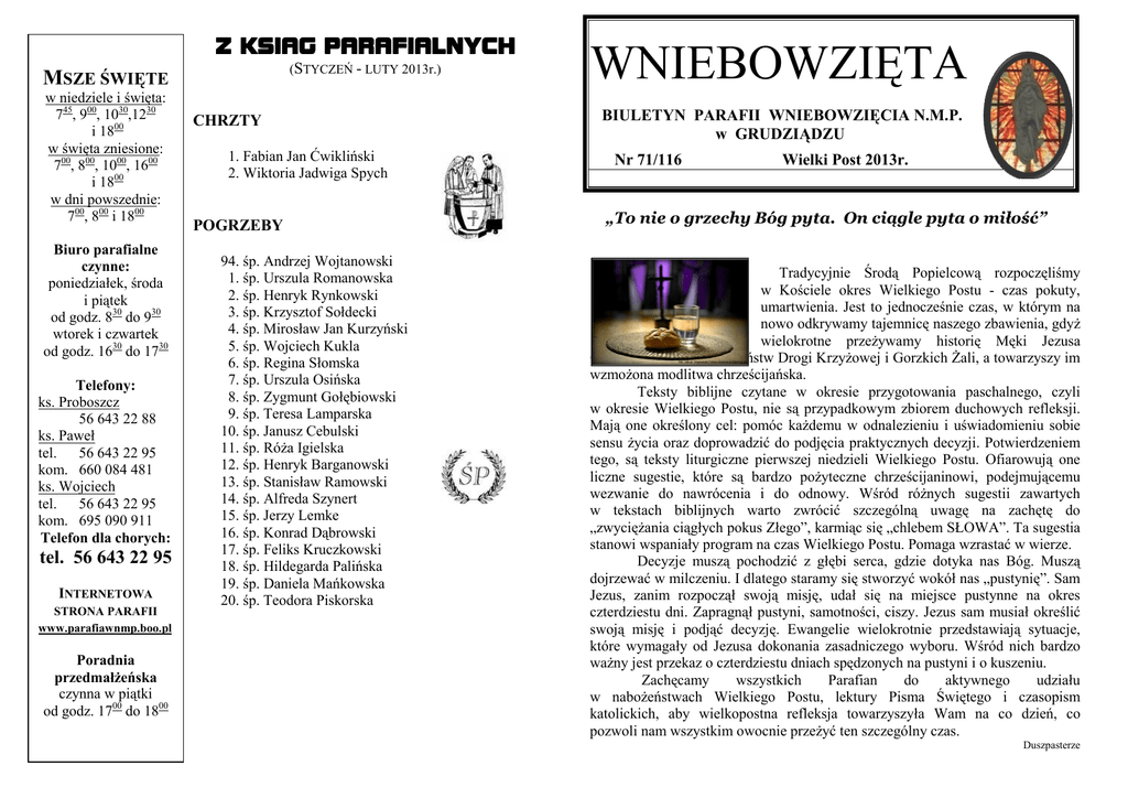 Z KSIAG PARAFIALNYCH (STYCZEŃ - LUTY 2013r.) MSZE ŚWIĘTE w niedziele i święta: 745, 900, 1030,1230 i 1800 w święta zniesione: 700, 800, 1000, 1600 i 1800 w dni powszednie: 700, 800 i 1800 Biuro parafialne czynne: poniedziałek, środa i piątek od godz. 830 do 930 wtorek i czwartek od godz. 1630 do 1730 Telefony: ks. Proboszcz 56 643 22 88 ks. Paweł tel. 56 643 22 95 kom. 660 084 481 ks. Wojciech tel. 56 643 22 95 kom. 695 090 911 Telefon dla chorych: tel. 56 643 22 95 INTERNETOWA STRONA PARAFII www.parafiawnmp.boo.pl Poradnia przedmałżeńska czynna w piątki od godz. 1700 do 1800 CHRZTY 1. Fabian Jan Ćwikliński 2. Wiktoria Jadwiga Spych POGRZEBY 94. śp. Andrzej Wojtanowski 1. śp. Urszula Romanowska 2. śp. Henryk Rynkowski 3. śp. Krzysztof Sołdecki 4. śp. Mirosław Jan Kurzyński 5. śp. Wojciech Kukla 6. śp. Regina Słomska 7. śp. Urszula Osińska 8. śp. Zygmunt Gołębiowski 9. śp. Teresa Lamparska 10. śp. Janusz Cebulski 11. śp. Róża Igielska 12. śp. Henryk Barganowski 13. śp. Stanisław Ramowski 14. śp. Alfreda Szynert 15. śp. Jerzy Lemke 16. śp. Konrad Dąbrowski 17. śp. Feliks Kruczkowski 18. śp. Hildegarda Palińska 19. śp. Daniela Mańkowska 20. śp. Teodora Piskorska WNIEBOWZIĘTA BIULETYN PARAFII WNIEBOWZIĘCIA N.M.P. w GRUDZIĄDZU Nr 71/116 Wielki Post 2013r. „To nie o grzechy Bóg pyta. On ciągle pyta o miłość” Tradycyjnie Środą Popielcową rozpoczęliśmy w Kościele okres Wielkiego Postu - czas pokuty, umartwienia. Jest to jednocześnie czas, w którym na nowo odkrywamy tajemnicę naszego zbawienia, gdyż wielokrotne przeżywamy historię Męki Jezusa Chrystusa podczas nabożeństw Drogi Krzyżowej i Gorzkich Żali, a towarzyszy im wzmożona modlitwa chrześcijańska. Teksty biblijne czytane w okresie przygotowania paschalnego, czyli w okresie Wielkiego Postu, nie są przypadkowym zbiorem duchowych refleksji. Mają one określony cel: pomóc każdemu w odnalezieniu i uświadomieniu sobie sensu życia oraz doprowadzić do podjęcia praktycznych decyzji. Potwierdzeniem tego, są teksty liturgiczne pierwszej niedzieli Wielkiego Postu. Ofiarowują one liczne sugestie, które są bardzo pożyteczne chrześcijaninowi, podejmującemu wezwanie do nawrócenia i do odnowy. Wśród różnych sugestii zawartych w tekstach biblijnych warto zwrócić szczególną uwagę na zachętę do „zwyciężania ciągłych pokus Złego”, karmiąc się „chlebem SŁOWA”. Ta sugestia stanowi wspaniały program na czas Wielkiego Postu. Pomaga wzrastać w wierze. Decyzje muszą pochodzić z głębi serca, gdzie dotyka nas Bóg. Muszą dojrzewać w milczeniu. I dlatego staramy się stworzyć wokół nas „pustynię”. Sam Jezus, zanim rozpoczął swoją misję, udał się na miejsce pustynne na okres czterdziestu dni. Zapragnął pustyni, samotności, ciszy. Jezus sam musiał określić swoją misję i podjąć decyzję. Ewangelie wielokrotnie przedstawiają sytuacje, które wymagały od Jezusa dokonania zasadniczego wyboru. Wśród nich bardzo ważny jest przekaz o czterdziestu dniach spędzonych na pustyni i o kuszeniu. Zachęcamy wszystkich Parafian do aktywnego udziału w nabożeństwach Wielkiego Postu, lektury Pisma Świętego i czasopism katolickich, aby wielkopostna refleksja towarzyszyła Wam na co dzień, co pozwoli nam wszystkim owocnie przeżyć ten szczególny czas. Duszpasterze Z ZYCIA PARAFII 1. SPOTKANIE OPŁATKOWE 6 stycznia w uroczystość Objawienia Pańskiego kapłani naszej Wspólnoty spotkali się z członkami stowarzyszeń, grup modlitewnych, chóru parafialnego i ministrantami aby podzielić się opłatkiem i złożyć życzenia noworoczne. Po odczytaniu Ewangelii przez ks. Wojciecha i złożeniu życzeń noworocznych przez ks. Proboszcza, nastąpił moment dzielenia się opłatkiem i składania wzajemnych życzeń. Dalsze spotkanie wypełnił śpiew kolęd oraz rozmowy przy odświętnie przygotowanym stole. Proboszczowi naszej parafii- ks. kan. Krzysztofowi Zalewskiemu składamy serdeczne BÓG ZAPŁAĆ za zaproszenie, za ciepłe przyjęcie i za życzenia, które są zachętą do podejmowania stosownych postanowień w Roku Wiary. 2. NOWENNA KU CZCI NMP Kapłani, wierni, schola młodzieżowa trwają na posterunku i nie zapominają o swojej patronce. Mimo później pory i zimna przybyli 14.01. b.r. o godz. 20.15 do świątyni, aby dziękować Maryi za dar Syna Bożego, za opiekę oraz przeprosić za profanacje jej wizerunku. Modlitwie przewodniczył ks. Wojciech. Czyniąc przyjacielskie koło i śpiewając, pożegnaliśmy naszą Matkę, natomiast ks. Proboszcz udzielił błogosławieństwa wszystkim wiernym. 3. 13 stycznia 2013 roku w parafii p.w. św. Maksymiliana Kolbe odbył się po raz 5- ty koncert kolęd i pastorałek w wykonaniu grudziądzkich chórów. Wystąpiło 10 chórów, w tym również nasz chór parafialny pod dyrekcją pana R. Dunajskiego. Na zakończenie każdy z chórów został uhonorowany przez ks. kan. Kujaczyńskiego i Prezydenta Miasta okolicznościową statuetką i dyplomem. 4. 27.01.2013 roku po wieczornej Mszy św. odbył się w naszej świątyni III Parafialny Koncert Kolęd. Organizatorem koncertu był pan R. Dunajski i członkowie chóru parafialnego. Program koncertu był bardzo urozmaicony. Wystąpił chór z parafii p.w. św. Józefa z Mniszka, nasz chór parafialny, zespół grudziądzkich Amazonek, kwartet Towarzystwa Śpiewaczego, natomiast na instrumentach grali uczniowie ze szkoły muzycznej. Śpiewacy i muzycy nagradzani byli licznymi brawami. Na zakończenie liczne grono chórzystów zostało uhonorowane dyplomami i kwiatami. To był miły, wzruszający koncert. W niejednym oku pojawiły się łzy. Jesteśmy wdzięczni panu R. Dunajskiemu i chórzystom naszej parafii za tak przemiły gest serdeczności i gratulujemy śmiałego, a tak potrzebnego ŚWIADECTWA WIARY. M.M. KRZEWICIELKA WIARY Pragniemy wiernych naszej Wspólnoty zainteresować sługą Bożą- PAULINĄ MARIĄ JARICOT, która powo