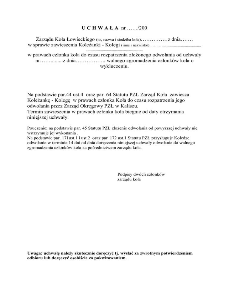 U C H W A Ł A nr ……/200 Zarządu Koła Łowieckiego (nr, nazwa i siedziba koła)……………z dnia……. w sprawie zawieszenia Koleżanki - Kolegi (imię i nazwisko)................................................... ......................................................... w prawach członka koła do czasu rozpatrzenia złożonego odwołania od uchwały nr…….........z dnia…………….. walnego zgromadzenia członków koła o wykluczeniu. Na podstawie par.44 ust.4 oraz par. 64 Statutu PZŁ Zarząd Koła zawiesza Koleżankę - Kolegę w prawach członka Koła do czasu rozpatrzenia jego odwołania przez Zarząd Okręgowy PZŁ w Kaliszu. Termin zawieszenia w prawach członka koła biegnie od daty otrzymania niniejszej uchwały. Pouczenie: na podstawie par. 45 Statutu PZŁ złożenie odwołania od powyższej uchwały nie wstrzymuje jej wykonania . Na podstawie par. 171ust.1 i ust.2 oraz par. 172 ust.1 Statutu PZŁ przysługuje Koledze odwołanie w terminie 14 dni od dnia doręczenia niniejszej uchwały odwołanie do walnego zgromadzenia członków koła za pośrednictwem zarządu koła. Podpisy dwóch członków zarządu koła Uwaga: uchwałę należy skutecznie doręczyć tj. wysłać za zwrotnym potwierdzeniem odbioru lub doręczyć osobiście za pokwitowaniem.
