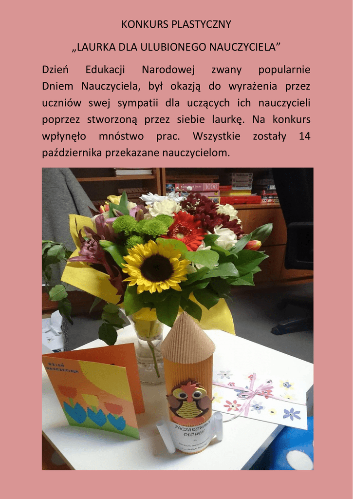 KONKURS PLASTYCZNY „LAURKA DLA ULUBIONEGO NAUCZYCIELA” Dzieo Edukacji Narodowej zwany popularnie Dniem Nauczyciela, był okazją do wyrażenia przez uczniów swej sympatii dla uczących ich nauczycieli poprzez stworzoną przez siebie laurkę. Na konkurs wpłynęło mnóstwo prac. Wszystkie zostały 14 października przekazane nauczycielom. Laureaci konkursu „LAURKA DLA MOJEGO ULUBIONEGO NAUCZYCIELA” 1 miejsce WIKTORIA WÓŁKIEWICZ klasa III a 2 miejsce MARLENA WARTOK klasa I a 3 miejsce HANNA ZIÓŁKOWSKA klasa III a Wyróżnienia: NIKODEM JODŁOWSKI klasa II c NINA RICHTA II a Gratulujemy !!!!!