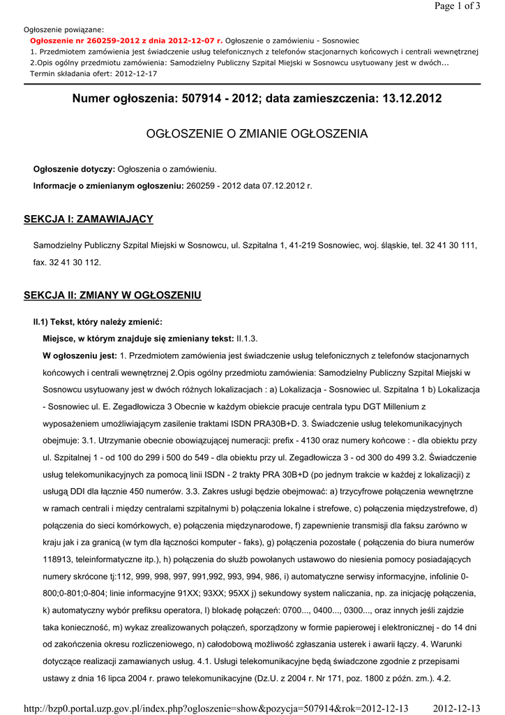 Page 1 of 3 Ogłoszenie powiązane: Ogłoszenie nr 260259-2012 z dnia 2012-12-07 r. Ogłoszenie o zamówieniu - Sosnowiec 1. Przedmiotem zamówienia jest świadczenie usług telefonicznych z telefonów stacjonarnych końcowych i centrali wewnętrznej 2.Opis ogólny przedmiotu zamówienia: Samodzielny Publiczny Szpital Miejski w Sosnowcu usytuowany jest w dwóch... Termin składania ofert: 2012-12-17 Numer ogłoszenia: 507914 - 2012; data zamieszczenia: 13.12.2012 OGŁOSZENIE O ZMIANIE OGŁOSZENIA Ogłoszenie dotyczy: Ogłoszenia o zamówieniu. Informacje o zmienianym ogłoszeniu: 260259 - 2012 data 07.12.2012 r. SEKCJA I: ZAMAWIAJĄCY Samodzielny Publiczny Szpital Miejski w Sosnowcu, ul. Szpitalna 1, 41-219 Sosnowiec, woj. śląskie, tel. 32 41 30 111, fax. 32 41 30 112. SEKCJA II: ZMIANY W OGŁOSZENIU II.1) Tekst, który należy zmienić: Miejsce, w którym znajduje się zmieniany tekst: II.1.3. W ogłoszeniu jest: 1. Przedmiotem zamówienia jest świadczenie usług telefonicznych z telefonów stacjonarnych końcowych i centrali wewnętrznej 2.Opis ogólny przedmiotu zamówienia: Samodzielny Publiczny Szpital Miejski w Sosnowcu usytuowany jest w dwóch różnych lokalizacjach : a) Lokalizacja - Sosnowiec ul. Szpitalna 1 b) Lokalizacja - Sosnowiec ul. E. Zegadłowicza 3 Obecnie w każdym obiekcie pracuje centrala typu DGT Millenium z wyposażeniem umożliwiającym zasilenie traktami ISDN PRA30B+D. 3. Świadczenie usług telekomunikacyjnych obejmuje: 3.1. Utrzymanie obecnie obowiązującej numeracji: prefix - 4130 oraz numery końcowe : - dla obiektu przy ul. Szpitalnej 1 - od 100 do 299 i 500 do 549 - dla obiektu przy ul. Zegadłowicza 3 - od 300 do 499 3.2. Świadczenie usług telekomunikacyjnych za pomocą linii ISDN - 2 trakty PRA 30B+D (po jednym trakcie w każdej z lokalizacji) z usługą DDI dla łącznie 450 numerów. 3.3. Zakres usługi będzie obejmować: a) trzycyfrowe połączenia wewnętrzne w ramach centrali i między centralami szpitalnymi b) połączenia lokalne i strefowe, c) połączenia międzystrefowe, d) połączenia do sieci komórkowych, e) połączenia międzynarodowe, f) zapewnienie transmisji dla faksu zarówno w kraju jak i za granicą (w tym dla łączności komputer - faks), g) połączenia pozostałe ( połączenia do biura numerów 118913, teleinformatyczne itp.), h) połączenia do służb powołanych ustawowo do niesienia pomocy posiadających numery skrócone tj:112, 999, 998, 997, 991,992, 993, 994, 986, i) automatyczne serwisy informacyjne, infolinie 0800;0-801;0-804; linie informacyjne 91XX; 93XX; 95XX j) sekundowy system naliczania, np. za inicjację połączenia, k) automatyczny wybór prefiksu operatora, l) blokadę połączeń: 0700..., 0400..., 0300..., oraz innych jeśli zajdzie taka konieczność, m) wykaz zrealizowanych połączeń, sporządzony w formie papierowej i elektronicznej - do 14 dni od zakończenia okresu rozliczeniowego, n) całodobową możliwość zgłaszania usterek i awarii łączy. 4. Warunki dotyczące realizacji zamawianych usług. 4.1. Usługi telekomunikacyjne będą świadczone zgodnie z przepisami ustawy z dnia 16 lipca 2004 r. prawo telekomunikacyjne (Dz.U. z 2004 r. Nr 171, poz. 1800 z późn. zm.). 4.2. http://bzp0.portal.uzp.gov.pl/index.php?ogloszenie=show&pozycja=507914&rok=2012-12-13 2012-12-13 Page 2 of 3 Wykonawca zapewni wyłącznie płaski plan taryfowy, tj. bez okresów taryfikacyjnych ze względu na porę dnia oraz dni tygodnia lub upustów cenowych dla wybranego operatora. 4.3. Wykonawca będzie dostarczał w cyklach miesięcznych pełne zestawienia bilingowe. 4.4. Wykonawca poniesie koszty związane z rozbudową infrastruktury, związanej z zapewnieniem realizacji umowy, ewentualne naprawy związane z odtworzeniem infrastruktury obiektu po w/w rozbudowie. 4.5. Wykonawca ponosi wszelkie koszty związane z zakupem, uruchomieniem oraz eksploatacją zastosowanych urządzeń, instalacji realizujących świadczoną usługę. Szczegółowe warunki realizacji usługi określone są we wzorze umowy stanowiącym Załącznik nr 3 do SIWZ. 5. Warunki serwisu oraz jakości świadczonych usług. 5.1. W ramach obsługi serwisowej Wykonawca zapewni Zamawiającemu: a) indywidualnego opiekuna zajmującego się bieżącą obsługą Zamawiającego, b) obsługę, eksploatację oraz okresowe przeglądy stanu technicznego, pracy łączy ( w tym eliminowanie usterek i nieprawidłowości), c) 24 godz. na dobę i 7 dni w tygodniu serwis, który będzie usuwał wszelkie awarie łączy w terminie nie dłuższym niż 8 godz. od momentu zgłoszenia, 5.2. Wykonawca zobowiązany jest do świadczenia usług w sposób ciągły zapewniający brak przerwy w łączności telefonicznej podczas przełączania na nowego operatora jak i podczas świadczenia usługi telekomunikacyjnej. 5.3. W celu zapewnienia ciągłości świadczenia usług dla obu lokalizacji, Zamawiający dopuszcza zestawienie przez Wykonawcę łączy równoległych (awaryjnych) realizowanych przy zastosowaniu jednej z możliwości: droga radiowa , światłowód , linie kablowe, bramy VoIP. a) w przypadku zastosowania technologii VoIP Zamawiający udostępni łącza ethernet, b) zastosowane rozwiązanie winno zapewnić porównywalną przepustowość łącza podstawowego jak również zachowanie numeracji DDI dla połączeń przychodzących, c) wszelkie koszty związane z uruchomieniem, eksploatacją łączy awaryjnych muszą być określone w punkcie inne załącznika nr 5 do SIWZ, stanowiąc tym samym łączny koszt świadczonych usług. 6.Zestawienie średniomiesięcznych połączeń telefonicznych: kierunek połączeń czas poł. komórki 47 h 15 - 2057 poł lokalne kier. 32 126 h 45 - 4054 poł międzystrefowe 9 h 35 - 290 poł międzynarodowe 1 h 1 - 31 poł.. W ogłoszeniu powinno być: 1. Przedmiotem zamówienia jest świadczenie usług telefonicznych z telefonów stacjonarnych końcowych i centrali wewnętrznej 2.Opis ogólny przedmiotu zamówienia: Samodzielny Publiczny