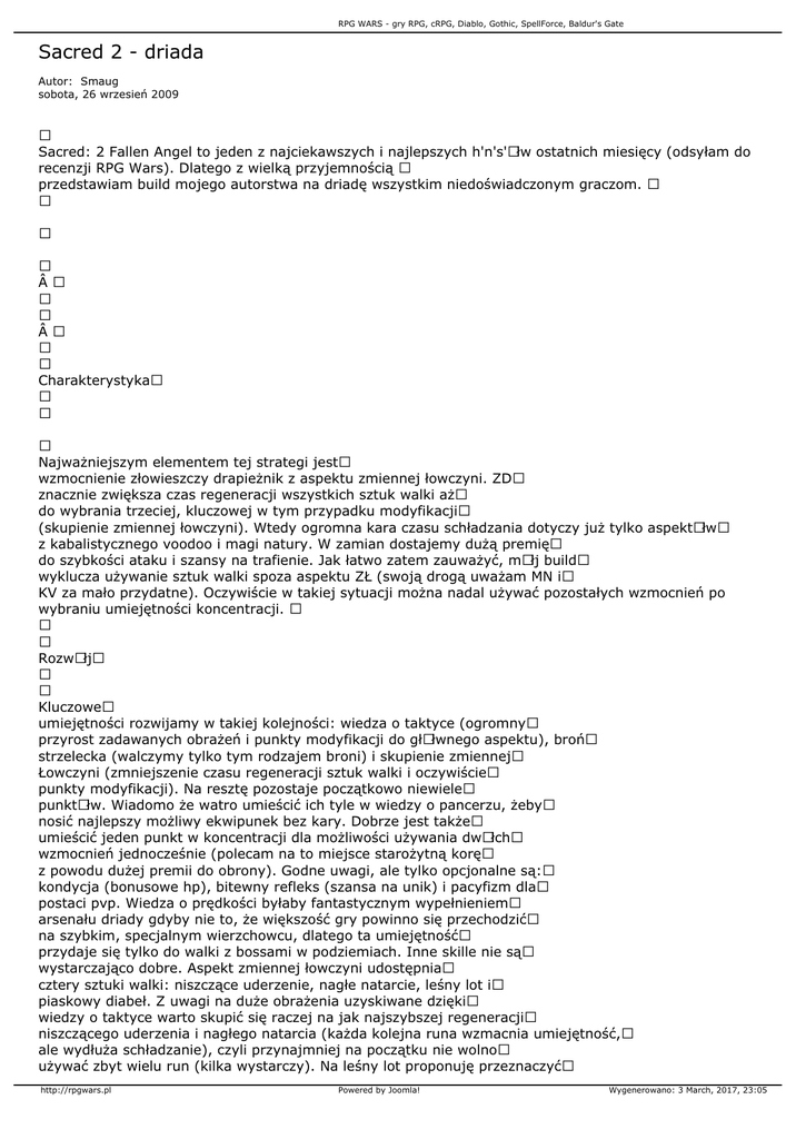 RPG WARS - gry RPG, cRPG, Diablo, Gothic, SpellForce, Baldur's Gate Sacred 2 - driada Autor: Smaug sobota, 26 wrzesień 2009 Sacred: 2 Fallen Angel to jeden z najciekawszych i najlepszych h'n's'Ãłw ostatnich miesięcy (odsyłam do recenzji RPG Wars). Dlatego z wielką przyjemnością przedstawiam build mojego autorstwa na driadę wszystkim niedoświadczonym graczom.   Charakterystyka Najważniejszym elementem tej strategi jest wzmocnienie złowieszczy drapieżnik z aspektu zmiennej łowczyni. ZD znacznie zwiększa czas regeneracji wszystkich sztuk walki aż do wybrania trzeciej, kluczowej w tym przypadku modyfikacji (skupienie zmiennej łowczyni). Wtedy ogromna kara czasu schładzania dotyczy już tylko aspektÃłw z kabalistycznego voodoo i magi natury. W zamian dostajemy dużą premię do szybkości ataku i szansy na trafienie. Jak łatwo zatem zauważyć, mÃłj build wyklucza używanie sztuk walki spoza aspektu ZŁ (swoją drogą uważam MN i KV za mało przydatne). Oczywiście w takiej sytuacji można nadal używać pozostałych wzmocnień po wybraniu umiejętności koncentracji. RozwÃłj Kluczowe umiejętności rozwijamy w takiej kolejności: wiedza o taktyce (ogromny przyrost zadawanych obrażeń i punkty modyfikacji do głÃłwnego aspektu), broń strzelecka (walczymy tylko tym rodzajem broni) i skupienie zmiennej Łowczyni (zmniejszenie czasu regeneracji sztuk walki i oczywiście punkty modyfikacji). Na resztę pozostaje początkowo niewiele punktÃłw. Wiadomo że watro umieścić ich tyle w wiedzy o pancerzu, żeby nosić najlepszy możliwy ekwipunek bez kary. Dobrze jest także umieścić jeden punkt w koncentracji dla możliwości używania dwÃłch wzmocnień jednocześnie (polecam na to miejsce starożytną korę z powodu dużej premii do obrony). Godne uwagi, ale tylko opcjonalne są: kondycja (bonusowe hp), bitewny refleks (szansa na unik) i pacyfizm dla postaci pvp. Wiedza o prędkości byłaby fantastycznym wypełnieniem arsenału driady gdyby nie to, że większość gry powinno się przechodzić na szybkim, specjalnym wierzchowcu, dlatego ta umiejętność przydaje się tylko do walki z bossami w podziemiach. Inne skille nie są wystarczająco dobre. Aspekt zmiennej łowczyni udostępnia cztery sztuki walki: niszczące uderzenie, nagłe natarcie, leśny lot i piaskowy diabeł. Z uwagi na duże obrażenia uzyskiwane dzięki wiedzy o taktyce warto skupić się raczej na jak najszybszej regeneracji niszczącego uderzenia i nagłego natarcia (każda kolejna runa wzmacnia umiejętność, ale wydłuża schładzanie), czyli przynajmniej na początku nie wolno używać zbyt wielu run (kilka wystarczy). Na leśny lot proponuję przeznaczyć http://rpgwars.pl Powered by Joomla! Wygenerowano: 3 March, 2017, 23:05 RPG WARS - gry RPG, cRPG, Diablo, Gothic, SpellForce, Baldur's Gate tylko jeden punkt dla jak najszybszej teleportacji i modyfikować na końcu razem z piaskowym diabłem. A teraz modyfikacje sztuk walki w kolejności od najważniejszych: sokole oko albo szybki ostrzał, strzał mierzony, skupienie zmiennej łowczyni (wszystko dla złowieszczego drapieżnika), przeładowanie, odepchnięcie, rotacja (nagłe natarcie) i zatrucie, śledzenie, podwÃłjny strzał (niszczące uderzenie). Modyfikacje wybrane do mojego buildu powinny zapewnić maksymalną wygodę gry i siłę ognia. Ostatnim elementem rozwoju postaci są atrybuty. Tutaj najprościej jak może być, czyli każdy punkt do zręczności, po prostu najlepszy z możliwych wyborÃłw dla driady (wszystko inne jest w przedmiotach i umiejętnościach). Inne W kwestii wyboru przedmiotÃłw nie mogę powiedzieć nic odkrywczego z powodu systemu obowiązującego w Sacred 2. OgÃłlnie trzeba wymieniać wsztysko co pewien czas na ekwpipunek jak najwyższego poziomu. Jeśli miałbym polecić jakiś set to najbardziej naturalnym dla tej postaci wydaje się set Detheya's Agility (łatwo znaleźć kilka części samemu) systematycznie uzupełniany o części z coraz wyższego poziomu wraz z awansem postaci. Najlepszym elementem tej driady jest oczywiście gra, pozwalająca bardzo szybko eliminować przeciwnikÃłw i to w dodatku na dystans. Komentarz, sugestie dotyczące tego tekstu proszę wysyłać na mail redakcyjny. http://rpgwars.pl Powered by Joomla! Wygenerowano: 3 March, 2017, 23:05