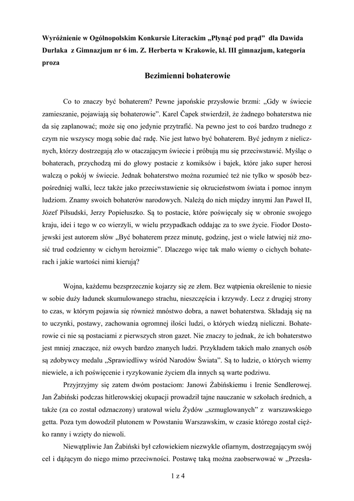 Wyróżnienie w Ogólnopolskim Konkursie Literackim „Płynąć pod prąd” dla Dawida Durlaka z Gimnazjum nr 6 im. Z. Herberta w Krakowie, kl. III gimnazjum, kategoria proza Bezimienni bohaterowie Co to znaczy być bohaterem? Pewne japońskie przysłowie brzmi: „Gdy w świecie zamieszanie, pojawiają się bohaterowie”. Karel Čapek stwierdził, że żadnego bohaterstwa nie da się zaplanować; może się ono jedynie przytrafić. Na pewno jest to coś bardzo trudnego z czym nie wszyscy mogą sobie dać radę. Nie jest łatwo być bohaterem. Być jednym z nielicznych, którzy dostrzegają zło w otaczającym świecie i próbują mu się przeciwstawić. Myśląc o bohaterach, przychodzą mi do głowy postacie z komiksów i bajek, które jako super herosi walczą o pokój w świecie. Jednak bohaterstwo można rozumieć też nie tylko w sposób bezpośredniej walki, lecz także jako przeciwstawienie się okrucieństwom świata i pomoc innym ludziom. Znamy swoich bohaterów narodowych. Należą do nich między innymi Jan Paweł II, Józef Piłsudski, Jerzy Popiełuszko. Są to postacie, które poświęcały się w obronie swojego kraju, idei i tego w co wierzyli, w wielu przypadkach oddając za to swe życie. Fiodor Dostojewski jest autorem słów „Być bohaterem przez minutę, godzinę, jest o wiele łatwiej niż znosić trud codzienny w cichym heroizmie”. Dlaczego więc tak mało wiemy o cichych bohaterach i jakie wartości nimi kierują? Wojna, każdemu bezsprzecznie kojarzy się ze złem. Bez wątpienia określenie to niesie w sobie duży ładunek skumulowanego strachu, nieszczęścia i krzywdy. Lecz z drugiej strony to czas, w którym pojawia się również mnóstwo dobra, a nawet bohaterstwa. Składają się na to uczynki, postawy, zachowania ogromnej ilości ludzi, o których wiedzą nieliczni. Bohaterowie ci nie są postaciami z pierwszych stron gazet. Nie znaczy to jednak, że ich bohaterstwo jest mniej znaczące, niż owych bardzo znanych ludzi. Przykładem takich mało znanych osób są zdobywcy medalu „Sprawiedliwy wśród Narodów Świata”. Są to ludzie, o których wiemy niewiele, a ich poświęcenie i ryzykowanie życiem dla innych są warte podziwu. Przyjrzyjmy się zatem dwóm postaciom: Janowi Żabińskiemu i Irenie Sendlerowej. Jan Żabiński podczas hitlerowskiej okupacji prowadził tajne nauczanie w szkołach średnich, a także (za co został odznaczony) uratował wielu Żydów „szmuglowanych” z warszawskiego getta. Poza tym dowodził plutonem w Powstaniu Warszawskim, w czasie którego został ciężko ranny i wzięty do niewoli. Niewątpliwie Jan Żabiński był człowiekiem niezwykle ofiarnym, dostrzegającym swój cel i dążącym do niego mimo przeciwności. Postawę taką można zaobserwować w „Przesła1z4 niu Pana Cogito”. W wierszu tym Zbigniew Herbert pokazuje cel. „Ocalałeś nie po to aby żyć masz mało czasu trzeba dać świadectwo [...] Bądź wierny Idź.”. Autor nawołuje każdego z nas do zadania, jakim jest podążanie wytartą ścieżką bohaterów. „Idź dokąd poszli tamci do ciemnego kresu po złote runo nicości twoją ostatnią nagrodę”. Ten, kto odważy się pokonywać tę niezwykle trudną drogę, nie zyska nic w materialnym wymiarze. Tak samo jak Jan Żabiński pozostanie nierozpoznawalny oraz nieznany szerszej opinii społecznej. W wierszu napisane jest: „(…)a nagrodzą cię za to tym co mają pod ręką chłostą śmiechu zabójstwem na śmietniku”. Świadczy to o tym, że ze strony ludzi nie możemy liczyć na żadną pomoc w naszej misji. Niedawno 12 maja tego roku zmarła Irena Sendlerowa, która każdego dnia w czasach okupacji ratowała ludzkie życie i tym samym narażała się na tortury i śmierć. Ta kobieta uratowała dwa i pół tysiąca żydowskich dzieci z warszawskiego getta, a mało kto ją znał. Dopiero w ciągu ostatnich kilkunastu lat zaczęto mówić o tej wybitnej postaci i jej heroizmie. Świat dowiedział się o niej zbyt późno, dlatego też nie doceniono jej w 1977r. nagrodą Nobla. Według mnie ta młoda kobieta zdziałała więcej dla dobra ludzkości niż ktokolwiek inny. Irena Sendlerowa ma swoją listę ocalonych osób, dlatego często porównuje się ją do Oskara Schindlera. Takiego porównania nie lubiła pani Irena i ja się z nią zgadzam, gdyż Oskar Schindler nie ryzykował życia, dając pracę Żydom, wręcz przeciwnie zarabiał na nich. I w ten sposób przy okazji ich ocalił. Irena wraz z osobami współpracującymi tzw. „łącznikami podziemia” – co zawsze podkreślała – ocaliła wiele osób, codziennie narażając się na śmierć. W 1942r. Irena Sendlerowa została aresztowana przez gestapo i torturowana na Pawiaku. Skazana na śmierć przez rozstrzelanie, została ocalona przez przekupionego niemieckiego strażnika. Wzbudza największy podziw jej dalsza działalność w słusznej sprawie. Moim zdaniem niewielu ludzi, którzy przeszli przez piekło Pawiaka „… do dziś mam wizytówki tych nadludzi na swoim ciele…” miałoby odwagę pozostać wiernym swoim ideałom. Ta wielka kobieta – człowiek, z pewnością jest bohaterem o jakiego chodziło Herbertowi. Wracając do wiersza Herberta, czytamy: „Bądź odważny, gdy rozum zawodzi, bądź odważny. W ostatecznym rachunku jedynie to się liczy.” Czym jest ta odwaga? Czy jest jak powiedział Pierre Veron sztuką bania się, aby bania nikt nie zauważył, lub jak to wyraził Alojzy Żółkowski „Odwaga jest czasem i skutkiem strachu”. Sięgając do biografii Zbigniewa Herberta, zauważamy jego osobiste zaangażowanie w działalność opozycji demokratycznej oraz sprzeciw wobec kierowniczej roli partii komunistycznej w państwie. Pokazuje on, żeby być śmiałym i nie wahać się bronić tego, w co wierzymy i co kochamy. Pan Cogito – bohater szeregu wierszy Herberta - jako człowiek myślący nakazuje w życiu kierować się odwagą, re2z4 agować gniewem na krzywdy ludzkie, gardzić „s