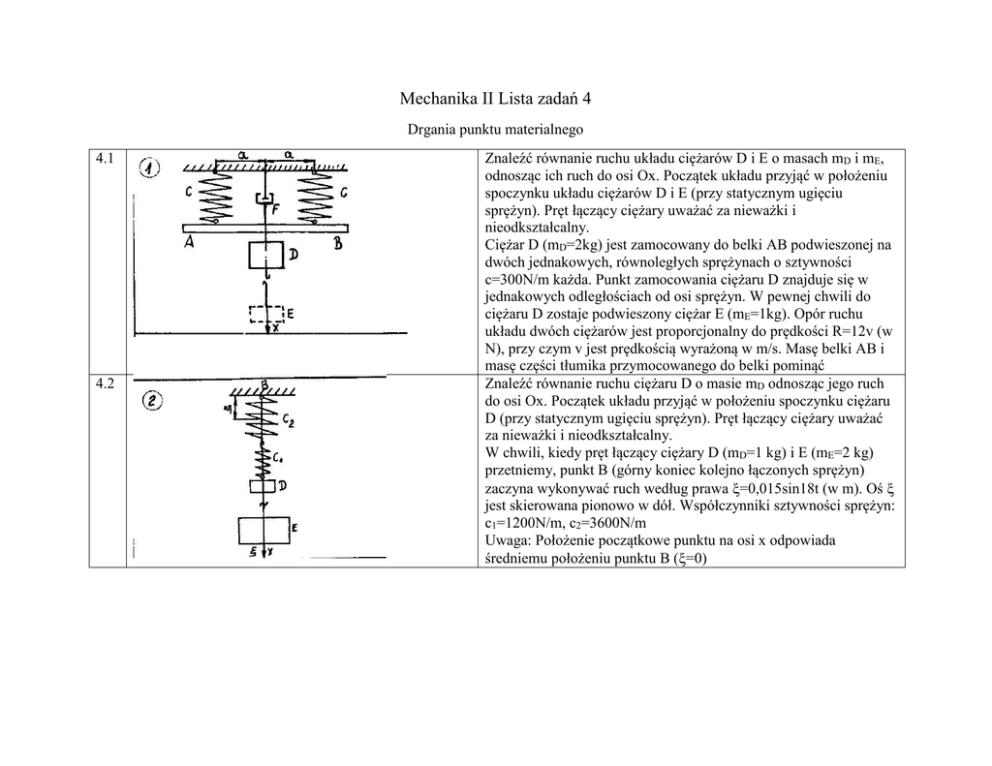 Mechanika II Lista zadań 4 Drgania punktu materialnego 4.1 4.2 Znaleźć równanie ruchu układu ciężarów D i E o masach mD i mE, odnosząc ich ruch do osi Ox. Początek układu przyjąć w położeniu spoczynku układu ciężarów D i E (przy statycznym ugięciu sprężyn). Pręt łączący ciężary uważać za nieważki i nieodkształcalny. Ciężar D (mD=2kg) jest zamocowany do belki AB podwieszonej na dwóch jednakowych, równoległych sprężynach o sztywności c=300N/m każda. Punkt zamocowania ciężaru D znajduje się w jednakowych odległościach od osi sprężyn. W pewnej chwili do ciężaru D zostaje podwieszony ciężar E (mE=1kg). Opór ruchu układu dwóch ciężarów jest proporcjonalny do prędkości R=12v (w N), przy czym v jest prędkością wyrażoną w m/s. Masę belki AB i masę części tłumika przymocowanego do belki pominąć Znaleźć równanie ruchu ciężaru D o masie mD odnosząc jego ruch do osi Ox. Początek układu przyjąć w położeniu spoczynku ciężaru D (przy statycznym ugięciu sprężyn). Pręt łączący ciężary uważać za nieważki i nieodkształcalny. W chwili, kiedy pręt łączący ciężary D (mD=1 kg) i E (mE=2 kg) przetniemy, punkt B (górny koniec kolejno łączonych sprężyn) zaczyna wykonywać ruch według prawa =0,015sin18t (w m). Oś jest skierowana pionowo w dół. Współczynniki sztywności sprężyn: c1=1200N/m, c2=3600N/m Uwaga: Położenie początkowe punktu na osi x odpowiada średniemu położeniu punktu B (=0) 4.3 Znaleźć równanie ruchu układu ciężarów D i E o masach mD i mE, odnosząc ich ruch do osi Ox. Początek układu przyjąć w położeniu spoczynku układu ciężarów D i E (przy statycznym ugięciu sprężyn). Pręt łączący ciężary uważać za nieważki i nieodkształcalny. Do ciężaru D (mD=1,6 kg) wiszącego na sprężynie o sztywności c=400N/m podwieszono ciężar E (mE=2,4 kg). Punkt B (górny koniec sprężyny) zaczyna wykonywać ruch według prawa =0,02sin5t (w m) (oś skierowana jest pionowo w dół). Uwaga: Położenie początkowe punktu na osi x odpowiada średniemu położeniu punktu B (=0) 4.4 Znaleźć równanie ruchu ciężaru D o masie m po gładkiej płaszczyźnie tworzącej z poziomem kąt . Zakłada się, że od chwili styku ciężaru ze sprężyną lub podczas dalszego ruchu ciężar nie oddziela się od sprężyny. Ruch ciężaru odnieść do osi x, przyjmując za punkt początkowy położenie ciężaru w stanie spoczynku (przy statycznym ugięciu sprężyny). Ciężar D (m=1,2 kg) wykonuje ruch bez prędkości początkowej po płaszczyźnie nachylonej do poziomu pod kątem =30o i z odległości s=0,2m uderza o nieodkształconą sprężynę o sztywności c=480 N/m. W tej samej chwili (t=0) punkt B (dolny koniec sprężyny), zaczyna wykonywać w kierunku pochylenia płaszczyzny ruch według prawa =0,03sin12t (w m). Oś jest skierowana w kierunku pochylenia płaszczyzny. Położenie początkowe punktu na osi x odpowiada średniemu położeniu punktu B (=0) 4.5 4.6 Znaleźć równanie ruchu ciężaru D o masie m po gładkiej płaszczyźnie tworzącej z poziomem kąt . Zakłada się, że od chwili styku ciężaru ze sprężyną lub podczas dalszego ruchu ciężar nie oddziela się od sprężyn. Ruch ciężaru odnieść do osi x, przyjmując za punkt początkowy położenie ciężaru w stanie spoczynku (przy statycznym ugięciu sprężyn). Ciężar D (m=1 kg) jest przymocowany do środka belki AB, której końce są połączone z dwoma jednakowymi równoległymi sprężynami, nie posiadając prędkości początkowej sprężyny są nieodkształcone. Współczynniki sztywności sprężyn c=150 N/m. Opór ruchu ciężaru jest proporcjonalny do prędkości R=8v (w N), przy czym v – prędkość (w m/s), =60o. Masę belki AB i przymocowanej do niej części tłumika pominąć. Pomijając masę płyty i uważając ją za doskonale sztywną znaleźć równanie ruchu ciężaru D o masie m z chwilą zetknięcia się go z płytą zakładając, że podczas dalszego ruchu ciężar nie oddziela się od płyty. Ruch ciężaru odnieść od osi x, przyjmując za punkt początkowy położenie spoczynku (przy statycznym ugięciu sprężyn). Płyta leży na dwóch równoległych sprężynach o sztywnościach c1= 60000N/m i c2=40000N/m. Ciężar D (m=50 kg) spada bez prędkości początkowej z wysokości h=0,1m w punkcie F znajdującym się w odległościach a i b od osi sprężyn; a:b=c2:c1. 4.7 Na nieważkim pręcie OB, zawieszonym obrotowo w punkcie O, pomocowano w punkcie A ciężar D o masie mD=3 kg. W punkcie A przymocowano układ sprężyn o stałych C1=C2=800N/m, C3=4800N/m. W punkcie B pręta przymocowano sprężynę oraz tłumik wiskotyczny generujący siłę oporu R=24v [N], przy czym v – prędkość (w m/s). W położeniu równowagi statycznej sprężyny są nieodkształcone. W pewnej chwili masę D wychylono z położenia równowagi o 0,02 m w lewo i puszczono bez prędkości początkowej. Znaleźć równania ruchu ciała D. Uwzględnić tzw. zakres małych drgań. 4.8 Na nieważkim pręcie OB, zawieszonym obrotowo w punkcie O, pomocowano w punkcie B ciężar D o masie mD=1.4 kg. W punkcie A przymocowano układ sprężyn o stałych C1=C2=900N/m, C3=1800N/m. W położeniu równowagi statycznej sprężyny są nieodkształcone. W pewnej chwili masę D wychylono z położenia równowagi o 0,03 m w lewo i puszczono bez prędkości początkowej. Jednocześnie na punkt D zaczęła działać siła P=6sin(8t) [N]. Znaleźć równania ruchu ciała D. Uwzględnić tzw. zakres małych drgań.