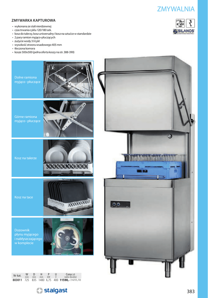 ZMYWALNIA ZMYWARKA KAPTUROWA • • • • • • • • wykonana ze stali nierdzewnej czas trwania cyklu 120/180 sek. kosz do talerzy, kosz uniwersalny i kosz na sztućce w standardzie 2 pary ramion myjąco-płuczących zużycie wody 3 l/cykl wysokość otworu wsadowego 405 mm tłoczona komora kosze 500x500 (pełna oferta koszy na str. 388-390) Dolne ramiona myjąco - płuczące Górne ramiona myjąco - płuczące Kosz na talerze Kosz na tace Dozownik płynu myjącego i nabłyszczającego w komplecie W D H P U Cena (zł) Nr kat. mm mm mm kW V netto (brutto) 803011 725 835 1480 6,75 400 11590,- (14255,70) 383 ZMYWALNIA ZMYWARKA KAPTUROWA • • • • • • • • wykonana ze stali nierdzewnej czas trwania cyklu 75/120/180 sek. kosze do talerzy, kosz uniwersalny i kosz na sztućce w standardzie 2 pary ramion myjąco-płuczących zużycie wody 3 l/cykl wysokość otworu wsadowego 405 mm kosze 500x500 (pełna oferta koszy na str. 388-390) model 803017 (wysokość zmywarki otwartej H=1920 mm, głębokość z rączką D=825 mm, szerokość z rączką W=725 mm) Dozownik płynu myjącego i nabłyszczającego w komplecie Nr kat. Produkt 803015 Zmywarka kapturowa Zmywarka kapturowa z pompą 803016 wspomagającą płukanie Zmywarka kapturowa z dozownikiem płynu myjącego, 803017 z pompą wspomagąjącą płukanie, z automatycznym zmiękczaczem wody 384 W mm D mm H mm P kW U V Cena (zł) netto (brutto) 725 835 1480 11,1 400 12500,- (15375,00) 725 835 1480 11,1 400 13200,- (16236,00) 725 835 1480 11,1 400 13910,- (17109,30) ZMYWALNIA ZMYWARKA DO GARNKÓW • • • • • • wykonana ze stali nierdzewnej czas trwania cyklu 60/120/180/600 sek. pompa wspomagająca płukanie elektroniczny panel sterowania z wyświetlaczem temperatury rozmiar kosza 570x570 mm otwór wsadowy h = 620 mm Dozownik płynu myjącego i nabłyszczającego w komplecie W D H P U Cena (zł) Nr kat. mm mm mm kW V netto (brutto) 805010 680 755 1665 11,42 400 17990,- (22127,70) 385 ZMYWALNIA STANOWISKO PODŁĄCZENIA ZMYWARKI GASTRONOMICZNEJ Do każdej zmywarki używać wody o twardości do 6°dH w skali niemieckiej (twardsza woda powoduje osadzanie kamienia na grzałkach co może spowodować uszkodzenie i utratę gwarancji). woda zimna doprowadzenie h = 200 ÷ 600 mm Ø = 3/4" (kranik montażowy) gniazdo 400 V z wyłącznikiem odcinającym h = 1400 ÷ 1600 mm 6,4 kW/400V 400 Gniazdo 400V 32A - zalecane umieszczenie na wysokości 140 cm do 160 cm nad posadzką, ponad stołem wyładowczym lub zmywarką - dopuszczalne umieszczenie pod blatem stołu wyładowczego na wysokości między 40-60 cm nad posadzką - nie dopuszczalne za zmywarką oraz nad i pod zlewem Odpływ - o średnicy 50mm pod lub z boku zmywarki z zachowaniem przerwy powietrznej Doprowadzenie wody zimnej zakończone zaworem o średnicy ¾” w pobliżu zmywarki - zalecane umieszczenie na wysokości 20-60 cm nad posadzką obok zmywarki 1400 1. Zmywarka na podstawie odpływ h = 0 mm Ø odpływu = 50 mm woda zimna doprowadzenie h = 200 ÷ 600 mm Ø = 3/4" (kranik montażowy) 2. Zmywarka pod blatem 386 400 woda zimna doprowadzenie h = 200 ÷ 600 mm Ø = 3/4" (kranik montażowy) gniazdo 400 V z wyłącznikiem odcinającym h = 1400÷ 1600 mm 6,4 kW/400V 1400 Gniazdo 400V 32A - zalecane umieszczenie na wysokości 140 cm nad posadzką, nad stołem wyładowczym - dopuszczalne umieszczenie pod blatem stołu wyładowczego na wysokości między 40-60 cm nad posadzką. - nie dopuszczalne za zmywarką oraz nad i pod zlewem Odpływ - o średnicy 50mm pod lub z boku zmywarki z zachowaniem przerwy powietrznej Doprowadzenie wody zimnej zakończone zaworem o średnicy ¾” w pobliżu zmywarki - zalecane umieszczenie na wysokości 20-60 cm nad posadzką obok zmywarki odpływ h = 0 mm Ø odpływu = 50 mm 400 3. Zmywarka kapturowa 1400 Gniazdo 400V 32A - zalecane umieszczenie na wysokości 140 cm do 160 cm nad posadzką, ponad stołem wyładowczym lub zmywarką - dopuszczalne umieszczenie pod blatem stołu wyładowczego na wysokości między 40-60 cm nad posadzką - nie dopuszczalne za zmywarką oraz nad i pod zlewem Odpływ - o średnicy 50mm pod lub z boku zmywarki z zachowaniem przerwy powietrznej Doprowadzenie wody zimnej zakończone zaworem o rednicy ¾” w pobliżu zmywarki - zalecane umieszczenie na wysokości 20-60 cm nad posadzką obok zmywarki gniazdo 400 V z wyłącznikiem odcinającym h = 1400÷ 1600 mm 6,4 kW/400V odpływ h = 0 mm Ø odpływu = 50 mm
