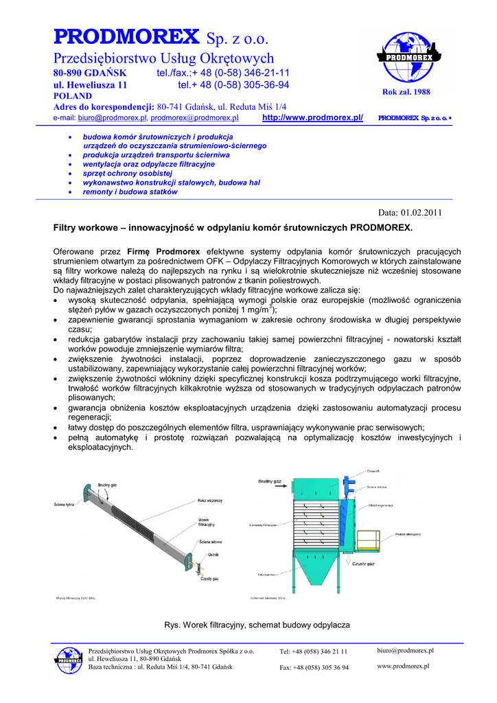PRODMOREX Sp. z o.o. Przedsiębiorstwo Usług Okrętowych 80-890 GDAŃSK ul. Heweliusza 11 tel./fax.:+ 48 (0-58) 346-21-11 tel.+ 48 (0-58) 305-36-94 POLAND Adres do korespondencji: 80-741 Gdańsk, ul. Reduta Miś 1/4 e-mail: [email protected], [email protected] http://www.prodmorex.pl/ Rok zał. 1988 PRODMOREX Sp. z o. o. budowa komór śrutowniczych i produkcja urządzeń do oczyszczania strumieniowo-ściernego produkcja urządzeń transportu ścierniwa wentylacja oraz odpylacze filtracyjne sprzęt ochrony osobistej wykonawstwo konstrukcji stalowych, budowa hal remonty i budowa statków Data: 01.02.2011 Filtry workowe – innowacyjność w odpylaniu komór śrutowniczych PRODMOREX. Oferowane przez Firmę Prodmorex efektywne systemy odpylania komór śrutowniczych pracujących strumieniem otwartym za pośrednictwem OFK – Odpylaczy Filtracyjnych Komorowych w których zainstalowane są filtry workowe należą do najlepszych na rynku i są wielokrotnie skuteczniejsze niż wcześniej stosowane wkłady filtracyjne w postaci plisowanych patronów z tkanin poliestrowych. Do najważniejszych zalet charakteryzujących wkłady filtracyjne workowe zalicza się: wysoką skuteczność odpylania, spełniającą wymogi polskie oraz europejskie (możliwość ograniczenia 3 stężeń pyłów w gazach oczyszczonych poniżej 1 mg/m ); zapewnienie gwarancji sprostania wymaganiom w zakresie ochrony środowiska w długiej perspektywie czasu; redukcja gabarytów instalacji przy zachowaniu takiej samej powierzchni filtracyjnej - nowatorski kształt worków powoduje zmniejszenie wymiarów filtra; zwiększenie żywotności instalacji, poprzez doprowadzenie zanieczyszczonego gazu w sposób ustabilizowany, zapewniający wykorzystanie całej powierzchni filtracyjnej worków; zwiększenie żywotności włókniny dzięki specyficznej konstrukcji kosza podtrzymującego worki filtracyjne, trwałość worków filtracyjnych kilkakrotnie wyższa od stosowanych w tradycyjnych odpylaczach patronów plisowanych; gwarancja obniżenia kosztów eksploatacyjnych urządzenia dzięki zastosowaniu automatyzacji procesu regeneracji; łatwy dostęp do poszczególnych elementów filtra, usprawniający wykonywanie prac serwisowych; pełną automatykę i prostotę rozwiązań pozwalającą na optymalizację kosztów inwestycyjnych i eksploatacyjnych. Rys. Worek filtracyjny, schemat budowy odpylacza Przedsiębiorstwo Usług Okrętowych Prodmorex Spółka z o.o. ul. Heweliusza 11, 80-890 Gdańsk Baza techniczna : ul. Reduta Miś 1/4, 80-741 Gdańsk Tel: +48 (058) 346 21 11 [email protected] Fax: +48 (058) 305 36 94 www.prodmorex.pl Filtry workowe – innowacyjność w odpylaniu komór śrutowniczych Prodmorex Odpylacz z wkładami filtracyjnymi workowymi - główne urządzenie oczyszczające powietrze. Konstrukcja obudowy filtra wykonana jest z blachy stalowej. Komory gazu zanieczyszczonego, wprowadzanego do filtra i gazu oczyszczonego oddzielone są od siebie płytą z otworami w której mocowane są worki filtracyjne. W komorze gazu oczyszczonego znajdują się duże, łatwe w obsłudze drzwi inspekcyjne umożliwiające łatwy dostęp do worków. Gaz zanieczyszczony doprowadzany jest do komory w sposób ustabilizowany, zapewniający wykorzystanie całej powierzchni filtracyjnej worków. Konstrukcja kosza podtrzymująca worki filtracyjne powoduje zmniejszenie naprężeń powstających we włókninie podczas pracy filtra, a co za tym idzie zwiększenie jej żywotności. Kształt kosza uniemożliwia fałdowanie się worków. Nowatorski kształt worków (FLAT BAG) i ułożenie ich w poziomie spowodowało znaczne pomniejszenie wymiarów filtra przy zachowaniu takiej samej powierzchni filtracji. Nie jest wymagana przestrzeń nad filtrem, a wymiana worków przy ich poziomym ułożeniu jest znacznie łatwiejsza. 3 Gwarantujemy na instalacji osiągnięcie emisji pyłu nie większej niż 5 mg/m co określone jest w normie, a praktycznie co potwierdzają nasze pierwsze realizacje wynosi ono nawet poniżej 2 mg/m³ (potwierdzone niezbędnymi pomiarami). Modułowy filtr workowy to urządzenie z regeneracją włókniny za pomocą sprężonego powietrza. Regeneracja następuje poprzez wstrzelenie sprężonego powietrza do wnętrza worków filtracyjnych za pomocą dyszy regeneracyjnej wyposażonej w inżektor. Stosując powyższy system regeneracji uzyskujemy znacznie niższy poziom emisji niż w przypadku rozwiązań dotychczasowych przy wkładach patronowych oraz wydłużamy żywotność tkaniny filtracyjnej. Przedstawiony system dzięki bardzo skutecznej regeneracji stosowany jest do filtrów odpylających bardzo drobne i trudno regenerowalne pyły oraz w przypadku potrzeby uzyskania bardzo niskich norm emisji pyłów. W filtrach o dużych wydajnościach stosowanie tego systemu jest rozwiązaniem znacznie bardziej ekonomicznym od rozwiązań opartych o patrony plisowane. Odpylacze z wkładami filtracyjnymi workowymi zostały zainstalowane w następujących firmach: Bombardier Wrocław, Chemar Kielce, Kontur Żyrardów. Prodmorex od 2008 roku wyeliminował w swoich odpylaczach patronowe, plisowane wkłady filtracyjne. Zastąpiono je nowoczesnymi, innowacyjnymi wkładami workowymi LÜHR Filter, znacznie skuteczniejszymi i zdecydowanie tańszymi w eksploatacji. Rys. Odpylacz workowy oraz widok na korpus ze ścianami podwieszeń koszy na filtry workowe. Przedsiębiorstwo Usług Okrętowych Prodmorex Spółka z o.o. ul. Heweliusza 11, 80-890 Gdańsk Baza techniczna : ul. Reduta Miś 1/4, 80-741 Gdańsk Tel: +48 (058) 346 21 11 [email protected] Fax: +48 (058) 305 36 94 www.prodmorex.pl 2