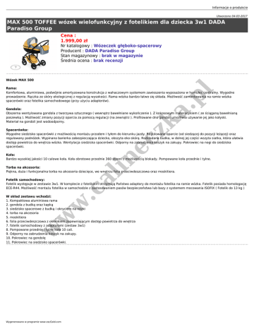 Informacje o produkcie Utworzono 04-03-2017 MAX 500 TOFFEE wózek wielofunkcyjny z fotelikiem dla dziecka 3w1 DADA Paradiso Group Cena : 1.999,00 zł Nr katalogowy : Wózeczek głęboko-spacerowy Producent : DADA Paradiso Group Stan magazynowy : brak w magazynie Średnia ocena : brak recenzji Wózek MAX 500 zk a. pl Rama: Komfortowa, aluminiowa, podwójnie amortyzowana konstrukcja z wahaczowym systemem zawieszenia wyposażona w hamulec centralny. Wygodne prowadzenie. Rączka ze skóry ekologicznej z regulacją wysokości. Rama wózka bardzo łatwo się składa. Możliwość zamontowania na ramie wózka spacerówki oraz fotelika samochodowego (przy użyciu adapterów). Gondola: Obszerna wentylowana gondola z tworzywa sztucznego ( wewnątrz bawełniane wykończenie ). Z kokosowym materacykiem ( ze ściąganą bawełnianą poszewką ). Możliwość zmiany pozycji oparcia za pomocą regulacji (na zewnątrz ). Profilowane dno gondoli umożliwia używanie jej jako kołyski. Materiał na gondoli jest wodoodporny. ec Spacerówka: Wygodne siedzisko spacerówki z możliwością montażu przodem i tyłem do kierunku jazdy. Regulowane oparcie (od siedzącej do pozycji leżącej) oraz regulowany podnóżek. Wypinana barierka zabezpieczająca dziecko, obszyta eko-skórą. Rozkładana budka, w dolnej jej części wszyta siatka, która ułatwia dostęp powietrza do wnętrza wózka. Wentylacja siedziska spacerówki. Odporny na zabrudzenia koszyk na zakupy. Pokrowiec na nogi do siedziska spacerówki. in Koła: Bardzo wysokiej jakości 10 calowe koła. Koła obrotowe przednie 360 stopni z możliwością blokady. Pompowane koła przednie i tylne. .c al Torba na akcesoria: Piękna, duża i funkcjonalna torba na akcesoria dziecięce, we wnętrzu folia przeciwdeszczowa oraz moskitiera. Fotelik samochodowy: Fotelik występuje w zestawie 3w1. W komplecie z fotelikiem otrzymują Państwo adaptory do montażu fotelika na ramie wózka. Fotelik posiada homologację ECE-R44. Możliwość montażu fotelika w samochodzie z zastosowaniem pasów bezpieczeństwa lub bazy z systemem mocowania ISOFIX ( Fotelik do 13 kg ) w w w W skład zestawu wchodzi: 1. Kompaktowa aluminiowa rama 2. gondola z budką oraz kapką 3. siedzisko spacerowe z budką i okryciem na nóżki 4. torba na akcesoria 5. moskitiera 6. folia przeciwdeszczowa z okienkiem zapewniającym dostęp powietrza do wnętrza 7. fotelik samochodowy z adaptorami (zestaw 3w1) 8. Pompowane przednie i tylne koła 10 cali. 9. Odporny na zabrudzenia koszyk na zakupy. 10. Pokrowiec na gondolę 11. Pokrowiec na siedzisko spacerówki. Wygenerowano w programie www.oscGold.com