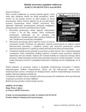 Budzik sterowany sygnałem radiowym KARTA GWARANCYJNA seria 09/2016 Szanowni Klienci! Nasze wyroby poddawane są surowej kontroli jakości. Jeżeli mimo tego zakupiony budzik nie działa prawidłowo, należy zwrócić się do naszego serwisu na adres podany na karcie gwarancyjnej. Można również zgłaszać się do nas pod podany na karcie gwarancyjnej numer infolinii serwisowej. Przy zgłaszaniu reklamacji gwarancyjnych obwiązują następujące, nieograniczające ustawowo określonych praw zasady: 1. Roszczenia gwarancyjne można zgłaszać maksymalnie w czasie 3 lat od daty zakupu. Nasze świadczenia gwarancyjne ograniczają się do usunięcia wad materiałowych i produkcyjnych bądź wymiany budzika na inny. Świadczenia gwarancyjne są bezpłatne. 2. Roszczenia gwarancyjne należy zgłaszać zawsze od razu po zauważeniu usterek. Wyklucza się zgłaszanie roszczeń gwarancyjnych po upływie okresu obowiązywania gwarancji, z wyjątkiem sytuacji, gdy roszczenie gwarancyjne zostanie zgłoszone przed upływem 2 tygodni po ustaniu obowiązywania okresu gwarancyjnego. 3. Uszkodzony budzik prosimy przesłać na nasz koszt na adres serwisu wraz z kartą gwarancyjną i paragonem. Jeżeli uszkodzenie podlega naprawie w ramach naszej gwarancji, odeślemy naprawiony lub nowy budzik. Naprawa lub wymiana budzika nie rozpoczyna nowego okresu gwarancji. Nadal obowiązuje trzyletni okres gwarancji począwszy od daty sprzedaży. Ta sama zasada obowiązuje również w przypadku korzystania z lokalnego serwisu znajdującego się na miejscu. Należy pamiętać, że gwarancja wygasa w przypadku niewłaściwego korzystania z budzika, nieprzestrzegania środków bezpieczeństwa, użycia siły lub dokonywania napraw przez nieautoryzowane serwisy. Gwarancja nie obejmuje baterii, skutków nieprawidłowego stosowania, upadku, uderzenia, pęknięcia szkiełka itp. Uszkodzenia nieobjęte (lub już nieobjęte) zakresem gwarancji lub uszkodzenia, które spowodowały wygaśnięcie gwarancji, usuwamy odpłatnie. Budzik prosimy przesłać na adres naszego serwisu: KRIPPL-WATCHES Regus Plaza, 1 piętro ul. Prusa 2, 00-493 Warszawa E-mail: [email protected], Nr telefonu: 022 657 04 45 Prosimy dołączyć niniejszą kartę gwarancyjną. 1/2 Dok.Rev.Nr.PO7287_20160307_GK_PL Prosimy wypełnić poniższe dane adresowe DRUKOWANYMI LITERAMI. Ułatwi to przesyłkę zwrotną. Imię: Nazwisko: Ulica: Kod, miejscowość: Nr telefonu: E-mail: Opis usterki:____________________________________________________________________ _______________________________________________________________________________ _______________________________________________________________________________ _______________________________________________________________________________ _______________________________________________________________________________ 2/2