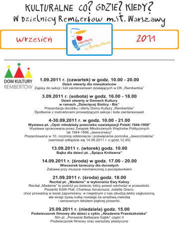1.09.2011 r. (czwartek) w godz. 10.00 - 20.00 Dzieñ otwarty dla mieszkañców Zapisy do sekcji i kó³ zainteresowañ dzia³aj¹cych w DK „Rembertów” 3.09.2011 r. (sobota) w godz. 16.00 - 18.00 Dzieñ otwarty w Domach Kultury w ramach „Dzieciêcej Stolicy - Bis” Prezentacja dorobku i oferty Domu Kultury „Rembertów” Spotkanie z instruktorami prowadz¹cymi sekcje i ko³a zainteresowañ 4-30.09.2011 r. w godz. 10.00 - 21.00 Wystawa pt. „Opór m³odzie¿y przeciwko sowietyzacji Polski 1944-1958” Wystawa opracowana przez Zwi¹zek M³odocianych WiêŸniów Politycznych lat 1944-1956 „Jaworzniacy” Prezentowana w 10. rocznicê ods³oniêcia i poœwiêcenia pomnika „Jaworzniaków” (wernisa¿ odbêdzie siê 14.09.2011 r. o godz.12.45) 13.09.2011 r. (wtorek) godz. 10.00 Bajka dla dzieci pt. „Œpi¹ca Królewna” 14.09.2011 r. (œroda) w godz. 17.00 - 20.00 Wieczorek taneczny dla doros³ych Zabawa przy muzyce mechanicznej z poczêstunkiem 21.09.2011 r. (œroda) godz. 18.00 Recital pt. „Madame” w wykonaniu Ewy Kabsy Recital „Madame” to podró¿ po œwiecie, który powoli odchodzi w przesz³oœæ. Piosenki Edith Piaf, Charlesa Aznavoura, Juliette Greco, choæ prowadz¹ w œwiat zapomniany, w niejednym z nas obudz¹ lekko zag³uszon¹, ale wci¹¿ ¿yw¹ nutkê nostalgii za wra¿liw¹ melodi¹ i sensownym tekstem piêknej piosenki. 25.09.2011 r. (niedziela) godz. 15.00 Podwieczorek filmowy dla dzieci z cyklu „Akademia Przedszkolaka” film pt. „Porwanie Baltazara G¹bki” czêœæ II Podwieczorek filmowy oraz warsztaty plastyczne 28.09.2011 r. (œroda) godz. 17.00 Spotkanie z artystk¹ Natali¹ Andrzejewsk¹ nt. „Wenecja magiczna” Spotkanie z cyklu „Podró¿e po najciekawszych zak¹tkach œwiata” 30.09.2011 r. (pi¹tek) godz. 19.00 Projekcja filmu pt. „Boso, ale na rowerze”, re¿. Felix Geoeningen (czarna komedia) Spotkanie Rembertowskiego Klubu Filmowego 1-30.09.2011 r. w godz. 14.00 - 19.30 Wystawa prac plastycznych Wystawa uczestników akcji „Lato w mieœcie 2011” 2.09.2011 r. (pi¹tek) w godz. 16.00 - 18.00 Dzieñ otwarty w Domach Kultury w ramach „Dzieciêcej Stolicy - Bis” Prezentacja dorobku i oferty DK „Wygoda” Zapisy do sekcji i kó³ zainteresowañ dzia³aj¹cych w DK „Wygoda” 5.09 - 31.10.2011 r. w godz. 14.00 - 19.30 Wystawa malarska Wandy Miko³ajewskiej pt. „Moje malarstwo” Obrazy malowane technik¹ olejn¹ i akwarel¹ 18.09.2011 r. (niedziela) w godz. 17.00 - 18.30 Wieczór poezji El¿biety Czajki z udzia³em harcerskiego teatru „Paradox” poœwiêcony kombatantom pt. „O nich pamiêtamy” W programie wiersze powstañców z prawej strony Wis³y 30.09.2011 r. (pi¹tek) w godz. 18.00 - 19.30 Koncert muzyczny „Daniel Zakoœcielny i przyjaciele” w ramach cyklu „Rembertowskie spotkanie z muzyk¹ i poezj¹” Wykonawcy: Micha³ Szafraniec - wokal, Artur W³odkowski - saksofony, Andrzej Kowalski - bas, Marcin Piszczorowicz - perkusja, Adam Jujka - instrumenty perkusyjne, Marcin Piêkos - instrumenty klawiszowe, Daniel Zakoœcielny - gitary. Koncert cechuje mieszanka ró¿nych stylów poprzez bluesa, balladê i funk-uj¹c¹ piosenkê. 1.09.2011 r. (czwartek) godz. 9.00 Obchody 72. rocznicy wybuchu II Wojny Œwiatowej Koœció³ pw. Œw. O. Rafa³a Kalinowskiego przy al. gen. A. Chruœciela 103 9.00 - Msza Œwiêta w intencji ofiar II Wojny Œwiatowej 9.50 - Ceremonia z³o¿enia wieñców Pomnik przy ul. PowroŸniczej 10.30 - Ceremonia z³o¿enia wieñców 4.09.2011 r. (niedziela) godz. 10.00 Obchody 10. rocznicy ods³oniêcia pomnika „Jaworzniaków” w Dzielnicy Rembertów m.st. Warszawy Koœció³ M.B. Zwyciêskiej, ul. Grzybowa 1 10.00 - Uroczysta Msza Œwiêta z opraw¹ muzyczn¹ Orkiestry Koncertowej „Victoria” Pomnik „Jaworzniaków”, al. Komandosów 11.30 - Odegranie Hymnu Narodowego 11.35 - Wyst¹pienia okolicznoœciowe oraz wrêczenie dyplomów i odznaczeñ 12.00 - Apel pamiêci 12.15 - Ceremonia z³o¿enia wieñców Dom Kultury „Rembertów”, al. Komandosów 8 Wystawa pt. „Opór m³odzie¿y przeciwko sowietyzacji Polski 1944-1956” 13.00 - Koncert pt. „Prawda pieœni¹ pisana” w wykonaniu Lecha Wiewióry Organizatorzy: Urz¹d Dzielnicy Rembertów m.st. Warszawy, Parafia M.B. Zwyciêskiej, Zwi¹zek M³odocianych WiêŸniów Politycznych lat 1944-1956 „Jaworzniacy”, Dom Kultury „Rembertów” 6-30.09.2011 r. w godz. 8.00 - 16.00 Wystawa fotograficzna pt. "Warszawa nieznana” Sala Kolumnowa Ratusza 9.09.2011 r. (pi¹tek) godz. 12.00 Ceremonia z³o¿enia wieñców z okazji 67. rocznicy wyzwolenia Rembertowa przez I Dywizjê Piechoty im. T. Koœciuszki Tablica na frontonie budynku DK „Rembertów” przy ul. Komandosów 8 I cmentarz przy ul. Grzybowej 21.09.2011 r. (œroda) w godz. 13.30 - 16.00 Gala Warszawskiego Festiwalu Edukacji Kulturalnej Sala widowiskowa Klubu Akademii Obrony Narodowej, al. Chruœciela 103, bl.56 Organizatorzy: Pe³nomocnik Prezydenta m.st. Warszawy ds. Edukacji Kulturalnej, Urz¹d Dzielnicy Rembertów m.st. Warszawy, Akademia Obrony Narodowej Wstêp za zaproszeniami Na wszystkie imprezy z wyj¹tkiem Gali w dniu 21 wrzeœnia - wstêp wolny Dom Kultury „Rembertów”, al. Komandosów 8, tel. (22) 611 96 87 [email protected] , www.dkrembertow.waw.pl Dom Kultury „Wygoda”, ul. Koniecpolska 14, tel. (22) 812 06 33 [email protected] , www.dkwygoda.waw.pl Biblioteka Publiczna im. Jana Paw³a II w Dzielnicy Rembertów m.st. Warszawy [email protected] , www.rembertow.e-bp.pl - Biblioteka dla Dzieci i M³odzie¿y Nr 51, ul. Gawêdziarzy 8, tel. (22) 255 39 96 - Wypo¿yczalnia dla Doros³ych i M³odzie¿y Nr 55, ul. Gawêdziarzy 8, tel. (22) 255 39 99 - Wypo¿yczalnia dla Doros³ych i M³odzie¿y Nr 57, ul. Che³m¿yñska 27/35 lok. 31, tel. (22) 612 05 90 - Wypo¿yczalnia dla Doros³ych i M³odzie¿y Nr 61, ul. Niedzia³kowskiego 25, tel. (22) 611 91 36 Wydzia³ Kultury i Promocji, al. gen. A. Chruœciela 28, V piêtro, p. 613, tel. (22) 515 17 17 [email prote