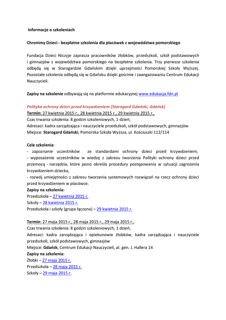 Informacje o szkoleniach Chronimy Dzieci - bezpłatne szkolenia dla placówek z województwa pomorskiego Fundacja Dzieci Niczyje zaprasza pracowników żłobków, przedszkoli, szkół podstawowych i gimnazjów z województwa pomorskiego na bezpłatne szkolenia. Trzy pierwsze szkolenia odbędą się w Starogardzie Gdańskim dzięki uprzejmości Pomorskiej Szkoły Wyższej. Pozostałe szkolenia odbędą się w Gdańsku dzięki gościnie i zaangażowaniu Centrum Edukacji Nauczycieli. Zapisy na szkolenie odbywają się na platformie edukacyjnej www.edukacja.fdn.pl Polityka ochrony dzieci przed krzywdzeniem (Starogard Gdański, Gdańsk) Termin: 27 kwietnia 2015 r., 28 kwietnia 2015 r., 29 kwietnia 2015 r., Czas trwania szkolenia: 8 godzin szkoleniowych, 1 dzień; Adresaci: kadra zarządzająca i nauczyciele przedszkoli, szkół podstawowych, gimnazjów Miejsce: Starogard Gdański, Pomorska Szkoła Wyższa, ul. Kościuszki 112/114 Cele szkolenia: - zapoznanie uczestników ze standardami ochrony dzieci przed krzywdzeniem, - wyposażenie uczestników w wiedzę z zakresu tworzenia Polityki ochrony dzieci przed przemocą - narzędzia, które jasno określa procedury postępowania w sytuacji zagrożenia krzywdzeniem dziecka, - rozwój umiejętności z zakresu tworzenia systemowych rozwiązań na rzecz ochrony dzieci przed krzywdzeniem w placówce. Zapisy na szkolenia: Przedszkola – 27 kwietnia 2015 r. Szkoły – 28 kwietnia 2015 r. Przedszkola i szkoły (grupa łączona) – 29 kwietnia 2015 r. Termin: 27 maja 2015 r., 28 maja 2015 r., 29 maja 2015 r., Czas trwania szkolenia: 8 godzin szkoleniowych, 1 dzień; Adresaci: kadra zarządzająca i opiekunowie żłobków, kadra zarządzająca i nauczyciele przedszkoli, szkół podstawowych, gimnazjów Miejsce: Gdańsk, Centrum Edukacji Nauczycieli, al. gen. J. Hallera 14 Zapisy na szkolenia: Żłobki – 27 maja 2015 r. Przedszkola – 28 maja 2015 r. Szkoły – 29 maja 2015 r. Bezpieczeństwo dzieci i młodzieży w Internecie, w tym edukacja na temat zagrożeń w Internecie (Gdańsk) Termin: 7 maja 2015 r., 8 maja 2015 r., Czas trwania szkolenia: 8 godz., 1 dzień; Adresaci: pedagodzy szkolni, psycholodzy, nauczyciele szkół podstawowych i gimnazjów Miejsce: Gdańsk, Centrum Edukacji Nauczycieli, al. gen. J. Hallera 14 Cel szkolenia: wprowadzenie w problematykę zagrożeń wobec dzieci i młodzieży w internecie oraz podniesienie kompetencji uczestników w zakresie reagowania na niebezpieczne sytuacje doświadczane przez dzieci i młodzież on - line oraz profilaktyki zagrożeń internetowych Zapisy na szkolenia: Szkoły podstawowe – 7 maja 2015 r. Gimnazja – 8 maja 2015 r. Identyfikacja symptomów krzywdzenia dzieci (Gdańsk) Termin: 20 maja 2015 r., 21 maja 2015 r., 22 maja 2015 r. Czas trwania szkolenia: 8 godzin szkoleniowych, 1 dzień; Adresaci: kadra zarządzająca i opiekunowie żłobków, kadra zarządzająca i nauczyciele przedszkoli, szkół podstawowych, gimnazjów Miejsce: Gdańsk, Centrum Edukacji Nauczycieli, al. gen. J. Hallera 14 Cel szkolenia: zdobycie przez uczestników wiedzy dotyczącej rozpoznawania symptomów krzywdzenia dzieci. Zapisy na szkolenia: Żłobki – 20 maja 2015 r. Przedszkola – 21 maja 2015 r. Szkoły – 22 maja 2015 r. Profilaktyka przemocy i wykorzystywania dzieci – przygotowanie do prowadzenia zajęć edukacyjnych z dziećmi (Gdańsk) Termin: 2 czerwca 2015 r., 3 czerwca 2015 r. Czas trwania szkolenia: 8 godzin szkoleniowych, 1 dzień; Adresaci: psycholodzy, nauczyciele przedszkoli i szkół podstawowych Miejsce: : Gdańsk, Centrum Edukacji Nauczycieli, al. gen. J. Hallera 14 Cel szkolenia: zdobycie przez uczestników wiedzy dotyczącej profilaktyki przemocy i wykorzystania seksualnego oraz nabycie umiejętności poprowadzenia zajęć z dziećmi w wieku przedszkolnym/ z dziećmi ze szkół podstawowych wg zaproponowanego scenariusza Zapisy na szkolenia: Przedszkola – 2 czerwca 2015 r. Szkoły podstawowe – 3 czerwca 2015 r.