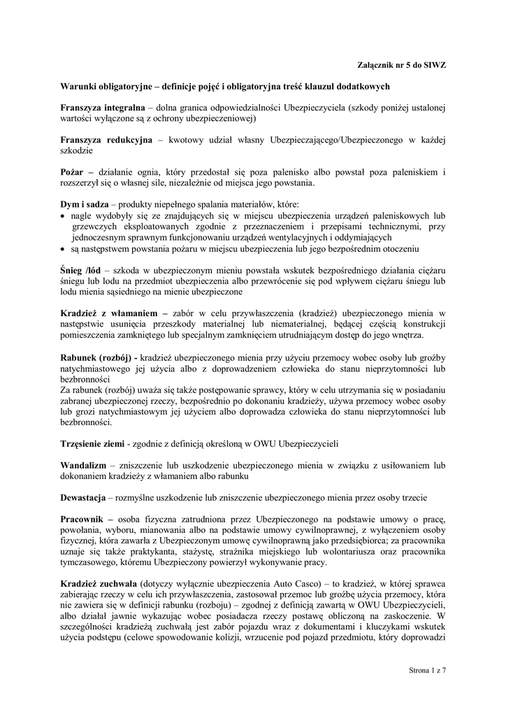 Załącznik nr 5 do SIWZ Warunki obligatoryjne – definicje pojęć i obligatoryjna treść klauzul dodatkowych Franszyza integralna – dolna granica odpowiedzialności Ubezpieczyciela (szkody poniżej ustalonej wartości wyłączone są z ochrony ubezpieczeniowej) Franszyza redukcyjna – kwotowy udział własny Ubezpieczającego/Ubezpieczonego w każdej szkodzie Pożar – działanie ognia, który przedostał się poza palenisko albo powstał poza paleniskiem i rozszerzył się o własnej sile, niezależnie od miejsca jego powstania. Dym i sadza – produkty niepełnego spalania materiałów, które: nagle wydobyły się ze znajdujących się w miejscu ubezpieczenia urządzeń paleniskowych lub grzewczych eksploatowanych zgodnie z przeznaczeniem i przepisami technicznymi, przy jednoczesnym sprawnym funkcjonowaniu urządzeń wentylacyjnych i oddymiających są następstwem powstania pożaru w miejscu ubezpieczenia lub jego bezpośrednim otoczeniu Śnieg /lód – szkoda w ubezpieczonym mieniu powstała wskutek bezpośredniego działania ciężaru śniegu lub lodu na przedmiot ubezpieczenia albo przewrócenie się pod wpływem ciężaru śniegu lub lodu mienia sąsiedniego na mienie ubezpieczone Kradzież z włamaniem – zabór w celu przywłaszczenia (kradzież) ubezpieczonego mienia w następstwie usunięcia przeszkody materialnej lub niematerialnej, będącej częścią konstrukcji pomieszczenia zamkniętego lub specjalnym zamknięciem utrudniającym dostęp do jego wnętrza. Rabunek (rozbój) - kradzież ubezpieczonego mienia przy użyciu przemocy wobec osoby lub groźby natychmiastowego jej użycia albo z doprowadzeniem człowieka do stanu nieprzytomności lub bezbronności Za rabunek (rozbój) uważa się także postępowanie sprawcy, który w celu utrzymania się w posiadaniu zabranej ubezpieczonej rzeczy, bezpośrednio po dokonaniu kradzieży, używa przemocy wobec osoby lub grozi natychmiastowym jej użyciem albo doprowadza człowieka do stanu nieprzytomności lub bezbronności. Trzęsienie ziemi - zgodnie z definicją określoną w OWU Ubezpieczycieli Wandalizm – zniszczenie lub uszkodzenie ubezpieczonego mienia w związku z usiłowaniem lub dokonaniem kradzieży z włamaniem albo rabunku Dewastacja – rozmyślne uszkodzenie lub zniszczenie ubezpieczonego mienia przez osoby trzecie Pracownik – osoba fizyczna zatrudniona przez Ubezpieczonego na podstawie umowy o pracę, powołania, wyboru, mianowania albo na podstawie umowy cywilnoprawnej, z wyłączeniem osoby fizycznej, która zawarła z Ubezpieczonym umowę cywilnoprawną jako przedsiębiorca; za pracownika uznaje się także praktykanta, stażystę, strażnika miejskiego lub wolontariusza oraz pracownika tymczasowego, któremu Ubezpieczony powierzył wykonywanie pracy. Kradzież zuchwała (dotyczy wyłącznie ubezpieczenia Auto Casco) – to kradzież, w której sprawca zabierając rzeczy w celu ich przywłaszczenia, zastosował przemoc lub groźbę użycia przemocy, która nie zawiera się w definicji rabunku (rozboju) – zgodnej z definicją zawartą w OWU Ubezpieczycieli, albo działał jawnie wykazując wobec posiadacza rzeczy postawę obliczoną na zaskoczenie. W szczególności kradzieżą zuchwałą jest zabór pojazdu wraz z dokumentami i kluczykami wskutek użycia podstępu (celowe spowodowanie kolizji, wrzucenie pod pojazd przedmiotu, który doprowadzi Strona 1 z 7 do jego zatrzymania), a także działanie jawne, polegające na zaborze pojazdu chwilowo opuszczonego przez posiadacza, działającego w stanie wyższej konieczności, np. w celu udzielenia pomocy Klauzula likwidacyjna – z zachowaniem pozostałych, niezmienionych niniejszą klauzulą, postanowień umowy ubezpieczenia określonych we wniosku i ogólnych warunkach ubezpieczenia strony uzgodniły, że: Bez względu na stopień amortyzacji lub zużycia technicznego danego przedmiotu ubezpieczenia, ubezpieczonego w wartości księgowej brutto lub odtworzeniowej nowej, odszkodowanie wypłacane jest w pełnej wysokości, obejmującej koszt naprawy, wymiany, nabycia lub odbudowy z uwzględnieniem kosztów montażu, demontażu, transportu, ceł i innych opłat, do sumy ubezpieczenia uszkodzonej, zniszczonej lub utraconej rzeczy, nie więcej jednak niż suma ubezpieczenia albo cena takiej samej lub podobnej rzeczy nowej, w zależności od tego, która z nich jest niższa. Jakiekolwiek postanowienia ogólnych warunków ubezpieczenia, dotyczące proporcjonalnego zmniejszenia odszkodowania lub innej proporcjonalnej jego redukcji, nie będą miały zastosowania. Taka sama zasada wypłaty odszkodowania obowiązuje w przypadku nie odtworzenia przedmiotu ubezpieczenia, przy czym wówczas wysokość odszkodowania wyliczona zostanie na podstawie protokołu szkody, w wysokości odpowiadającej kosztom nabycia lub odtworzenia mienia, nie więcej jednak niż suma ubezpieczenia albo cena takiej samej lub podobnej rzeczy nowej, w zależności od tego, która z nich jest niższa. Klauzula likwidacyjna Auto Casco – z zachowaniem pozostałych, niezmienionych niniejszą klauzulą, postanowień umowy ubezpieczenia określonych we wniosku i ogólnych warunkach ubezpieczenia strony uzgodniły, że: Jeżeli przyjęta w chwili zawierania umowy ubezpieczenia Auto Casco suma ubezpieczenia ubezpieczonego pojazdu jest niższa niż jego faktyczna wartość rynkowa na dzień zawierania umowy, jakiekolwiek postanowienia ogólnych warunków ubezpieczenia, dotyczące proporcjonalnego zmniejszenia odszkodowania lub innej proporcjonalnej jego redukcji z tytułu niedoubezpieczenia nie będą miały zastosowania. Klauzula automatycznego pokrycia – z zachowaniem pozostałych, niezmienionych niniejszą klauzulą postanowień umowy ubezpieczenia określonych we wniosku i ogólnych warunkach ubezpieczenia strony uwzględniły, że: Ubezpieczyciel obejmuje automatyczną ochroną ubezpieczeniową, bez konieczności wcześniejszej deklaracji, wzrost wartości mienia związany z jego nabyciem