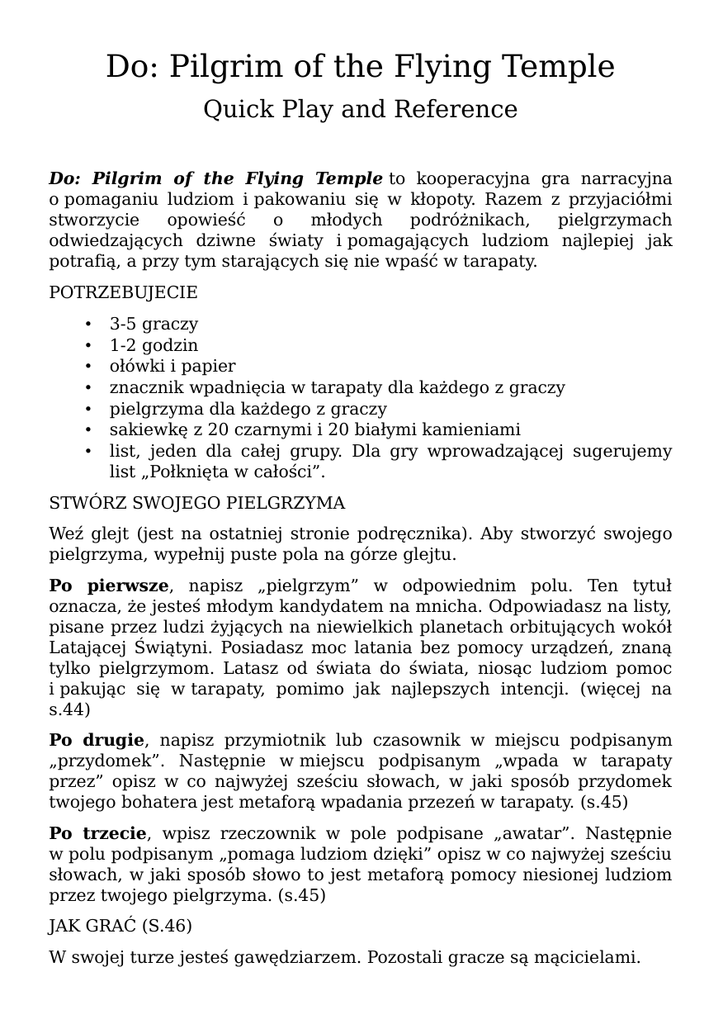 Do: Pilgrim of the Flying Temple Quick Play and Reference Do: Pilgrim of the Flying Temple to kooperacyjna gra narracyjna o pomaganiu ludziom i pakowaniu się w kłopoty. Razem z przyjaciółmi stworzycie opowieść o młodych podróżnikach, pielgrzymach odwiedzających dziwne światy i pomagających ludziom najlepiej jak potrafią, a przy tym starających się nie wpaść w tarapaty. POTRZEBUJECIE • • • • • • • 3-5 graczy 1-2 godzin ołówki i papier znacznik wpadnięcia w tarapaty dla każdego z graczy pielgrzyma dla każdego z graczy sakiewkę z 20 czarnymi i 20 białymi kamieniami list, jeden dla całej grupy. Dla gry wprowadzającej sugerujemy list „Połknięta w całości”. STWÓRZ SWOJEGO PIELGRZYMA Weź glejt (jest na ostatniej stronie podręcznika). Aby stworzyć swojego pielgrzyma, wypełnij puste pola na górze glejtu. Po pierwsze, napisz „pielgrzym” w odpowiednim polu. Ten tytuł oznacza, że jesteś młodym kandydatem na mnicha. Odpowiadasz na listy, pisane przez ludzi żyjących na niewielkich planetach orbitujących wokół Latającej Świątyni. Posiadasz moc latania bez pomocy urządzeń, znaną tylko pielgrzymom. Latasz od świata do świata, niosąc ludziom pomoc i pakując się w tarapaty, pomimo jak najlepszych intencji. (więcej na s.44) Po drugie, napisz przymiotnik lub czasownik w miejscu podpisanym „przydomek”. Następnie w miejscu podpisanym „wpada w tarapaty przez” opisz w co najwyżej sześciu słowach, w jaki sposób przydomek twojego bohatera jest metaforą wpadania przezeń w tarapaty. (s.45) Po trzecie, wpisz rzeczownik w pole podpisane „awatar”. Następnie w polu podpisanym „pomaga ludziom dzięki” opisz w co najwyżej sześciu słowach, w jaki sposób słowo to jest metaforą pomocy niesionej ludziom przez twojego pielgrzyma. (s.45) JAK GRAĆ (S.46) W swojej turze jesteś gawędziarzem. Pozostali gracze są mącicielami. Krok 1: Wyciągnij trzy kamienie i rozdziel je kolorami (s.47) Gawędziarz: Weź sakiewkę z kamieniami. Bez zaglądania do środka wyciągnij trzy kamienie. Pokaż je całej grupie. Rozdziel je kolorami. Krok 2: Wybierz białe lub czarne kamienie (s.47) Gawędziarz: Zatrzymaj białe lub czarne kamienie. Zostają u ciebie do końca gry. Pozostałe kamienie wrzuć z powrotem do sakiewki. Krok 3: Stwórz kolejny fragment opowieści (s.48) Gawędziarz: Zanotuj liczbę zatrzymanych kamieni i informację, czy twój pielgrzym jest w tarapatach, czy też nie. Jeśli nie jest w tarapatach i… …zatrzymałeś trzy kamienie. (s.49) Gawędziarz: Napisz zdanie o tym, jak twój pielgrzym komuś pomaga. Możesz użyć jednego słowa kluczowego. …zatrzymałeś dwa kamienie. (s.50) Gawędziarz: Napisz zdanie o tym, jak twój pielgrzym komuś pomaga. Możesz użyć jednego słowa kluczowego. Mąciciele: Napiszcie zdanie o tym, jak pielgrzym wpada w tarapaty. Możecie użyć jednego słowa kluczowego. Połóżcie gawędziarzowi znacznik tarapatów na jego glejcie. …zatrzymałeś jeden kamień. (s.52) Mąciciele: Napiszcie zdanie o tym, jak pielgrzym wpada w tarapaty. Możecie użyć jednego słowa kluczowego. Połóżcie gawędziarzowi znacznik tarapatów na jego glejcie. Gawędziarz: Napisz zdanie o tym jak twój pielgrzym wychodzi z kłopotów. Użycie słowa kluczowego się nie liczy. Usuń swój znacznik tarapatów. …zatrzymałeś zero kamieni. (s.54) Mąciciele: Napiszcie zdanie o tym, jak pielgrzym wpada w tarapaty. Możecie użyć jednego słowa kluczowego. Połóżcie gawędziarzowi znacznik tarapatów na jego glejcie. Jeśli jest w tarapatach i … ...zatrzymałeś trzy kamienie. (s.55) Gawędziarz: Napisz zdanie o swoim pielgrzymie wychodzącym z kłopotów. Użycie słowa kluczowego się nie liczy. Usuń swój znacznik tarapatów. …zatrzymałeś dwa kamienie. Gawędziarz: Napisz zdanie o swoim pielgrzymie wychodzącym z kłopotów. Użycie słowa kluczowego się nie liczy. Usuń swój znacznik tarapatów. Mąciciele: Napiszcie zdanie o tym, jak pielgrzym wpada w tarapaty. Możecie użyć jednego słowa kluczowego. Połóżcie ponownie znacznik tarapatów na glejcie pielgrzyma. …zatrzymałeś jeden kamień. (s.55) Gawędziarz: Napisz zdanie o swoim pielgrzymie wychodzącym z kłopotów. Użycie słowa kluczowego się nie liczy. Usuń swój znacznik tarapatów. ...zatrzymałeś zero kamieni. (s.58) Mąciciele: Napiszcie zdanie o tym, jak tarapaty stają się poważniejsze. Możecie użyć jednego słowa kluczowego. Znacznik tarapatów pozostaje na glejcie należącym do gawędziarza. Krok 4: Zakończ turę (s.59) Każdy: Jeśli skreślono wszystkie słowa kluczowe, przejdźcie do „Epilogu”. Jeśli wszyscy przy stole byli już gawędziarzami w tej rundzie, przejdźcie do „Zakończenia rundy”. W przeciwnym razie przekaż sakiewkę na lewo od siebie. Teraz ta osoba będzie gawędziarzem. Rozpoczyna swoja turę od Kroku 1. Zakończenie rundy Każdy: Jeśli ktokolwiek ma osiem lub więcej kamieni, przechodzicie do „Epilogu”. W przeciwnym razie rozpoczynacie kolejną rundę gry. Nowy gawędziarz zaczyna swoją turę od Kroku 1. EPILOG Krok 1: Każdy gracz kończy opowieść (s.60) Każdy: Jeśli wszystkie słowa kluczowe zostały skreślone, otrzymujecie zakończenie „z tarczą”. Napisz w dzienniku zdanie o docenieniu starań twojego pielgrzyma i wynagrodzeniu jego wysiłku. Nawet jeśli twój pielgrzym był w tarapatach pod koniec opowieści, wszystko idzie w zapomnienie. Jeśli chociaż jedno słowo kluczowe nie zostało skreślone, zakończenie jest „na tarczy”. Napisz w dzienniku zdanie o karze, jaka spotkała pielgrzyma i o wypędzeniu go za wtrącanie się w nie swoje sprawy. Nawet jeśli twój pielgrzym nie popadł w tarapaty w tej opowieści, odpowiada za współudział. Krok 2: Zaktualizuj punkty przeznaczenia swojego pielgrzyma (s.62) Każdy: Policz, ile zebrałeś czarnych i białych kamieni podczas opowieści. Za każdy czarny kamień zwiększ Ziemskie Przeznaczenie swoj