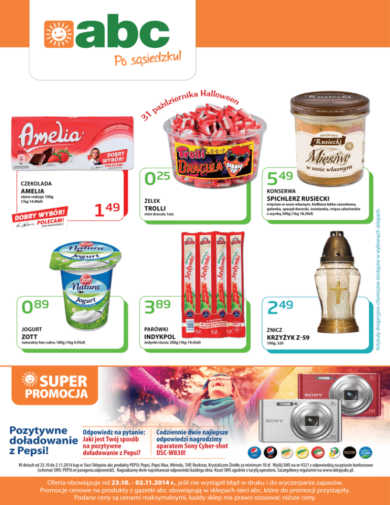 AMELIA różne rodzaje 100g (1kg 14,90zł) 1 89 49 25 KONSERWA ŻELEK TROLLI mini dracula 1szt. 3 2 89 PARÓWKI ZOTT INDYKPOL Pozytywne doładowanie z Pepsi! SPICHLERZ RUSIECKI mięsiwo w sosie własnym, kiełbasa lekko czosnkowa, golonka, specjał dworski, świeżonka, mięso szlacheckie z szynką 300g (1kg 18,30zł) JOGURT naturalny bez cukru 180g (1kg 4,95zł) 5 49 Jedynki classic 200g (1kg 19,45zł) Odpowiedz na pytanie: Jaki jest Twój sposób na pozytywne doładowanie z Pepsi? 49 ZNICZ KRZYŻYK Z-59 100g, 32h Codziennie dwie najlepsze odpowiedzi nagrodzimy aparatem Sony Cyber-shot DSC-W830! W dniach od 23.10 do 2.11.2014 kup w Sieci Sklepów abc produkty PEPSI: Pepsi, Pepsi Max, Mirinda, 7UP, Rockstar, Krystaliczne Źródło za minimum 10 zł. Wyślij SMS na nr 4321 z odpowiedzią na pytanie konkursowe (schemat SMS: PEPSI.nr paragonu.odpowiedź). Nagradzamy dwie najciekawsze odpowiedzi każdego dnia. Koszt SMS zgodnie z taryfą operatora. Szczegółowy regulamin na www.sklepyabc.pl. Oferta obowiązuje od 23.10. - 02.11.2014 r., jeśli nie wystąpił błąd w druku i do wyczerpania zapasów. Promocje cenowe na produkty z gazetki abc obowiązują w sklepach sieci abc, które do promocji przystapiły. Podane ceny są cenami maksymalnymi, każdy sklep ma prawo stosować niższe ceny. Artykuły drogeryjno-chemiczne dostępne w wybranych sklepach. 3 0 CZEKOLADA 0 1 a H l l o a w k i e n r e e n i z d ź pa