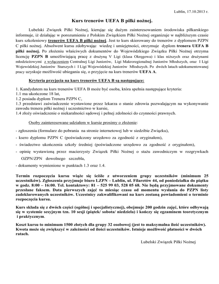 Lublin, 17.10.2013 r. Kurs trenerów UEFA B piłki nożnej. Lubelski Związek Piłki Nożnej, kierując się dużym zainteresowaniem środowiska piłkarskiego informuje, iż działając w porozumieniu z Polskim Związkiem Piłki Nożnej organizuje w najbliższym czasie kurs szkoleniowy trenerów UEFA B piłki nożnej. Jest to kurs skierowany do trenerów z dyplomem PZPN C piłki nożnej. Absolwent kursu zdobywając wiedzę i umiejętności, otrzymuje dyplom trenera UEFA B piłki nożnej. Po złożeniu właściwych dokumentów do Wojewódzkiego Związku Piłki Nożnej otrzyma licencję PZPN B umożliwiającą pracę z drużyną V Ligi (klasa Okręgowa) i klas niższych oraz drużynami młodzieżowymi z wyłączeniem Centralnej Ligi Juniorów, Ligi Makroregionalnej Juniorów Młodszych, oraz I Ligi Wojewódzkiej Juniorów Starszych i I Ligi Wojewódzkiej Juniorów Młodszych. Po dwóch latach udokumentowanej pracy uzyskuje możliwość ubiegania się, o przyjęcie na kurs trenerów UEFA A. Kryteria przyjęcia na kurs trenerów UEFA B są następujące: 1. Kandydatem na kurs trenerów UEFA B może być osoba, która spełnia następujące kryteria: 1.1 ma ukończone 18 lat, 1.2 posiada dyplom Trenera PZPN C, 1.3 przedstawi zaświadczenie wystawione przez lekarza o stanie zdrowia pozwalającym na wykonywanie zawodu trenera piłki nożnej i uczestnictwo w kursie, 1.4 złoży oświadczenie o niekaralności sądowej i pełnej zdolności do czynności prawnych. Osoby zainteresowane udziałem w kursie prosimy o złożenie: - zgłoszenia (formularz do pobrania na stronie internetowej lub w siedzibie Związku),xxxxxxxxxxxxxxxxxx - ksero dyplomu PZPN C (poświadczony urzędowo za zgodność z oryginałem), xxxxxxxxxxxxxxxxxxxx - świadectwo ukończenia szkoły średniej (poświadczone urzędowo za zgodność z oryginałem), xxxxx - opinię wystawioną przez macierzysty Związek Piłki Nożnej o stażu zawodniczym w rozgrywkach OZPN/ZPN dowolnego szczebla,xxxxxxxxxxxxxxxxxxxxxxxxxxxxxxxxxxxxxxxxxxxxxxxxxxxxxxxx - dokumenty wymienione w punktach 1.3 oraz 1.4. Termin rozpoczęcia kursu wiąże się ściśle z utworzeniem grupy uczestników (minimum 25 uczestników). Zgłoszenia przyjmuje biuro LZPN – Lublin, ul. Filaretów 44, od poniedziałku do piątku w godz. 8:00 – 16:00. Tel. kontaktowy: 81 – 525 99 03, 528 05 68. Nie będą przyjmowane dokumenty przesłane faksem. Data pierwszych zajęć to miesiąc czasu od momentu wysłania do PZPN listy zadeklarowanych uczestników. Uczestnicy zakwalifikowani na kurs zostaną powiadomieni o terminie rozpoczęcia kursu. Kurs składa się z dwóch części (ogólnej i specjalistycznej), obejmuje 200 godzin zajęć, które odbywają się w systemie sesyjnym tzn. 10 sesji (piątek/ sobota/ niedziela) i kończy się egzaminem teoretycznym i praktycznym. Koszt kursu to minimum 1500 złotych dla grupy 32 osobowej (jest to maksymalna ilość uczestników). Kwota może się zwiększyć w zależności od ilości uczestników. Istnieje możliwość płatności w dwóch ratach. Lubelski Związek Piłki Nożnej