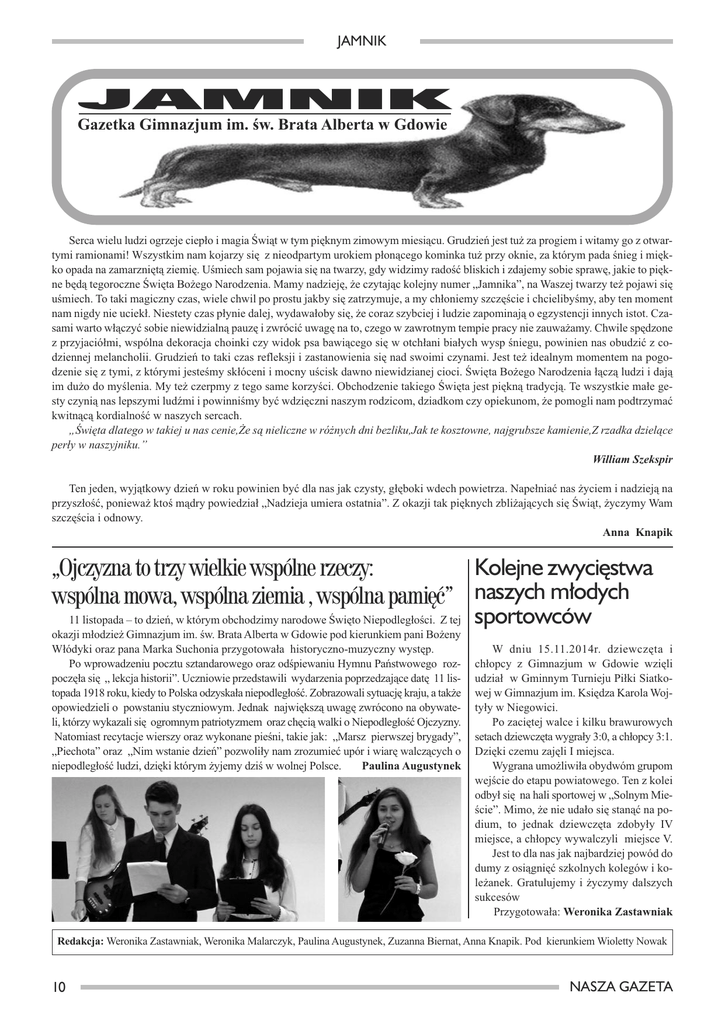 JAMNIK JAMNIK Gazetka Gimnazjum im. św. Brata Alberta w Gdowie Serca wielu ludzi ogrzeje ciepło i magia Świąt w tym pięknym zimowym miesiącu. Grudzień jest tuż za progiem i witamy go z otwartymi ramionami! Wszystkim nam kojarzy się z nieodpartym urokiem płonącego kominka tuż przy oknie, za którym pada śnieg i miękko opada na zamarzniętą ziemię. Uśmiech sam pojawia się na twarzy, gdy widzimy radość bliskich i zdajemy sobie sprawę, jakie to piękne będą tegoroczne Święta Bożego Narodzenia. Mamy nadzieję, że czytając kolejny numer „Jamnika”, na Waszej twarzy też pojawi się uśmiech. To taki magiczny czas, wiele chwil po prostu jakby się zatrzymuje, a my chłoniemy szczęście i chcielibyśmy, aby ten moment nam nigdy nie uciekł. Niestety czas płynie dalej, wydawałoby się, że coraz szybciej i ludzie zapominają o egzystencji innych istot. Czasami warto włączyć sobie niewidzialną pauzę i zwrócić uwagę na to, czego w zawrotnym tempie pracy nie zauważamy. Chwile spędzone z przyjaciółmi, wspólna dekoracja choinki czy widok psa bawiącego się w otchłani białych wysp śniegu, powinien nas obudzić z codziennej melancholii. Grudzień to taki czas refleksji i zastanowienia się nad swoimi czynami. Jest też idealnym momentem na pogodzenie się z tymi, z którymi jesteśmy skłóceni i mocny uścisk dawno niewidzianej cioci. Święta Bożego Narodzenia łączą ludzi i dają im dużo do myślenia. My też czerpmy z tego same korzyści. Obchodzenie takiego Święta jest piękną tradycją. Te wszystkie małe gesty czynią nas lepszymi ludźmi i powinniśmy być wdzięczni naszym rodzicom, dziadkom czy opiekunom, że pomogli nam podtrzymać kwitnącą kordialność w naszych sercach. „Święta dlatego w takiej u nas cenie,Że są nieliczne w różnych dni bezliku,Jak te kosztowne, najgrubsze kamienie,Z rzadka dzielące perły w naszyjniku.” William Szekspir Ten jeden, wyjątkowy dzień w roku powinien być dla nas jak czysty, głęboki wdech powietrza. Napełniać nas życiem i nadzieją na przyszłość, ponieważ ktoś mądry powiedział „Nadzieja umiera ostatnia”. Z okazji tak pięknych zbliżających się Świąt, życzymy Wam szczęścia i odnowy. Anna Knapik Kolejne zwycięstwa „Ojczyzna to trzy wielkie wspólne rzeczy: wspólna mowa, wspólna ziemia , wspólna pamięć” naszych młodych 11 listopada – to dzień, w którym obchodzimy narodowe Święto Niepodległości. Z tej sportowców okazji młodzież Gimnazjum im. św. Brata Alberta w Gdowie pod kierunkiem pani Bożeny Włódyki oraz pana Marka Suchonia przygotowała historyczno-muzyczny występ. Po wprowadzeniu pocztu sztandarowego oraz odśpiewaniu Hymnu Państwowego rozpoczęła się „ lekcja historii”. Uczniowie przedstawili wydarzenia poprzedzające datę 11 listopada 1918 roku, kiedy to Polska odzyskała niepodległość. Zobrazowali sytuację kraju, a także opowiedzieli o powstaniu styczniowym. Jednak największą uwagę zwrócono na obywateli, którzy wykazali się ogromnym patriotyzmem oraz chęcią walki o Niepodległość Ojczyzny. Natomiast recytacje wierszy oraz wykonane pieśni, takie jak: „Marsz pierwszej brygady”, „Piechota” oraz „Nim wstanie dzień” pozwoliły nam zrozumieć upór i wiarę walczących o niepodległość ludzi, dzięki którym żyjemy dziś w wolnej Polsce. Paulina Augustynek W dniu 15.11.2014r. dziewczęta i chłopcy z Gimnazjum w Gdowie wzięli udział w Gminnym Turnieju Piłki Siatkowej w Gimnazjum im. Księdza Karola Wojtyły w Niegowici. Po zaciętej walce i kilku brawurowych setach dziewczęta wygrały 3:0, a chłopcy 3:1. Dzięki czemu zajęli I miejsca. Wygrana umożliwiła obydwóm grupom wejście do etapu powiatowego. Ten z kolei odbył się na hali sportowej w „Solnym Mieście”. Mimo, że nie udało się stanąć na podium, to jednak dziewczęta zdobyły IV miejsce, a chłopcy wywalczyli miejsce V. Jest to dla nas jak najbardziej powód do dumy z osiągnięć szkolnych kolegów i koleżanek. Gratulujemy i życzymy dalszych sukcesów Przygotowała: Weronika Zastawniak Redakcja: Weronika Zastawniak, Weronika Malarczyk, Paulina Augustynek, Zuzanna Biernat, Anna Knapik. Pod kierunkiem Wioletty Nowak 10 NASZA GAZETA