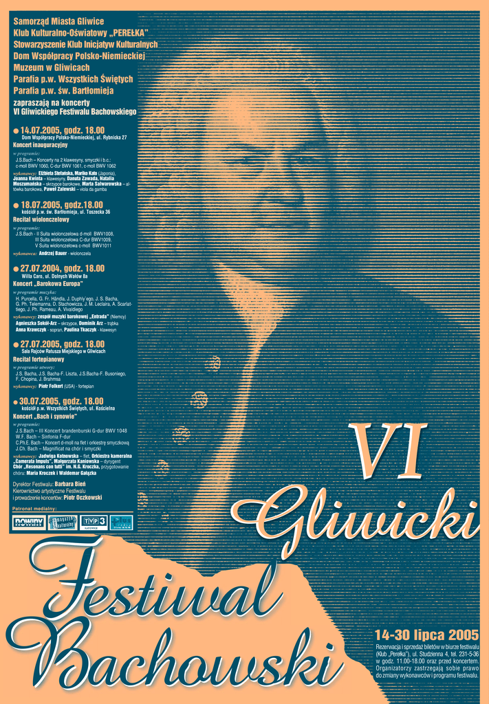 Samorz¹d Miasta Gliwice Klub Kulturalno-Oœwiatowy „PERE£KA” Stowarzyszenie Klub Inicjatyw Kulturalnych Dom Wspó³pracy Polsko-Niemieckiej Muzeum w Gliwicach Parafia p.w. Wszystkich Œwiêtych Parafia p.w. św. Bartłomieja zapraszaj¹ na koncerty VI Gliwickiego Festiwalu Bachowskiego 14.07.2005, godz. 18.00 Dom Wspó³pracy Polsko-Niemieckiej, ul. Rybnicka 27 Koncert inauguracyjny w programie: J.S.Bach – Koncerty na 2 klawesyny, smyczki i b.c.: c-moll BWV 1060, C-dur BWV 1061, c-moll BWV 1062 wykonawcy: Elżbieta Stefańska, Mariko Kato (Japonia), Joanna Kwinta – klawesyny, Danuta Zawada, Natalia Moszumańska – skrzypce barokowe, Marta Salwarowska – altówka barokowa, Paweł Zalewski – viola da gamba 18.07.2005, godz.18.00 kościół p.w. św. Bartłomieja, ul. Toszecka 36 Recital wiolonczelowy w programie: J.S.Bach - II Suita wiolonczelowa d-moll BWV1008, III Suita wiolonczelowa C-dur BWV1009, V Suita wiolonczelowa c-moll BWV1011 wykonawca: Andrzej Bauer - wiolonczela 27.07.2004, godz. 18.00 Willa Caro, ul. Dolnych Wałów 8a Koncert „Barokowa Europa” w programie muzyka: H. Purcella, G. Fr. Händla, J. Duphly`ego, J. S. Bacha, G. Ph. Telemanna, D. Stachowicza, J. M. Leclaira, A. Scarlattiego, J. Ph. Rameau, A. Vivaldiego wykonawcy: zespół muzyki barokowej „Entrada” (Niemcy) Agnieszka Sokół-Arz – skrzypce, Dominik Arz – trąbka Anna Krawczyk - sopran, Paulina Tkaczyk - klawesyn 27.07.2005, godz. 18.00 Sala Rajców Ratusza Miejskiego w Gliwicach Recital fortepianowy w programie utwory: J.S. Bacha, J.S. Bacha-F. Liszta, J.S.Bacha-F. Busoniego, F. Chopina, J. Brahmsa wykonawcy: Piotr Folkert (USA) - fortepian 30.07.2005, godz. 18.00 kościół p.w. Wszystkich Świętych, ul. Kościelna Koncert „Bach i synowie” w programie: J.S.Bach – III Koncert brandenburski G-dur BWV 1048 W.F. Bach – Sinfonia F-dur C.Ph.E. Bach – Koncert d-moll na flet i orkiestrę smyczkową J.Ch. Bach – Magnificat na chór i smyczki wykonawcy: Jadwiga Kotnowska – flet, Orkiestra kameralna „Camerata Impuls”, Małgorzata Kaniowska – dyrygent Chór „Resonans con tutti” im. N.G. Kroczka, przygotowanie chóru: Maria Kroczek i Waldemar Gałązka Dyrektor Festiwalu: Barbara Bieñ Kierownictwo artystyczne Festiwalu i prowadzenie koncertów: Piotr Oczkowski Patronat medialny: VI Gliwicki Festiwal Bachowski 14-30 lipca 2005 Rezerwacja i sprzeda¿ biletów w biurze festiwalu (Klub „Pere³ka”), ul. Studzienna 4, tel. 231-5-36 w godz. 11.00-18.00 oraz przed koncertem. Organizatorzy zastrzegaj¹ sobie prawo do zmiany wykonawców i programu festiwalu.
