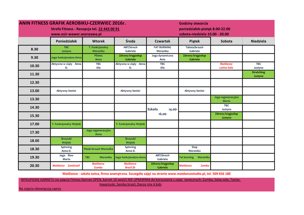 ANIN FITNESS GRAFIK AEROBIKU-CZERWIEC 2016r.