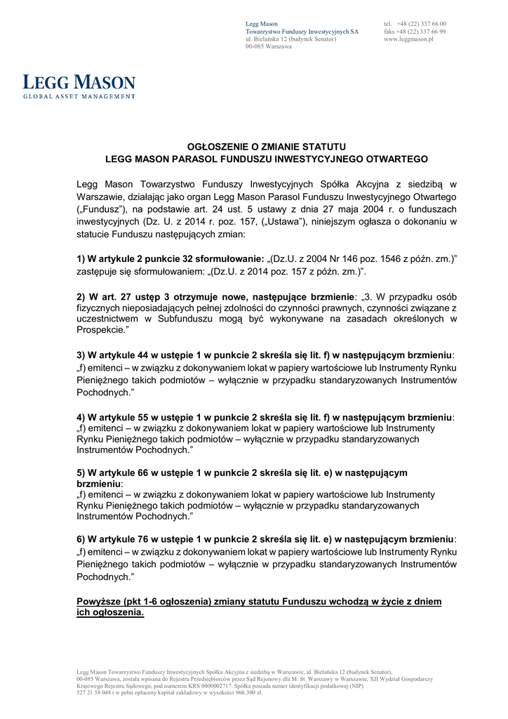 Legg Mason Towarzystwo Funduszy Inwestycyjnych SA ul. Bielańska 12 (budynek Senator) 00-085 Warszawa tel. +48 (22) 337 66 00 faks +48 (22) 337 66 99 www.leggmason.pl OGŁOSZENIE O ZMIANIE STATUTU LEGG MASON PARASOL FUNDUSZU INWESTYCYJNEGO OTWARTEGO Legg Mason Towarzystwo Funduszy Inwestycyjnych Spółka Akcyjna z siedzibą w Warszawie, działając jako organ Legg Mason Parasol Funduszu Inwestycyjnego Otwartego („Fundusz”), na podstawie art. 24 ust. 5 ustawy z dnia 27 maja 2004 r. o funduszach inwestycyjnych (Dz. U. z 2014 r. poz. 157, („Ustawa”), niniejszym ogłasza o dokonaniu w statucie Funduszu następujących zmian: 1) W artykule 2 punkcie 32 sformułowanie: „(Dz.U. z 2004 Nr 146 poz. 1546 z późn. zm.)” zastępuje się sformułowaniem: „(Dz.U. z 2014 poz. 157 z późn. zm.)”. 2) W art. 27 ustęp 3 otrzymuje nowe, następujące brzmienie: „3. W przypadku osób fizycznych nieposiadających pełnej zdolności do czynności prawnych, czynności związane z uczestnictwem w Subfunduszu mogą być wykonywane na zasadach określonych w Prospekcie.” 3) W artykule 44 w ustępie 1 w punkcie 2 skreśla się lit. f) w następującym brzmieniu: „f) emitenci – w związku z dokonywaniem lokat w papiery wartościowe lub Instrumenty Rynku Pieniężnego takich podmiotów – wyłącznie w przypadku standaryzowanych Instrumentów Pochodnych.” 4) W artykule 55 w ustępie 1 w punkcie 2 skreśla się lit. f) w następującym brzmieniu: „f) emitenci – w związku z dokonywaniem lokat w papiery wartościowe lub Instrumenty Rynku Pieniężnego takich podmiotów – wyłącznie w przypadku standaryzowanych Instrumentów Pochodnych.” 5) W artykule 66 w ustępie 1 w punkcie 2 skreśla się lit. e) w następującym brzmieniu: „f) emitenci – w związku z dokonywaniem lokat w papiery wartościowe lub Instrumenty Rynku Pieniężnego takich podmiotów – wyłącznie w przypadku standaryzowanych Instrumentów Pochodnych.” 6) W artykule 76 w ustępie 1 w punkcie 2 skreśla się lit. e) w następującym brzmieniu: „f) emitenci – w związku z dokonywaniem lokat w papiery wartościowe lub Instrumenty Rynku Pieniężnego takich podmiotów – wyłącznie w przypadku standaryzowanych Instrumentów Pochodnych.” Powyższe (pkt 1-6 ogłoszenia) zmiany statutu Funduszu wchodzą w życie z dniem ich ogłoszenia. Legg Mason Towarzystwo Funduszy Inwestycyjnych Spółka Akcyjna z siedzibą w Warszawie, ul. Bielańska 12 (budynek Senator), 00-085 Warszawa, została wpisana do Rejestru Przedsiębiorców przez Sąd Rejonowy dla M. St. Warszawy w Warszawie, XII Wydział Gospodarczy Krajowego Rejestru Sądowego, pod numerem KRS 0000002717. Spółka posiada numer identyfikacji podatkowej (NIP) 527 21 58 048 i w pełni opłacony kapitał zakładowy w wysokości 966.300 zł. 7) W artykule 43 w ustępie 2 punkt 1 otrzymuje nowe, następujące brzmienie: „1) papiery wartościowe emitowane, poręczone lub gwarantowane przez Skarb Państwa lub Narodowy Bank Polski, papiery wartościowe i Instrumenty Rynku Pieniężnego dopuszczone do obrotu na rynku regulowanym na terytorium Rzeczypospolitej Polskiej lub w Państwie Członkowskim, a także na następujących rynkach zorganizowanych w państwach należących do OECD: Australia - ASX, National Stock Exchange of Australia; Japonia - Tokyo Stock Exchange, Nagoya Stock Exchange; Republika Korei - Korea Stock Exchange; Meksyk - Mexican Stock Exchange; Nowa Zelandia - New Zealand Exchange; Szwajcaria - SIX Swiss Exchange, BX Berne Exchange; Turcja – Borsa Istanbul, Stany Zjednoczone Ameryki - New York Stock Exchange, Nasdaq Stock Market; Norwegia - Oslo Stock Exchange; Kanada - Toronto Stock Exchange; Islandia – Nasdaq OMX Iceland,” 8) W artykule 43 w ustępie 2 w punkcie 4 lit. d skreśla się pierwszy tiret w brzmieniu: „– emitent bądź gwarant emisji lub podmiot posiadający akcje lub udziały reprezentujące co najmniej 75% kapitału emitenta, posiada rating na poziomie inwestycyjnym nadany przez jedną z następujących agencji ratingowych: Moody’s, Fitch, Standard&Poor’s,”, 8) W artykule 44 w ustępie 1 punkt 3 otrzymuje nowe, następujące brzmienie: „3) umowy będą mieć za przedmiot Instrumenty Pochodne dopuszczone do obrotu na rynku regulowanym w Rzeczypospolitej Polskiej lub Państwie Członkowskim lub na następujących rynkach zorganizowanych w państwach należących do OECD: Australia ASX, National Stock Exchange of Australia; Japonia - Tokyo Stock Exchange, Nagoya Stock Exchange; Republika Korei - Korea Stock Exchange; Meksyk - Mexican Stock Exchange; Nowa Zelandia - New Zealand Exchange; Szwajcaria - SIX Swiss Exchange, BX Berne Exchange; Turcja – Borsa Istanbul, Stany Zjednoczone Ameryki - New York Stock Exchange, Nasdaq Stock Market, Norwegia - Oslo Stock Exchange; Kanada - Toronto Stock Exchange, Islandia – Nasdaq OMX Iceland,” 9) W artykule 45 w ustępie 1 w punkcie 2 po słowach „na poziomie inwestycyjnym” słowa „nadany przez co najmniej jedną z następujących agencji ratingowych: Moody’s, Fitch, Standard&Poor’s” skreśla się, 10) W artykule 51 w ustępie 1 w punkcie b, przed słowami „prowizje maklerskie” dodaje się słowo „podatki” i przecinek, 11) W artykule 51 ustęp 3 otrzymuje nowe, następujące brzmienie: „3. Koszty Funduszu będą bezpośrednio pokrywane przez Subfundusz lub niezwłocznie zwracane Towarzystwu, o ile zostały poniesione przez Towarzystwo do wysokości limitów określonych w ust. 2. Towarzystwo pokrywa wszystkie koszty i wydatki związane z działalnością Subfunduszu, niewymienione w ust. 1 lub 2 oraz w przypadku kosztów limitowanych nadwyżkę ponad ustalone zgodnie z ust. 2 wartości.” 12) W artykule 54 w ustępie 1 punkt 1 otrzymuje nowe, następujące brzmienie: „1) papiery wartościowe emitowane, poręczone lub gwarantowane przez Skarb Państwa lub Narodowy Bank Polski, papiery wartościowe i Instrumenty Rynku Pieniężnego dopuszczone do obr