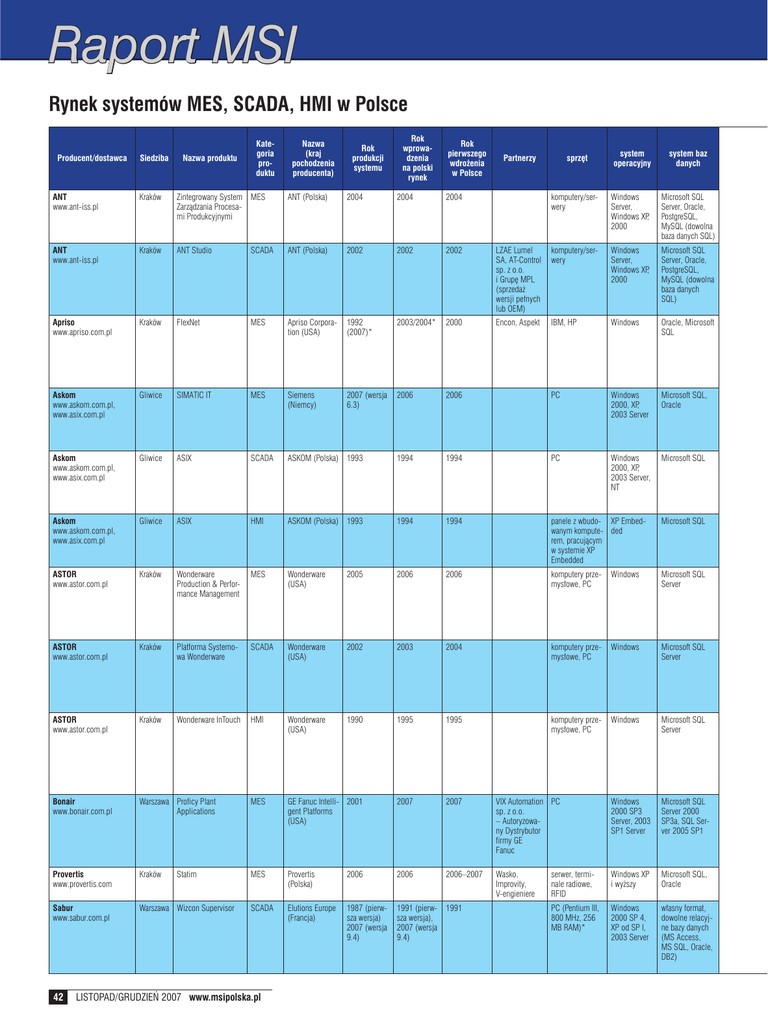 Raport MSI Rynek systemów MES, SCADA, HMI w Polsce Producent/dostawca Siedziba Nazwa produktu Kategoria produktu Nazwa (kraj pochodzenia producenta) Rok produkcji systemu Rok wprowadzenia na polski rynek Rok pierwszego wdrożenia w Polsce system operacyjny system baz danych komputery/serwery Windows Server, Windows XP, 2000 Microsoft SQL Server, Oracle, PostgreSQL, MySQL (dowolna baza danych SQL) Partnerzy sprzęt ANT www.ant-iss.pl Kraków Zintegrowany System Zarządzania Procesami Produkcyjnymi MES ANT (Polska) 2004 2004 2004 ANT www.ant-iss.pl Kraków ANT Studio SCADA ANT (Polska) 2002 2002 2002 LZAE Lumel SA, AT-Control sp. z o.o. i Grupę MPL (sprzedaż wersji pełnych lub OEM) komputery/serwery Windows Server, Windows XP, 2000 Microsoft SQL Server, Oracle, PostgreSQL, MySQL (dowolna baza danych SQL) Apriso www.apriso.com.pl Kraków FlexNet MES Apriso Corporation (USA) 1992 (2007)* 2003/2004* 2000 Encon, Aspekt IBM, HP Windows Oracle, Microsoft SQL Askom www.askom.com.pl, www.asix.com.pl Gliwice SIMATIC IT MES Siemens (Niemcy) 2007 (wersja 6.3) 2006 2006 PC Windows 2000, XP, 2003 Server Microsoft SQL, Oracle Askom www.askom.com.pl, www.asix.com.pl Gliwice ASIX SCADA ASKOM (Polska) 1993 1994 1994 PC Windows 2000, XP, 2003 Server, NT Microsoft SQL Askom www.askom.com.pl, www.asix.com.pl Gliwice ASIX HMI ASKOM (Polska) 1993 1994 1994 panele z wbudo- XP Embedwanym kompute- ded rem, pracującym w systemie XP Embedded Microsoft SQL ASTOR www.astor.com.pl Kraków Wonderware Production & Performance Management MES Wonderware (USA) 2005 2006 2006 komputery przemysłowe, PC Windows Microsoft SQL Server ASTOR www.astor.com.pl Kraków Platforma Systemowa Wonderware SCADA Wonderware (USA) 2002 2003 2004 komputery przemysłowe, PC Windows Microsoft SQL Server ASTOR www.astor.com.pl Kraków Wonderware InTouch HMI Wonderware (USA) 1990 1995 1995 komputery przemysłowe, PC Windows Microsoft SQL Server Bonair www.bonair.com.pl Warszawa Proficy Plant Applications MES GE Fanuc Intelli- 2001 gent Platforms (USA) 2007 2007 VIX Automation PC sp. z o.o. – Autoryzowany Dystrybutor firmy GE Fanuc Windows 2000 SP3 Server, 2003 SP1 Server Microsoft SQL Server 2000 SP3a, SQL Server 2005 SP1 Provertis www.provertis.com Kraków MES Provertis (Polska) 2006 2006 2006–2007 Wasko, Improvity, V-engieniere serwer, terminale radiowe, RFID Windows XP i wyższy Microsoft SQL, Oracle Sabur www.sabur.com.pl Warszawa Wizcon Supervisor SCADA Elutions Europe (Francja) 1987 (pierwsza wersja) 2007 (wersja 9.4) 1991 (pierwsza wersja), 2007 (wersja 9.4) 1991 PC (Pentium III, 800 MHz, 256 MB RAM)* Windows 2000 SP 4, XP od SP I, 2003 Server własny format, dowolne relacyjne bazy danych (MS Access, MS SQL, Oracle, DB2) 42 Statim LISTOPAD/GRUDZIEŃ 2007 www.msipolska.pl Rynek systemów MES, SCADA, HMI w Polsce język, w jakim napisano produkt Współpraca z innymi systemami Narzędzia/urządzenia współpracujące z systemem Liczba klientów w Polsce Przykłady wdrożeń systemu w Polsce Branża przemysłowa reprezentowana przez klientów C\C++, TCL\Tk, Java ERP: SAP, IFS, CDN (każdy system ERP, wymiana danych przez bazę SQL – ODBC, OPC, DDE, inne) terminale, skanery kodów kreskowych 10 TRI Poland (2005), spółki Fiat w Bielsku-Białej (2007) chemiczna (2), motoryzacyjna (6), spożywcza (2) C\C++, TCL\Tk, Java wymiana danych praktycznie z każdym oprogramowaniem przez interfejsy OPC, DDE, SQL-ODBC, TCOM oraz praktycznie każdym urządzeniem – ok. 30 zaimplementowanych protokołów, możliwość definiowania własnych protokołów przez użytkownika modemy systemu ANT GPRS, przeglądarki Internet Explorer, Mozilla, serwer telemetryczny systemu ANT GPRS 100 Browar Żywiec (2002), Browar Tychy (2003), El. Jaworzno II (2004), Fiat-GM Powertrain (2005), KOSD (2006) chemiczna (15), energetyczna (15), farmaceutyczna (5), metalurgiczna (10), motoryzacyjna (15), rafineryjno-petrochemiczna (5), spożywcza (15), wodno-kanalizacyjna (10), gazownictwo (10) .NET ERP: SAP R/3, Oracle Apps, JD Edwards, BPCS, MFG/Pro, Microsoft Dynamics AX – wymiana danych w zakresie produkcji, logistyki, kontroli jakości, utrzymania ruchu, dane postawowe zaawansowane planowanie i harmonogramowanie: SAP APO, i2, Preactor, SCADA, DCS; automatyka przemysłowa: Wonderware, GE Fanuc, Siemens, Rockwell, Honeywell itp. 8 Amica Wronki (2007, pierwszy etap); Essilor Laboratory Polska (2006/2007), British American Tobacco (2006), Valeo (2005); Novelis (2005), Hexal Polska (obecnie Lek SA, 2004); Cersanit Opoczno (2004) chemiczna, elektroniczna, energetyczna, farmaceutyczna, metalurgiczna, motoryzacyjna, papiernicza, drzewna, włókiennicza, spożywcza, zbrojeniowa, Mill Products – przetwórstwo (szkło, guma, plastik,drewno itp.) ERP: SAP (certyfikowane), QAD MFG/Pro SIMATIC, PCS7, SIMATIC BATCH, OPC Nutricia Zakłady Produkcyjne sp. z o.o. – dostawa systemu zarządzania produkcją i kontroli jakości LIMS (2006), zarządzanie wydajnością urządzeń OEE: genealogia i śledzenie produkcji, współpraca z systemem ERP (2007) chemiczna, farmaceutyczna, spożywcza C++, .NET OPC, Microsoft SQL kilkuset SGL Carbon Racibórz (2005–2006) – system monitoringu procesów Prasowni i Młynowni; Koksownia „Przyjaźń” sp. z o.o. (2005–2007) – system nadrzędny dla baterii nr 5 ceramiczna, chemiczna i celulozowa, energetyczna, gazownicza, górnicza, hutnicza, koksownicza, metalowa, samochodowa, spożywcza, szklarska, wodociągowa, gospodarka komunalna, budynki inteligentne C++, .NET OPC, Microsoft SQL kilkuset Elektrownia Blachownia (2005–2006) – stacjonarny system pomiaru wielkości emisji do powietrza; Elektrownia Turów SA (2005–2006) – rozbudowa systemu sterowania SUW o stację raportowo-archiwizującą ceramiczna, chemiczna i celulozowa, energetyczna, gazownicza, górnicza, hutnicza, koksownicza, metalowa, samochodowa, spożywcza, szklarska, wodociągowa, gosp. komunalna, budynki inteligentne .NET ERP: SAP, JD Edwards, Oracle, Microsoft Dynamics