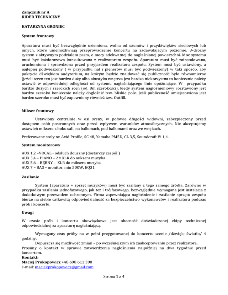 Załącznik nr A RIDER TECHNICZNY KATARZYNA GRONIEC System frontowy Aparatura musi być bezwzględnie uziemiona, wolna od szumów i przydźwięków sieciowych lub innych, które uniemożliwiają przeprowadzenie koncertu na zadawalającym poziomie. 3-drożny system z aktywnym podziałem pasm, o mocy adekwatnej do nagłaśnianej powierzchni. Moc systemu musi być każdorazowo konsultowana z realizatorem zespołu. Aparatura musi być zainstalowana, uruchomiona i sprawdzona przed przyjazdem realizatora zespołu. System musi być ustawiony, a najlepiej podwieszony ( w przypadku hal i plenerów musi być podwieszony) w taki sposób, aby pokrycie dźwiękiem audytorium, na którym będzie znajdować się publiczność było równomierne (jeżeli teren ten jest bardzo duży albo akustyka wnętrza jest bardzo niekorzystna to koniecznie należy ustawić w odpowiedniej odległości od systemu nagłaśniającego linie opóźniające. W przypadku bardzo dużych i szerokich scen (od. 8m szerokości), kiedy system nagłośnieniowy rozstawiony jest bardzo szeroko koniecznie należy dogłośnić tzw. bliskie pole. Jeśli publiczność umiejscowiona jest bardzo szeroko musi być zapewniony również tzw. Outfill. Mikser frontowy Ustawiony centralnie w osi sceny, w połowie długości widowni, zabezpieczony przed dostępem osób postronnych oraz przed wpływem warunków atmosferycznych. Nie akceptujemy ustawień miksera z boku sali, na balkonach, pod balkonami oraz we wnękach. Preferowane stoły to: Avid Profile, SC 48, Yamaha PM5D, CL 3,5, Soundcraft Vi 1,4. System monitorowy AUX 1,2 –VOCAL - odsłuch douszny (dostarczy zespół ) AUX 3,4 – PIANO – 2 x XLR do miksera muzyka AUX 5,6 – BĘBNY – XLR do miksera muzyka AUX 7 – BAS – monitor, min 500W, EQ31 Zasilanie System (aparatura + sprzęt muzyków) musi być zasilany z tego samego źródła. Zarówno w przypadku zasilania jednofazowego, jak też i trójfazowego, bezwzględnie wymagana jest instalacja z dodatkowym przewodem ochronnym. Firma zapewniająca nagłośnienie i zasilanie sprzętu zespołu bierze na siebie całkowitą odpowiedzialność za bezpieczeństwo wykonawców i realizatora podczas prób i koncertu. Uwagi W czasie prób i koncertu obowiązkowa jest obecność doświadczonej ekipy technicznej odpowiedzialnej za aparaturę nagłaśniającą. Wymagany czas próby na w pełni przygotowanej do koncertu scenie /dźwięk; światło/ 4 godziny. Dopuszcza się możliwość zmian – po wcześniejszym ich zaakceptowaniu przez realizatora. Prosimy o kontakt w sprawie zatwierdzenia nagłośnienia najpóźniej na dwa tygodnie przed koncertem. Kontakt: Maciej Prokopowicz +48 698 611 390 e-mail: [email protected] Strona 1 z 4 INPUT LISTA Mic/DI 1. N Instrument R Stopa 2. Werbel góra SHURE SM 57 3. Werbel dół SHURE SM 57 4. Werbel 2 SHURE SM 57 5. HH SHURE SM 81 6. Tom SHURE BETA 56 7. Oh L SHURE KSM 137 8. Oh P SHURE KSM 137 9. BAS XLR 10. Kontrabas XLR 11. NORD L DI BOX 12. NORD P DI BOX 13. VIRUS L DI BOX 14. VIRUS P DI BOX 15. VOCAL (mikrofon dostarczy zespół) 16. BGV Łukasz SHURE SM 58 17 BGV Tomek SHURE SM 58 18 BGV Sobol SHURE SM 58 19 VOCAL Y Sygnał rozszyty z kanału 15 20 Konferansjer bezprzewód 21 Talkback SHURE SM 58 22 LAPTOP L DI BOX (przy stanowisku FOH) 23 LAPTOP P DI BOX ELECTRO-VOICE N/D868 Strona 2 z 4 Strona 3 z 4 Oświetlenie stół mikserski, TYLKO z 20 kanałami suwakowymi! proszę o ustawienie stołu mikserskiego według kolejności: BIAŁY 1. 2. 3. 4. 5. 6. biały Kasia (stojąca) - profil po prawej stronie sceny! KONTRA biała Kasia - profil, tył prawa strona KONTRA biała Kasia - ruchoma głowa biały klawisze - profil przód biały bas - profil przód biały perkusja - profil przód KONTRY: 7. biały klawisze - głowa, wash, profil 8. biały bas - głowa, wash, profil 9. biały perkusja - głowa, wash, profil 10. niebieski klawisze 11. niebieski bas 12. niebieski perkusja 13. czerwony klawisze 14. czerwony bas 15. czerwony perkusja 16. scena 1 17. scena 2 18. scena 3 19. UKŁONY 20.DYM !!! koniecznie! proszę by na godzinę ustaloną między ośrodkiem a managerem za czas rozpoczęcia próby, wszystkie powyższe ustalenia zostały już przygotowane. czas przyjazdu zespołu na próbę to moment nagłośnienia zespołu i solistki, oraz ustawienie szczegółowe i ukierunkowanie światła wszelkie zmiany projekcji światła i rzutnika są ustalane telefonicznie z managerem zespołu Kontakt: Magdalena Falkowska OŚWIETLENIE, MANAGER GSM: +48 502 532 490 e-mail: [email protected] Scena ciemne okotarowanie, bez elementów scenografii, ekran jako tło sceny MINIMUM 4x3 metra stolik okrągły, czarny, przy mikrofonie Solisty po prawej stronie patrząc od widowni rzutnik z możliwością podłączenia przy stole do realizacji światła - VGA, lub HDMI WYŁĄCZNIE!!!! żaden inny kabel nie jest akceptowany, długość sugerowana kabla min. 35 metrów! Strona 4 z 4