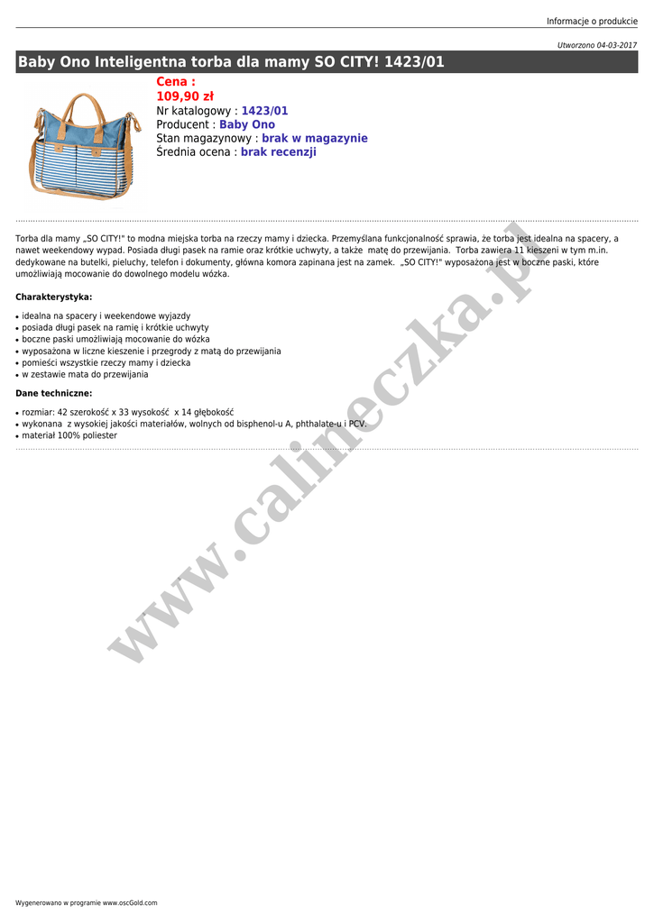 Informacje o produkcie Utworzono 04-03-2017 Baby Ono Inteligentna torba dla mamy SO CITY! 1423/01 Cena : 109,90 zł Nr katalogowy : 1423/01 Producent : Baby Ono Stan magazynowy : brak w magazynie Średnia ocena : brak recenzji pl Torba dla mamy „SO CITY!" to modna miejska torba na rzeczy mamy i dziecka. Przemyślana funkcjonalność sprawia, że torba jest idealna na spacery, a nawet weekendowy wypad. Posiada długi pasek na ramie oraz krótkie uchwyty, a także matę do przewijania. Torba zawiera 11 kieszeni w tym m.in. dedykowane na butelki, pieluchy, telefon i dokumenty, główna komora zapinana jest na zamek. „SO CITY!" wyposażona jest w boczne paski, które umożliwiają mocowanie do dowolnego modelu wózka. ● ● ● ● ● idealna na spacery i weekendowe wyjazdy posiada długi pasek na ramię i krótkie uchwyty boczne paski umożliwiają mocowanie do wózka wyposażona w liczne kieszenie i przegrody z matą do przewijania pomieści wszystkie rzeczy mamy i dziecka w zestawie mata do przewijania ec ● Dane techniczne: ● ● rozmiar: 42 szerokość x 33 wysokość x 14 głębokość wykonana z wysokiej jakości materiałów, wolnych od bisphenol-u A, phthalate-u i PCV. materiał 100% poliester w w w .c al in ● zk a. Charakterystyka: Wygenerowano w programie www.oscGold.com