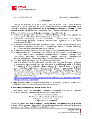 IGM-ZP.272.116.2013.AZ Lublin, dnia 13 listopada 2013 r. ZAPROSZENIE Działając na podstawie art. 4 pkt 8 ustawy z dnia 29 stycznia 2004 r. Prawo zamówień publicznych (t. j. Dz. U. 2013r. poz. 907 z poźn. zm.) Powiat Lubelski zaprasza do złoŜenia oferty cenowej na realizację usługi polegającej na przeprowadzeniu szkolenia z zakresu Trening zastępowania agresji dla 1 osoby – pracownika Domu Pomocy Społecznej w Matczynie. Zakres przedmiotu umowy obejmuje następujące warunki realizacji: 1) Wykonawca przeprowadzi szkolenie z zakresu: Trening zastępowania agresji dla 1 osoby – pracownika Domu Pomocy Społecznej w Matczynie, 2) Wykonawca zobowiązany jest do opracowania i przedstawienia harmonogramu i szczegółowego programu szkolenia Zamawiającemu najpóźniej na 2 dni przed rozpoczęciem szkolenia; 3) Wykonawca umoŜliwi ewentualne wizytowanie zajęć i przeprowadzenie kontroli przez przedstawicieli Instytucji Realizującej – Regionalnego Ośrodka Polityki Społecznej w Lublinie w zakresie prawidłowej realizacji Projektu; 4) Wykonawca zapewni wykwalifikowanych trenerów do przeprowadzenia szkolenia; 5) Wykonawca opracuje i zapewni materiały szkoleniowe dla uczestnika, w tym drukowane i cyfrowe, odpowiadające zakresowi merytorycznemu programowi szkolenia oraz 1 egzemplarz materiałów szkoleniowych zostanie przekaŜe Zamawiającemu do celów archiwalnych. Za druk materiałów odpowiedzialny będzie Wykonawca; 6) Uczestnik szkolenia otrzyma certyfikat ukończenia szkolenia; 7) Materiały szkoleniowe, listy obecności, certyfikat oraz wszystkie dokumenty związane ze szkoleniem muszą zostać opatrzone informacją o współfinansowaniu ze środków Programu pn. „Poprawa jakości usług świadczonych w domach pomocy społecznej oraz placówkach opiekuńczo-wychowawczych” obszaru tematycznego Ochrona Zdrowia ze środków Szwajcarsko-Polskiego Programu Współpracy (zgodnie z wytycznymi zawartymi w dokumencie pn.: „Szwajcarsko-Polski Program Współpracy Informacja i promocja Wytyczne dla beneficjentów” wraz z załącznikami znajdującego się pod adresem internetowym: http://www.programszwajcarski.gov.pl/dokumenty/wytyczne_info_promo/Documents/Inf ormacja_promocja_wytyczne.pdf) 3. Okres realizacji usługi: od dnia podpisania umowy z Wykonawcą do dnia 31 grudnia 2013r. (dokładny termin szkolenia zostanie ustalony po podpisaniu umowy). 4. Sposób przygotowania oferty, miejsce złoŜenia oferty: Ofertę naleŜy złoŜyć na załączonym Formularzu ofertowym określonym w załączniku nr 1 w formie papierowej w zamkniętej kopercie na adres Zamawiającego: Starostwo Powiatowe w Lublinie Wydział Inwestycji i Funduszy Pomocowych Referat ds. zamówień publicznych ul. Spokojna 9, 20-074 Lublin z dopiskiem „Oferta na realizację szkolenia z zakresu Trening zastępowania agresji w ramach projektu „WyŜszy standard – lepsza jakość w Domu Pomocy Społecznej w Matczynie” (z dopiskiem „nie otwierać przed dniem 15.11.2013r. przed godziną: 11:15). 1 Ponadto kopertę naleŜy oznaczyć nazwą i adresem Wykonawcy. Ofertę naleŜy złoŜyć do dnia 15 listopada 2013 r. do godziny: 11:00 w Starostwie Powiatowym w Lublinie, ul. Spokojna 9A, 20-074 Lublin, lewa oficyna, pokój: 102. 5. Miejsce, termin i sposób otwarcia ofert: Otwarcie złoŜonych ofert nastąpi w dniu 15 listopada 2013r. o godzinie: 11:15 w budynku Starostwa Powiatowego w Lublinie przy ul. Spokojnej 9, lewa oficyna, pokój: 102. Oferty złoŜone po terminie będą Wykonawcy niezwłocznie zwracane. 6. Kryteria oceny ofert: Zamawiający oceni ofertę wg kryterium ceny brutto. Cena oferty brutto - 100 % Oferty będą ocenianie w systemie punktowym. Sposób oceny wg wzoru: Z = (Cn : Cb) x Wc gdzie: Cn - cena najniŜsza, Cb – cena badana, Wc – waga kryterium ceny. JeŜeli w niniejszym postępowaniu nie moŜna będzie dokonać wyboru oferty najkorzystniejszej ze względu na to, Ŝe zostały złoŜone oferty o takiej samej cenie lub cena oferty najkorzystniejszej przekracza wartość środków przeznaczonych na realizację zamówienia, Zamawiający zastrzega sobie moŜliwość negocjacji cen. 7. Wykonawca zostanie powiadomiony faksem o rozstrzygnięciu Zamawiającego. 8. Szczegółowe warunki realizacji zamówienia określa wzór umowy stanowiący załącznik nr 2 do niniejszego zaproszenia. 9. Osobami upowaŜnionymi ze strony Zamawiającego do kontaktowania się z Wykonawcą są: - w zakresie przedmiotu zamówienia: Marta Jarzyna-Walczak (Dom Pomocy Społecznej w Matczynie), tel. 081/ 517 22 61 wew. 28. - sprawy formalno-prawne: Anna Zawiślak (Starostwo Powiatowe w Lublinie, Wydział Inwestycji i Funduszy Pomocowych), tel. 81/ 528 86 63. Starosta Lubelski /-/Paweł Pikula Załączniki: 1) formularz ofertowy, 2) wzór umowy. 2