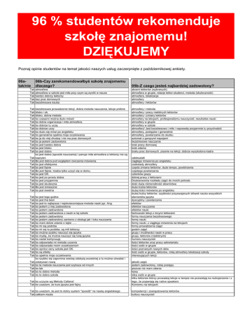 96 % studentów rekomenduje szkołę znajomemu! DZIĘKUJEMY Poznaj opinie studentów na temat jakości naszych usług zaczerpnięte z październikowej ankiety. 06atak/nie 06b-Czy zarekomendowałbyś szkołę znajomemu dlaczego? 05b-Z czego jesteś najbardziej zadowolony? Tak Tak Tak Tak Tak atmosfera atmosfera w szkole jest miła przy czym są wyniki w nauce bardzo dobrzy lektorzy bez prac domowych bezstresowa nauka akcent lektorów (wybranych) atmosfera w grupie, relacje lektor-studenci, metoda (skuteczność) atmosfera, lokalizacja atmosfery atmosfery i lektorów Tak Tak Tak Tak Tak Tak Tak Tak Tak Tak Tak Tak Tak Tak bezstresowe prowadzenie lekcji, dobra metoda nauczania, lekcje próbne blisko i ok. blisko, dobra metoda bo czasami moŜna duŜo mówić bo dobra organizacja i miła atmosfera. bo dobrze tu uczą bo dobrze uczy bo duŜo się mówi po angielsku bo generalnie spełnia moje oczekiwania bo ja do niej chodzę i nie ma prac domowych bo ja jestem zadowolona bo jest bardzo dobra bo jest blisko bo jest dobra bo jest dobra (sposób nauczania) i panuje miła atmosfera a lektorzy nie są kapryśni Bo jest dobra pod względem ćwiczenia mówienia. bo jest efektywna bo jest fajnie Bo jest fajnie, trzeba tylko uczyć się w domu. bo jest OK. bo jest po prostu dobra bo jest przyjemnie bo jest skuteczna Bo jest śmiesznie bo jest świetna atmosfery i metoda atmosfery i pracy niektórych lektorów atmosfery i zmiany lektorów atmosfery na lekcjach, profesjonalizmu nauczycieli, rezultatów nauki atmosfery w grupie atmosfery w szkole atmosfery! Jest bezstresowo i miło i naprawdę przyjemnie tu przychodzić atmosfery, postępów i generalnie atmosfery, powtarzania do skutku automat z gorącymi napojami bezstresowe nauczanie brak pracy domowej brak zdania braku prac domowych, pisanie na lekcji, dobrze wyszkolona kadra Tak Tak Tak Tak Tak Tak Tak Tak Tak Tak Tak Tak Tak Tak Tak Tak Tak Tak Tak Tak Tak Tak Tak Tak Tak Tak Tak Tak Tak Tak Tak Tak Tak Tak Tak bo jest tego godna bo jest the best bo jest to najlepsza i najskuteczniejsza metoda nauki jęz. Ang. bo jestem z niej zadowolona bo jestem zadowolona bo jestem zadowolona z nauki w tej szkole bo jestem zadowolony bo jestem zadowolony zarówno z obsługi jak i toku nauczania bo mam dobre zdanie o tejŜe ….. bo mi się podoba bo mi się tu podoba, są mili lektorzy bo moŜna szybko nauczyć się języka bo myślę, Ŝe moŜna nauczyć się tutaj języka bo nadal kontynuuję bo odpowiada mi metoda uczenia bo odpowiada moim oczekiwaniom bo oprócz ceny szkoła jest OK. bo są efekty bo spełnia moje oczekiwania bo szybko się zapomina wiedzę zdobytą wcześniej a tu moŜna utrwalać i zdobywać nową bo ta metoda nauczania jest szybsza od innych bo tak bo to dobra metoda bo to dobra szkoła całokształt ciągłego mówienia po angielsku czekolady atmosfery częsta zmiana lektorów, duŜe tempo, powtórzenia częstego powtarzania członków grupy dobrej pracy z lektorami Dostosowania rozkładu zajęć do moich potrzeb. dość duŜa róŜnorodność słownictwa duŜa liczba lektorów duŜej ilości mówienia po angielsku duŜej liczby lektorów, szybkości przyswajanych słówek nauka wszystkich elementów języka dyscypliny i powtarzania efektów efektów nauczania efektów nauki fachowość lekcji z innymi lektorami formy nauczania bezstresowego formy nauki formy nauki, z ciągłego mówienia na lekcjach formy prowadzenia zajęć godzin zajęć grupy i moŜliwości nauki w pracy grupy, lektorów (niektórych) humoru nauczycieli ilości lektorów oraz pracy sekretariatu ilości osób w grupie ilości poznanych nowych słów ilość osób w grupie, lektorów, milej atmosfery lokalizacji szkoły interesujących lekcji Tak bo uczycie wg Metody Callana! Tak bo uwaŜam, ze kurs języka jest fajny jakość zajęć jestem zadowolony, robię postępy jeszcze nie mam zdania kawy kilka osób w grupie kilku lektorów którzy prowadzą lekcje w tempie nie pozwalają na rozkojarzenie i z tego, Ŝe pojawiają się native speakers Komizmu na lekcjach Tak bo uwaŜam, Ŝe jest to dobry system "sposób" na naukę angielskiego Tak całkiem niezła kompetencji i zaangaŜowania lektorów kultury nauczycieli Tak Tak Tak Tak Tak Tak Tak Tak Tak Tak Tak Tak Tak Tak Tak Tak Tak Tak Tak Tak Tak Tak ciekawa metoda ciekawy sposób nauki języka ciekawy sposób prowadzenia zajęć ciekawy tryb nauczania dlaczego nie, jest ok. dobra atmosfera, dobra kadra dobra i ciekawa forma nauki dobra metoda dobra metoda nauczania, przyjemna atmosfera dobra metoda, tanio, dobre godziny lekcji i system płatności dobrze się tu czuję dobrze uczą duŜo moŜe nauczyć się w krótkim czasie duŜo mówi się po angielsku duŜo mówienia dziewięć osób dzięki mnie uczęszcza do tej szkoły EBW gwarantuje szybki sukces w rozumieniu języka mówionego oraz przełamuje bariery w mówieniu efekty nauki efektywnie wykorzystuje się czas, szybko uczy się języka fajna metoda fajnie jest fajnie się tu uczy Tak Tak Tak Tak forma nauki j. angielskiego tą metodą jest godna polecenia gdyŜ moŜna w szybki sposób posługiwać się j. ang. gwarantuje osiągnięcie wyników inna metoda jak ktoś nie ma podstaw, to bardzo dobra szkoła lub jak ktoś ma bariry w Tak mówieniu Tak jest bardzo dobra lekcje są prowadzone ciekawie, lektorzy mają dobry kontakt, sekretariat jest obsługiwany profesjonalnie lekcje w soboty lekcji lektorek:) lektorów lektorów i grupy lektorów metody lektorów z którymi miałem zajęcia. Ogólnie fajnie lektorów, którzy pomogą nam się nauczyć (tłumaczą) itp.. lektorów, którzy prowadzą z nami zajęcia lektorów, nie ma lekcji domowych lektorów, obsługi w recepcji lektorów, sposobu nauki lektorów, tempo pracy lektorów, z warunków pracy Lektorzy są OK. Miła atmosfera w grupie. Brak stresu lektorzy, metoda lektorzy, miła atmosfera lokalizacja lokalizacji lokalizacji szkoły lokalizacji szkoły i miarę z cen w niej panujących lokalizacji, ceny, ofe