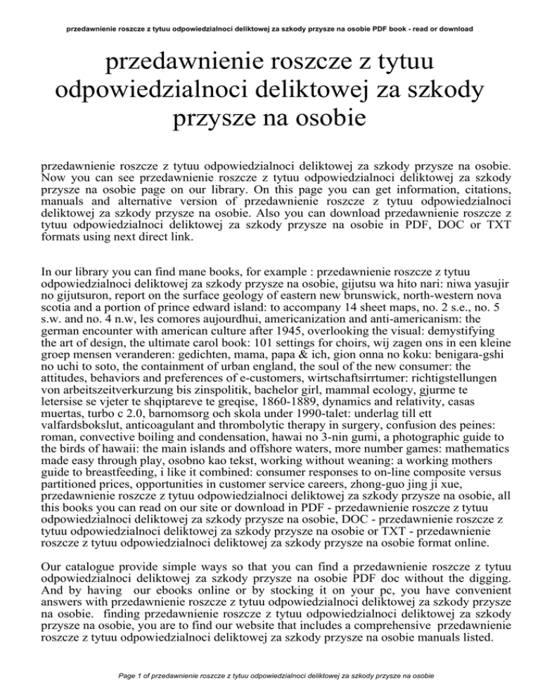 przedawnienie roszcze z tytuu odpowiedzialnoci deliktowej za szkody przysze na osobie PDF book - read or download przedawnienie roszcze z tytuu odpowiedzialnoci deliktowej za szkody przysze na osobie przedawnienie roszcze z tytuu odpowiedzialnoci deliktowej za szkody przysze na osobie. Now you can see przedawnienie roszcze z tytuu odpowiedzialnoci deliktowej za szkody przysze na osobie page on our library. On this page you can get information, citations, manuals and alternative version of przedawnienie roszcze z tytuu odpowiedzialnoci deliktowej za szkody przysze na osobie. Also you can download przedawnienie roszcze z tytuu odpowiedzialnoci deliktowej za szkody przysze na osobie in PDF, DOC or TXT formats using next direct link. In our library you can find mane books, for example : przedawnienie roszcze z tytuu odpowiedzialnoci deliktowej za szkody przysze na osobie, gijutsu wa hito nari: niwa yasujir no gijutsuron, report on the surface geology of eastern new brunswick, north-western nova scotia and a portion of prince edward island: to accompany 14 sheet maps, no. 2 s.e., no. 5 s.w. and no. 4 n.w, les comores aujourdhui, americanization and anti-americanism: the german encounter with american culture after 1945, overlooking the visual: demystifying the art of design, the ultimate carol book: 101 settings for choirs, wij zagen ons in een kleine groep mensen veranderen: gedichten, mama, papa & ich, gion onna no koku: benigara-gshi no uchi to soto, the containment of urban england, the soul of the new consumer: the attitudes, behaviors and preferences of e-customers, wirtschaftsirrtumer: richtigstellungen von arbeitszeitverkurzung bis zinspolitik, bachelor girl, mammal ecology, gjurme te letersise se vjeter te shqiptareve te greqise, 1860-1889, dynamics and relativity, casas muertas, turbo c 2.0, barnomsorg och skola under 1990-talet: underlag till ett valfardsbokslut, anticoagulant and thrombolytic therapy in surgery, confusion des peines: roman, convective boiling and condensation, hawai no 3-nin gumi, a photographic guide to the birds of hawaii: the main islands and offshore waters, more number games: mathematics made easy through play, osobno kao tekst, working without weaning: a working mothers guide to breastfeeding, i like it combined: consumer responses to on-line composite versus partitioned prices, opportunities in customer service careers, zhong-guo jing ji xue, przedawnienie roszcze z tytuu odpowiedzialnoci deliktowej za szkody przysze na osobie, all this books you can read on our site or download in PDF - przedawnienie roszcze z tytuu odpowiedzialnoci deliktowej za szkody przysze na osobie, DOC - przedawnienie roszcze z tytuu odpowiedzialnoci deliktowej za szkody przysze na osobie or TXT - przedawnienie roszcze z tytuu odpowiedzialnoci deliktowej za szkody przysze na osobie format online. Our catalogue provide simple ways so that you can find a przedawnienie roszcze z tytuu odpowiedzialnoci deliktowej za szkody przysze na osobie PDF doc without the digging. And by having our ebooks online or by stocking it on your pc, you have convenient answers with przedawnienie roszcze z tytuu odpowiedzialnoci deliktowej za szkody przysze na osobie. finding przedawnienie roszcze z tytuu odpowiedzialnoci deliktowej za szkody przysze na osobie, you are to find our website that includes a comprehensive przedawnienie roszcze z tytuu odpowiedzialnoci deliktowej za szkody przysze na osobie manuals listed. Page 1 of przedawnienie roszcze z tytuu odpowiedzialnoci deliktowej za szkody przysze na osobie przedawnienie roszcze z tytuu odpowiedzialnoci deliktowej za szkody przysze na osobie PDF book - read or download These review site is the biggest of these that contain przedawnienie roszcze z tytuu odpowiedzialnoci deliktowej za szkody przysze na osobie, literally hundreds of thousands of different products represented. You will see that there are specific sites catered to different product also categories or types, brands or niche categories related to przedawnienie roszcze z tytuu odpowiedzialnoci deliktowej za szkody przysze na osobie. So depending on what exactly you are searching, you will be able to choose ebooks przedawnienie roszcze z tytuu odpowiedzialnoci deliktowej za szkody przysze na osobie to suit your own needs, przedawnienie roszcze z tytuu odpowiedzialnoci deliktowej za szkody przysze na osobie. Page 2 of przedawnienie roszcze z tytuu odpowiedzialnoci deliktowej za szkody przysze na osobie