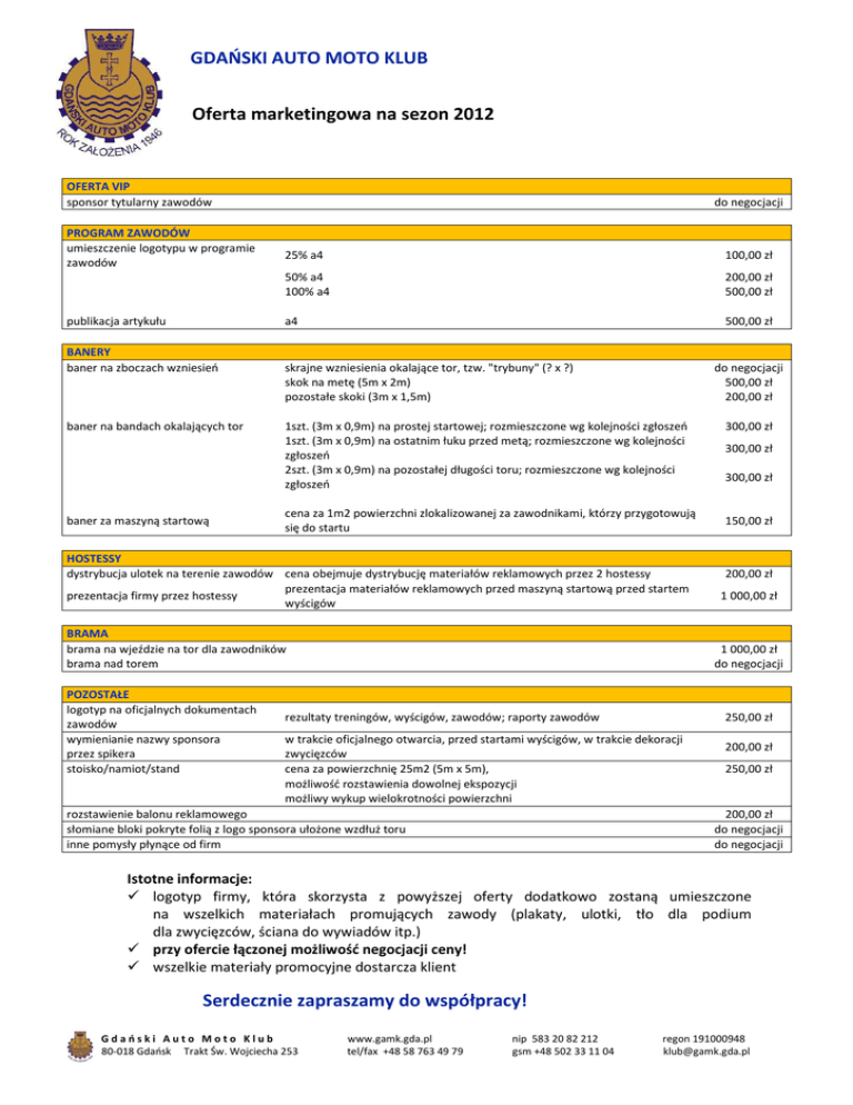 GDAŃSKI AUTO MOTO KLUB Oferta marketingowa na sezon 2012